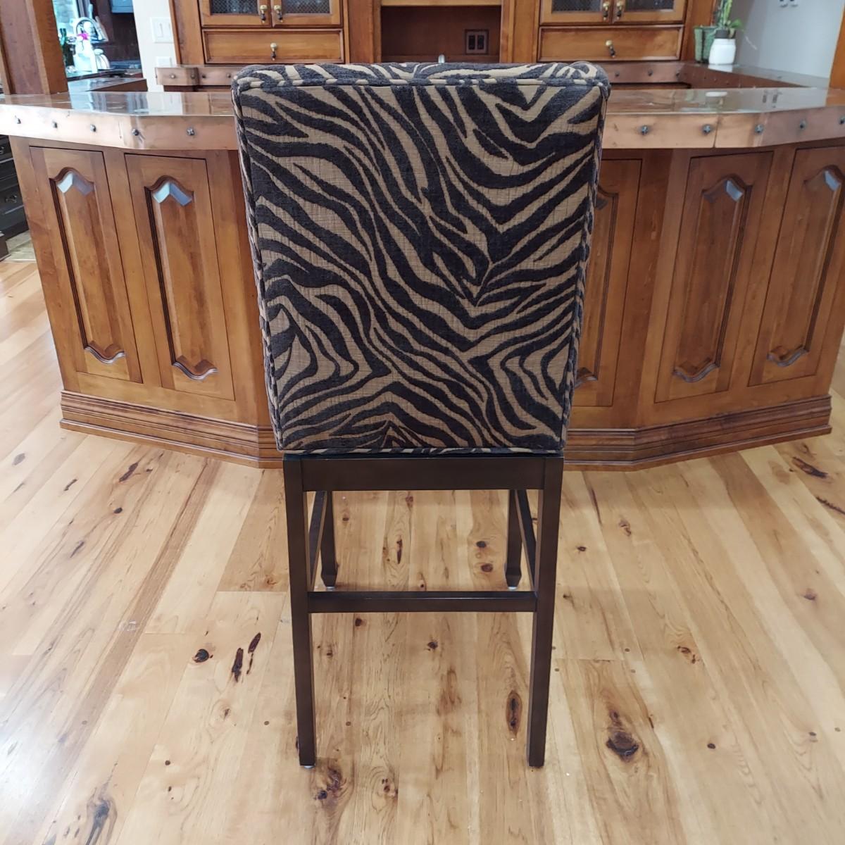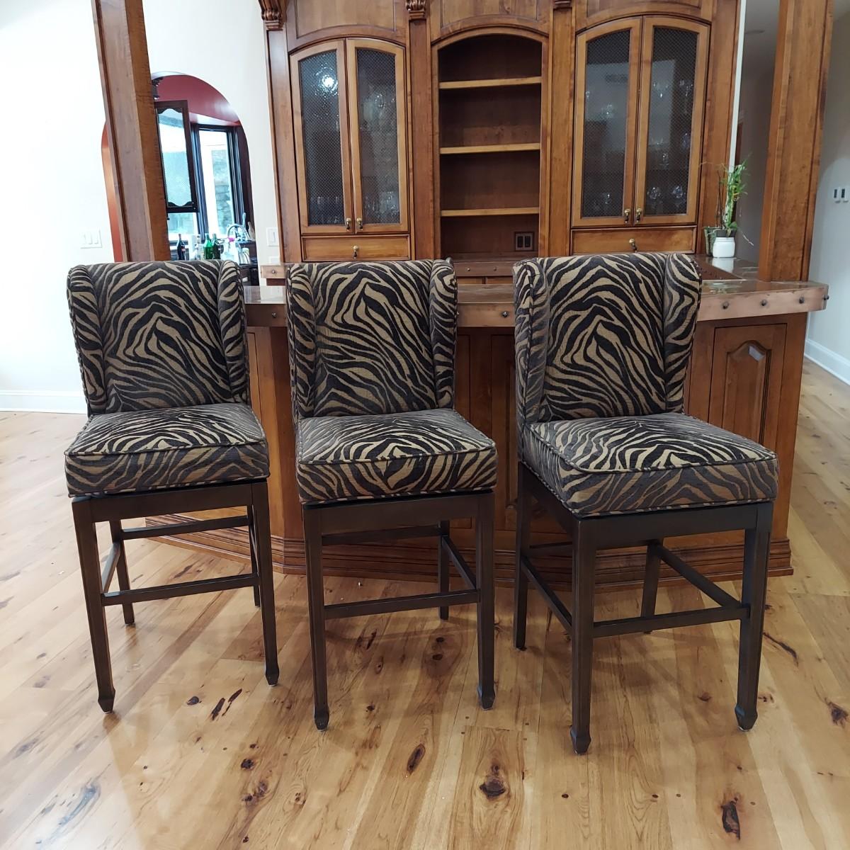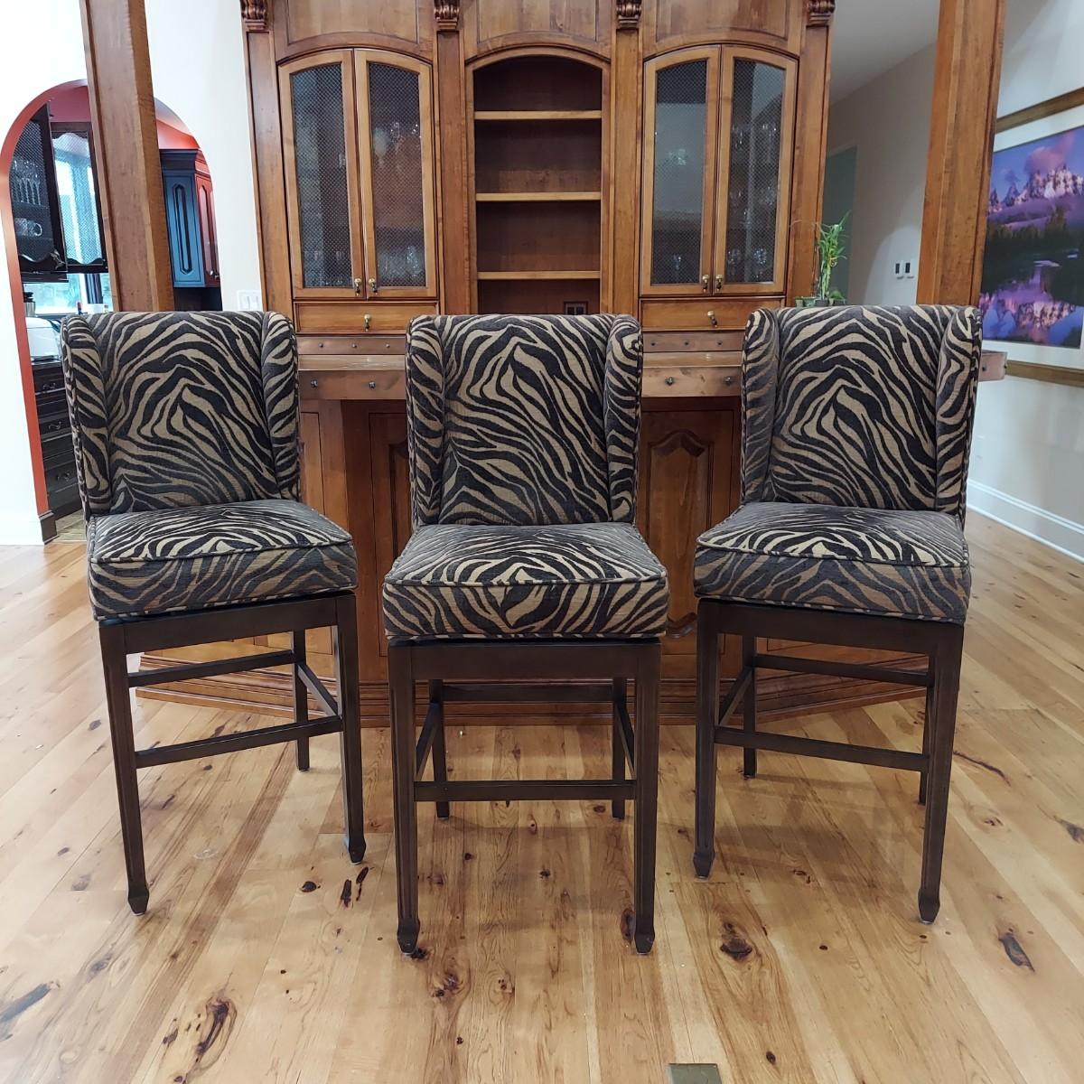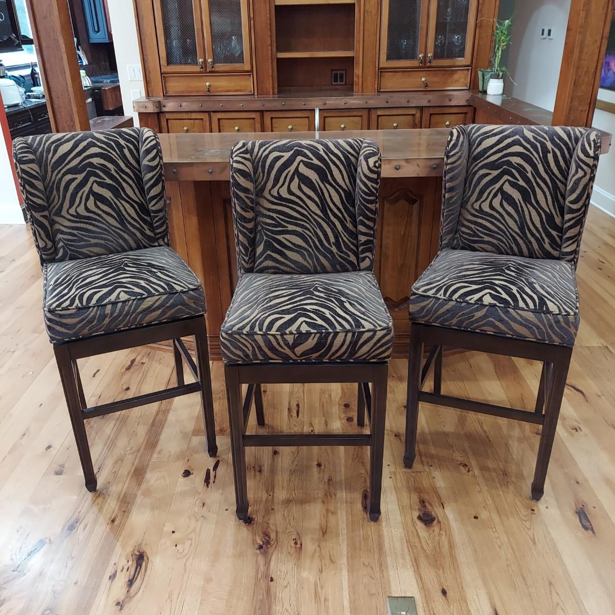 Lot of three cloth covered bar stools with wood bases. Two tone brown tiger or zebra style animal print. Approximately 20" x 21" x 49"H. Seat height is 30". Local Pickup Only.