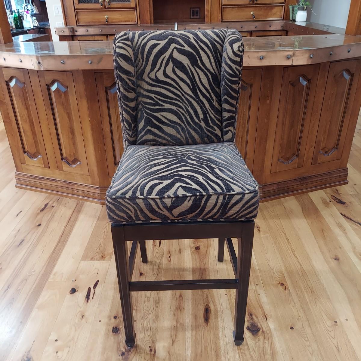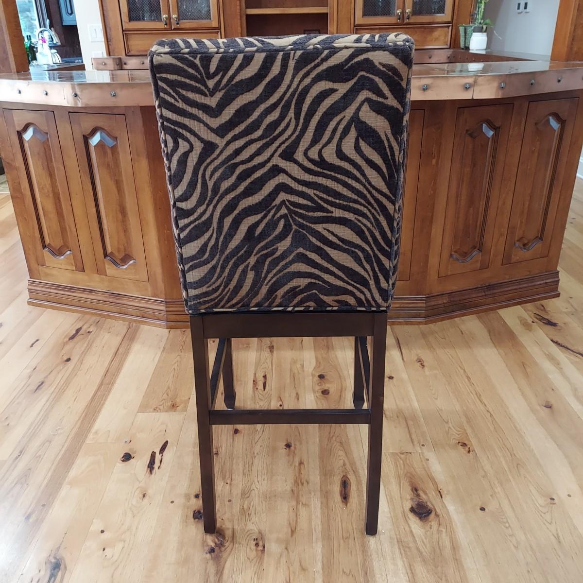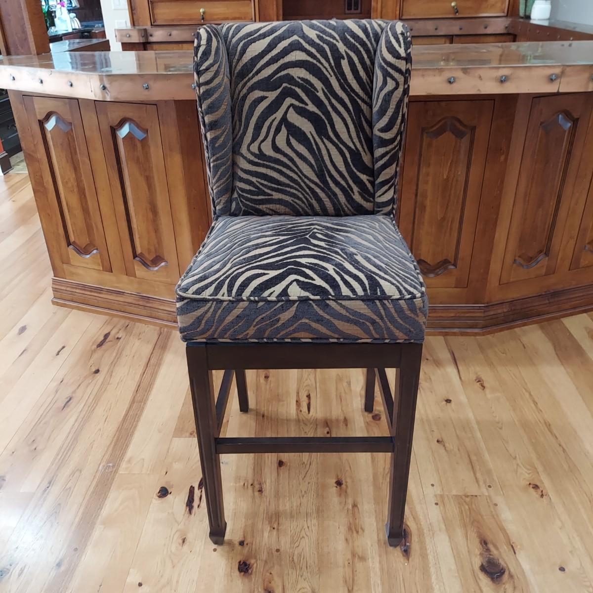 Lot of three cloth covered bar stools with wood bases. Two tone brown tiger or zebra style animal print. Approximately 20" x 21" x 49"H. Seat height is 30". Local Pickup Only.