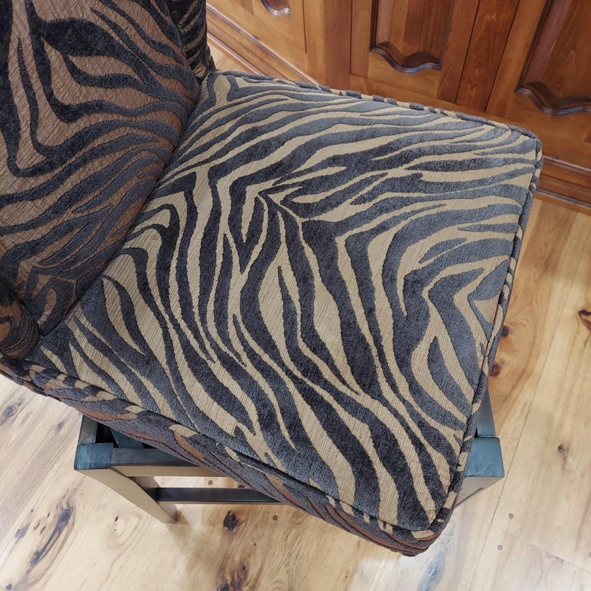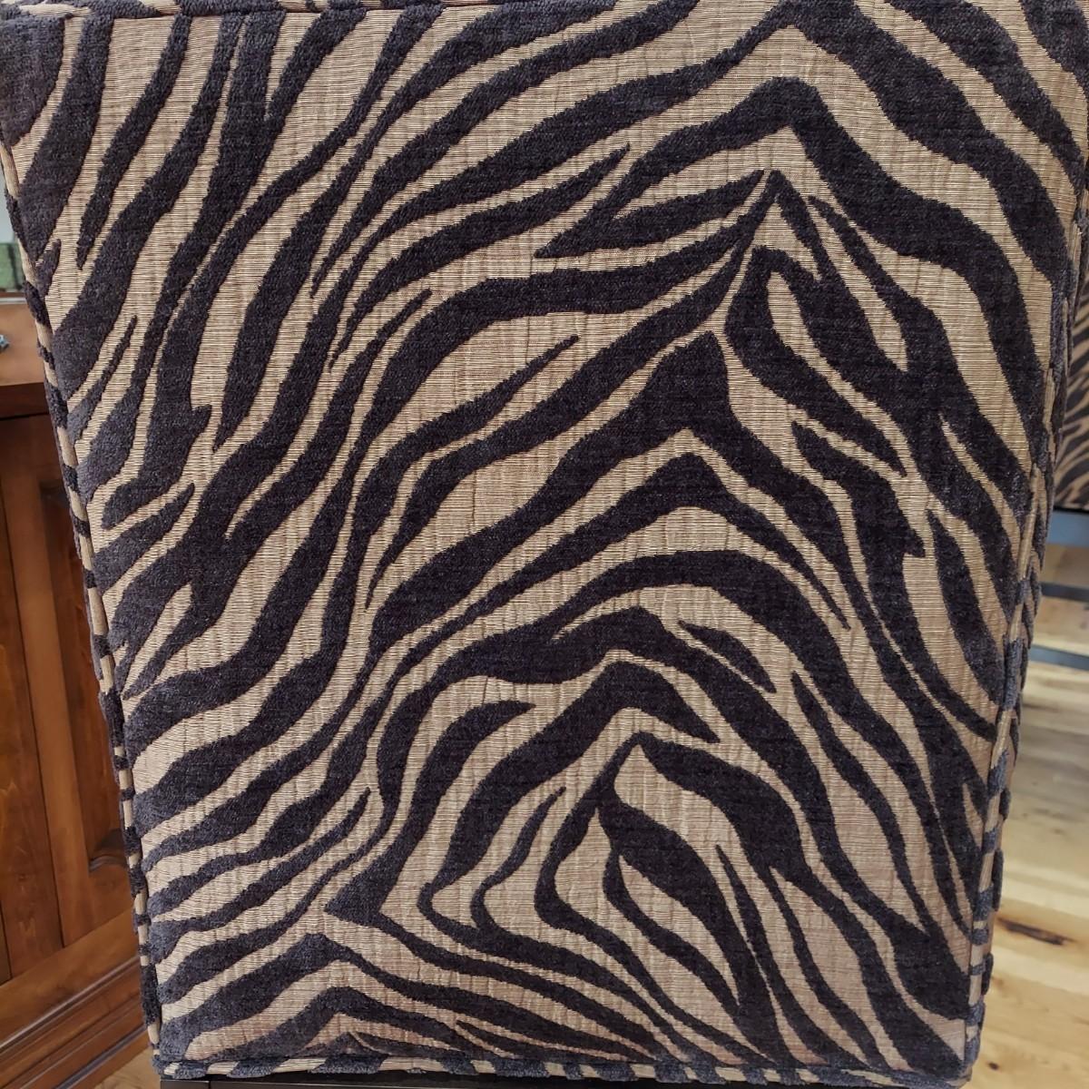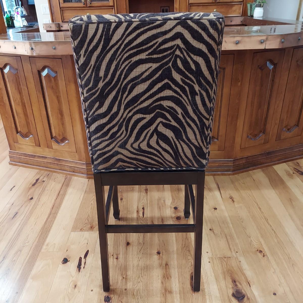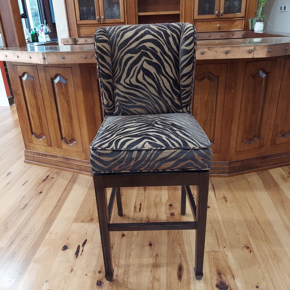 Lot of three cloth covered bar stools with wood bases. Two tone brown tiger or zebra style animal print. Approximately 20" x 21" x 49"H. Seat height is 30". Local Pickup Only.