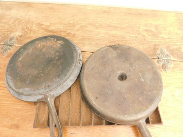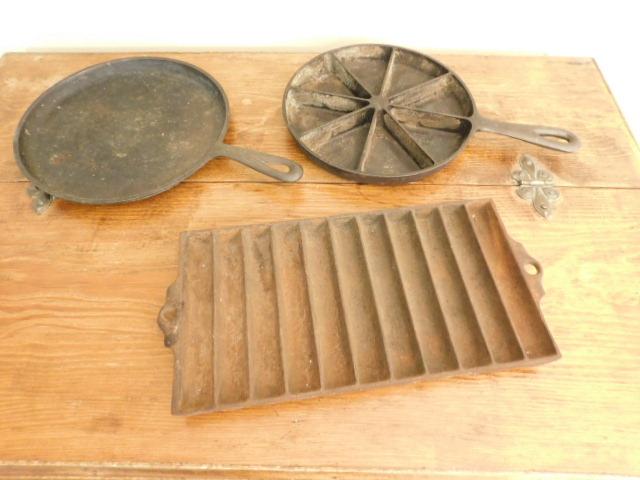 Set of Three Cast Iron Flat Pans and Corn Crib