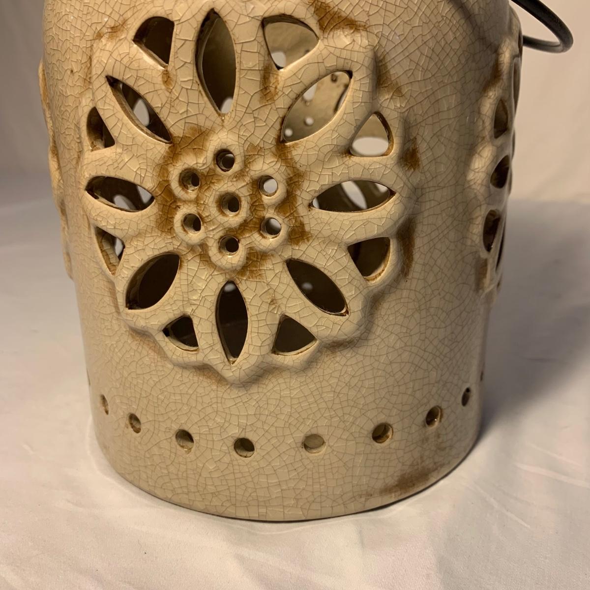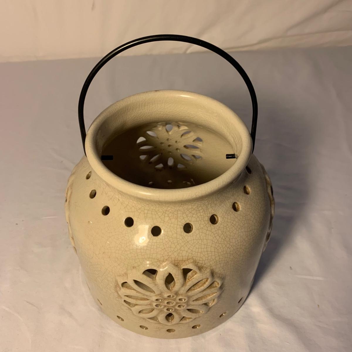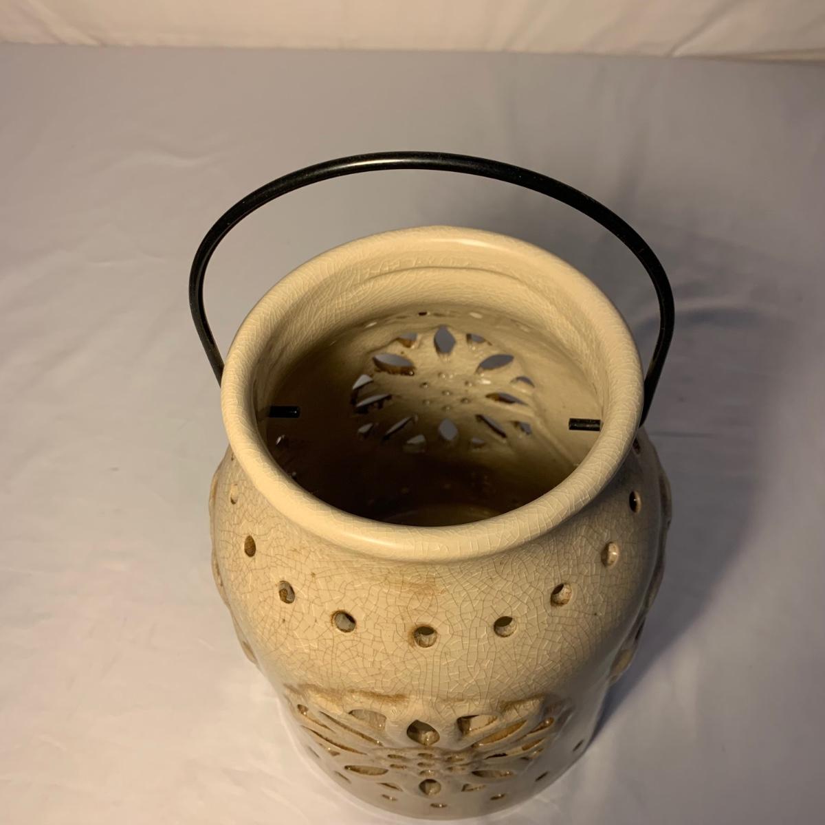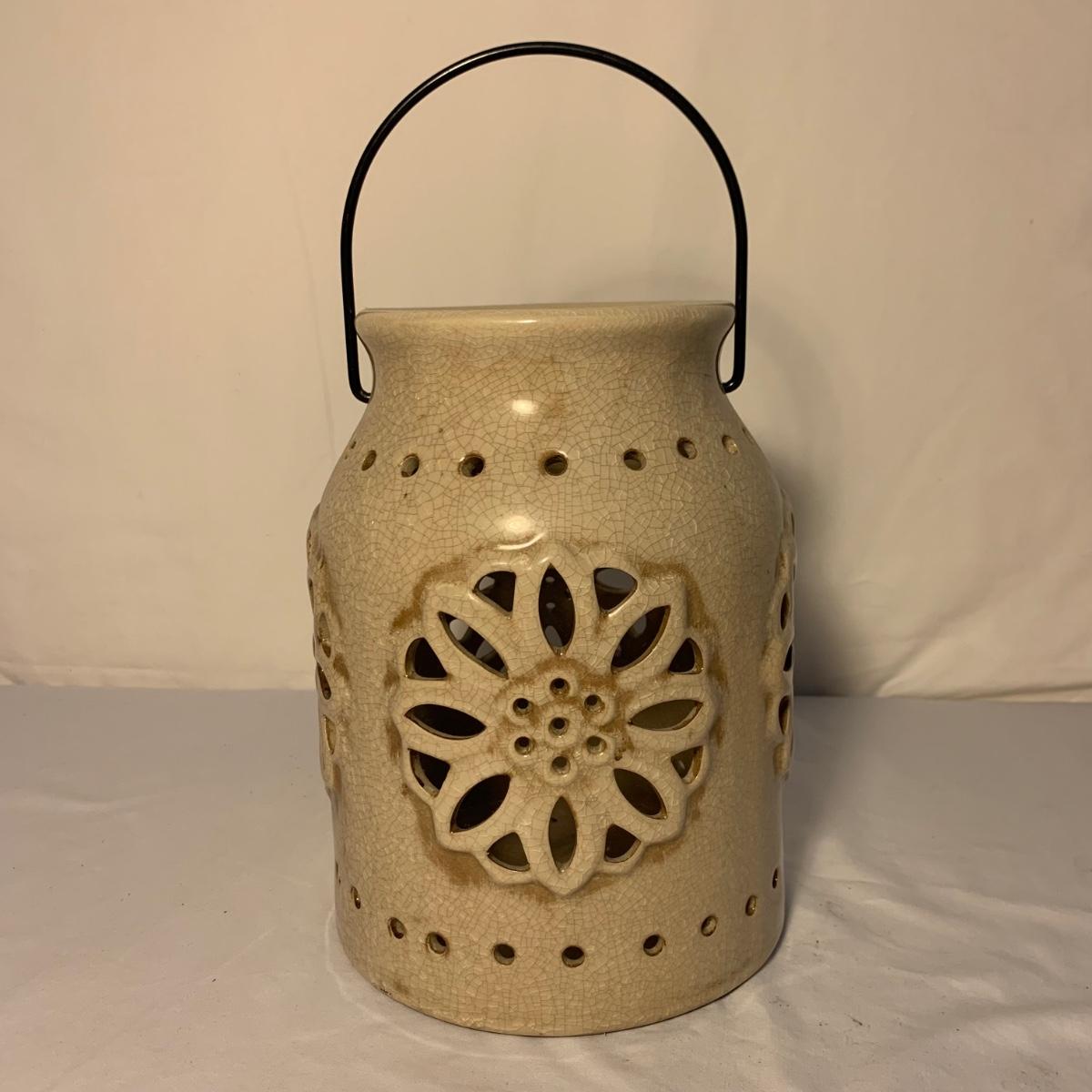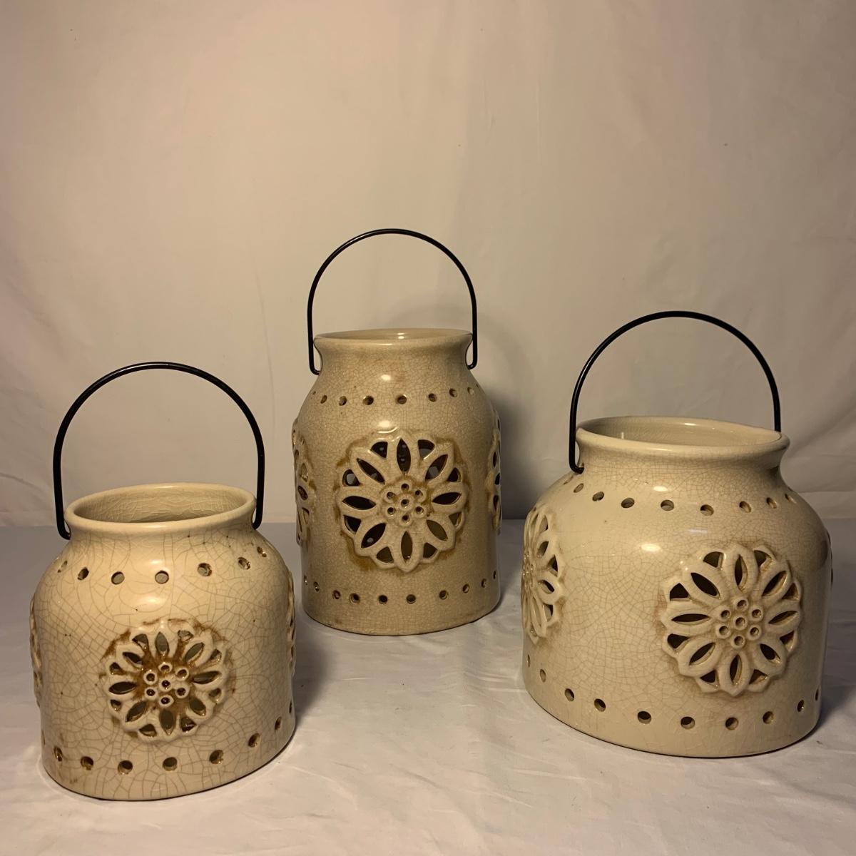 Three light tan colored ceramic lanterns with a floral design. The tallest measures 7“D x 9.5“H. They appear to have intentional crazing in their design. The handles are metal. These would also look great holding dried flower arrangements.
