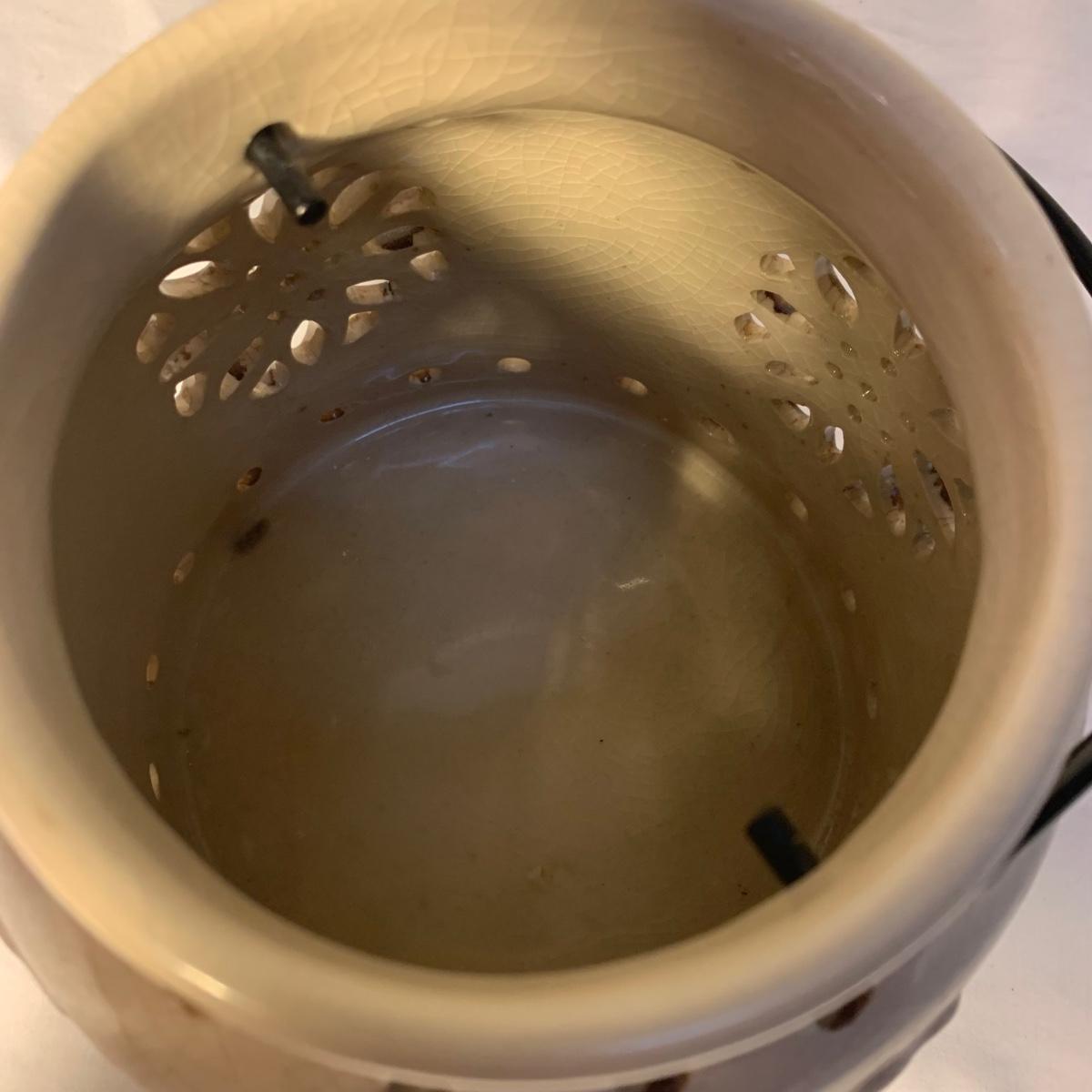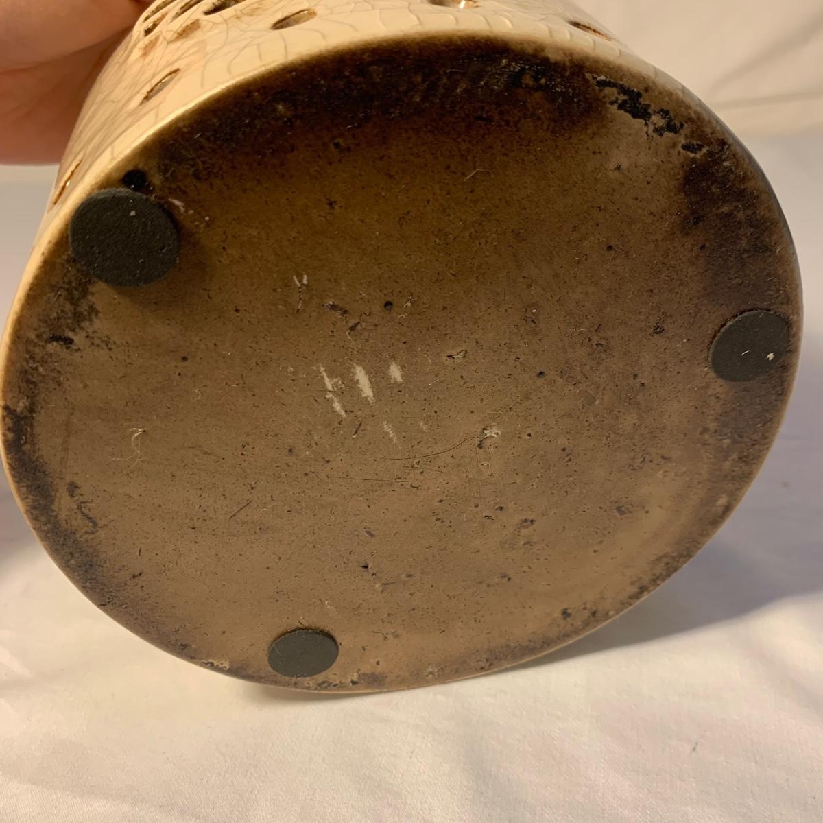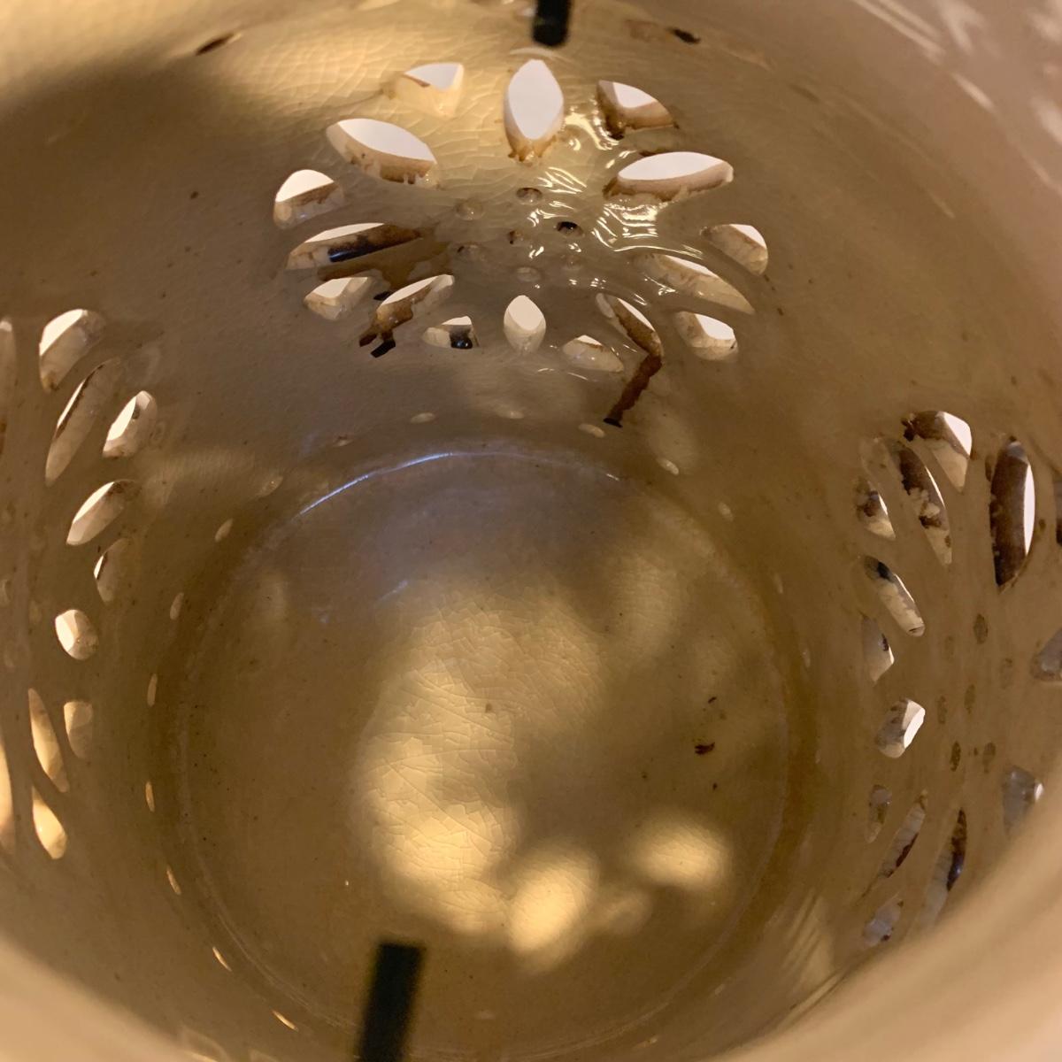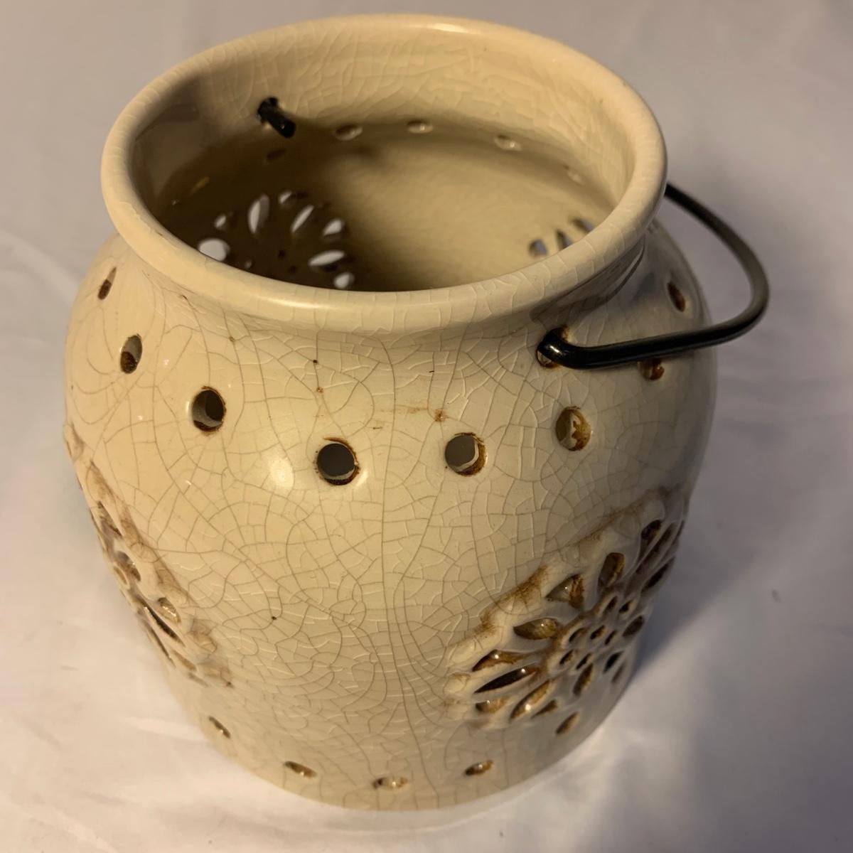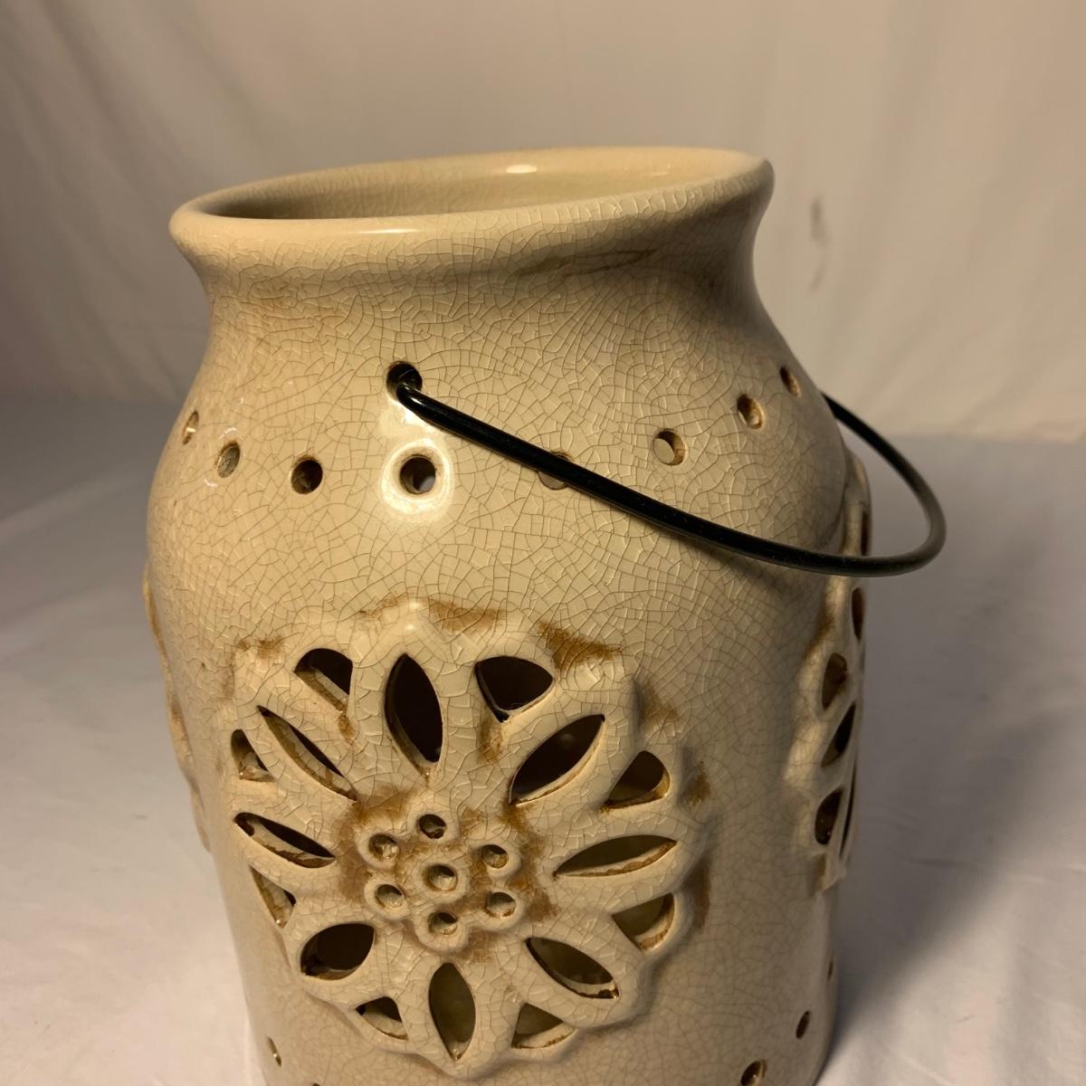 Three light tan colored ceramic lanterns with a floral design. The tallest measures 7“D x 9.5“H. They appear to have intentional crazing in their design. The handles are metal. These would also look great holding dried flower arrangements.