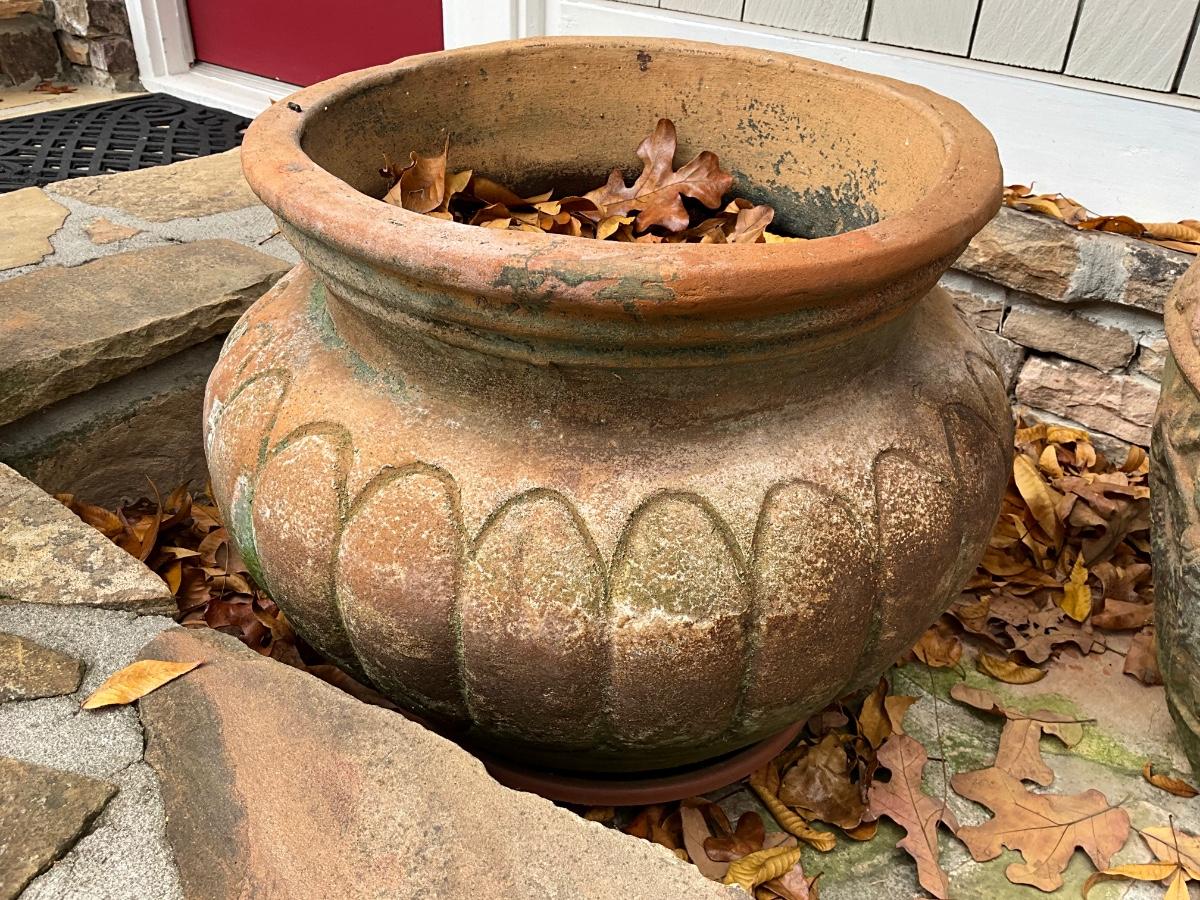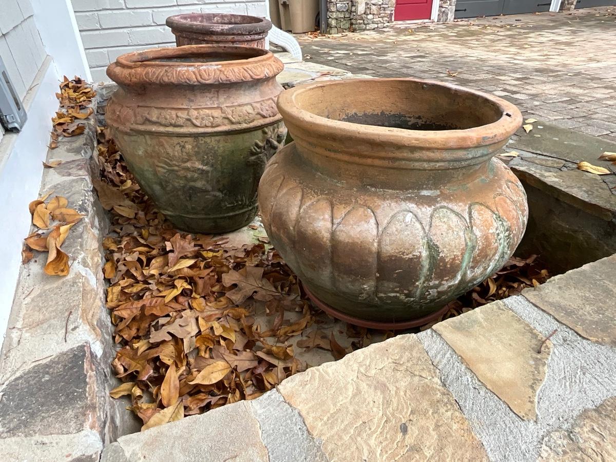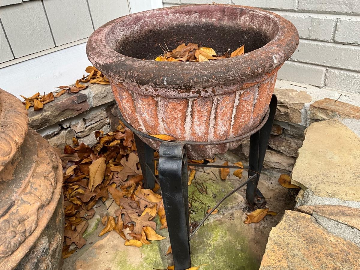 set of three concrete pots one to the left 21 inches wide 19 inches tall. Center one 19 inches tall 19 inches round. Rock iron stand with pot 21 inches tall 15 inches round