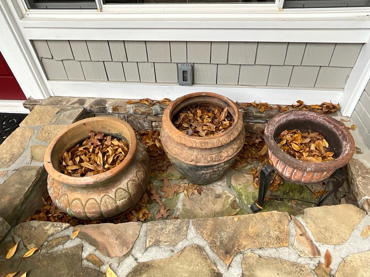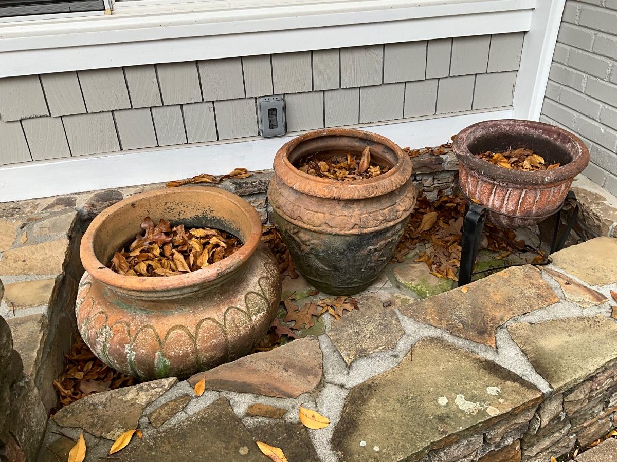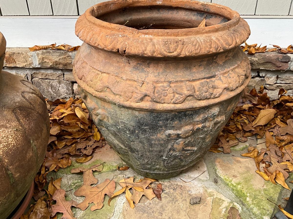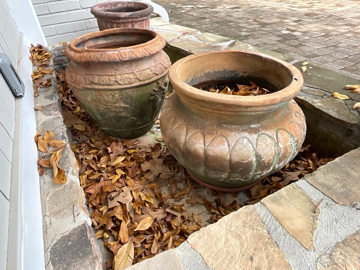 set of three concrete pots one to the left 21 inches wide 19 inches tall. Center one 19 inches tall 19 inches round. Rock iron stand with pot 21 inches tall 15 inches round