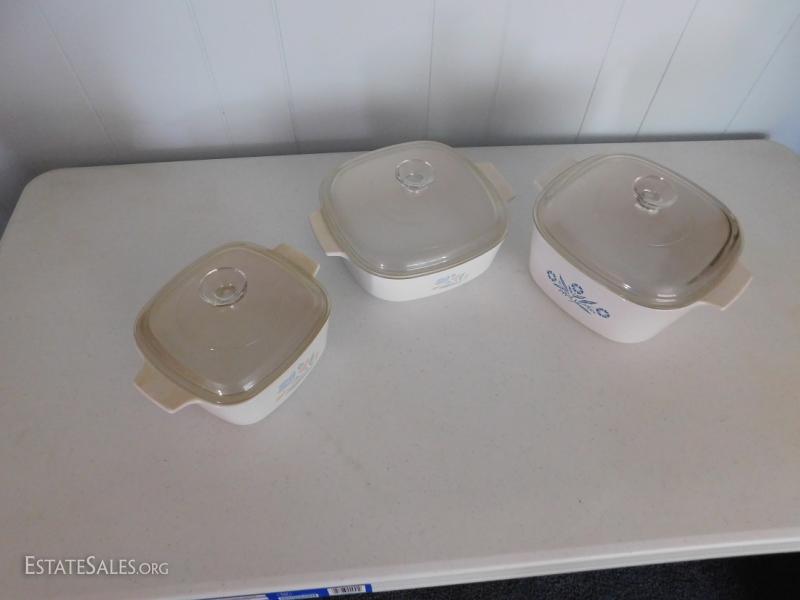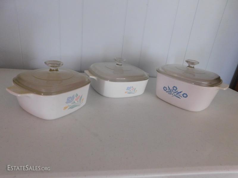 Set of three Corningware bake dishes with lids. Need cleaning but no chips or breaks.
