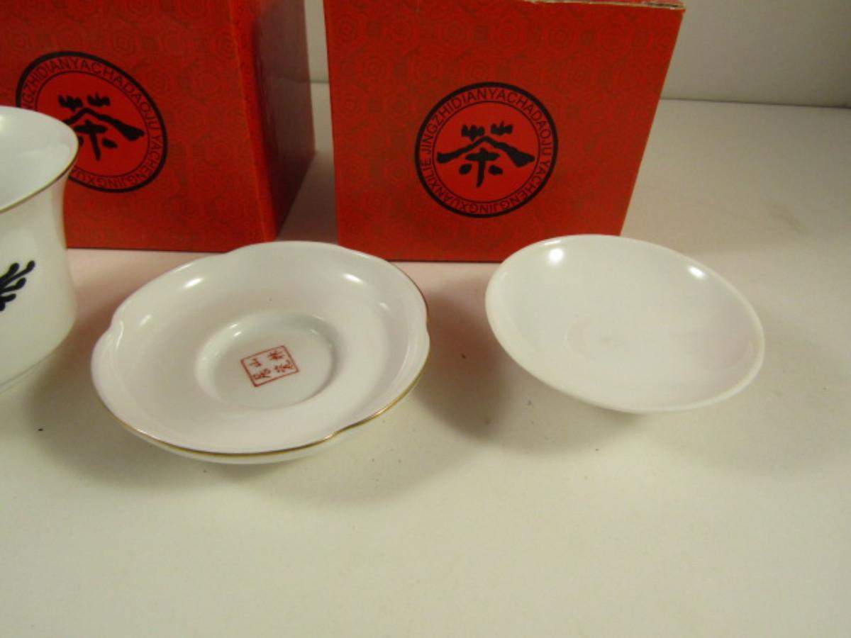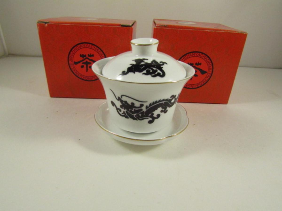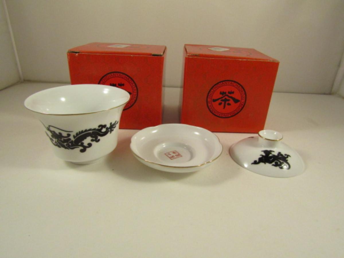 Set of Three Covered Cups and Saucers with Dragon Design