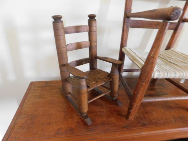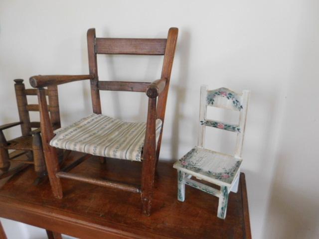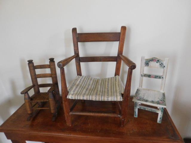 Set of Three Doll Chairs of Various Sizes large chair has been repaired as pictured
