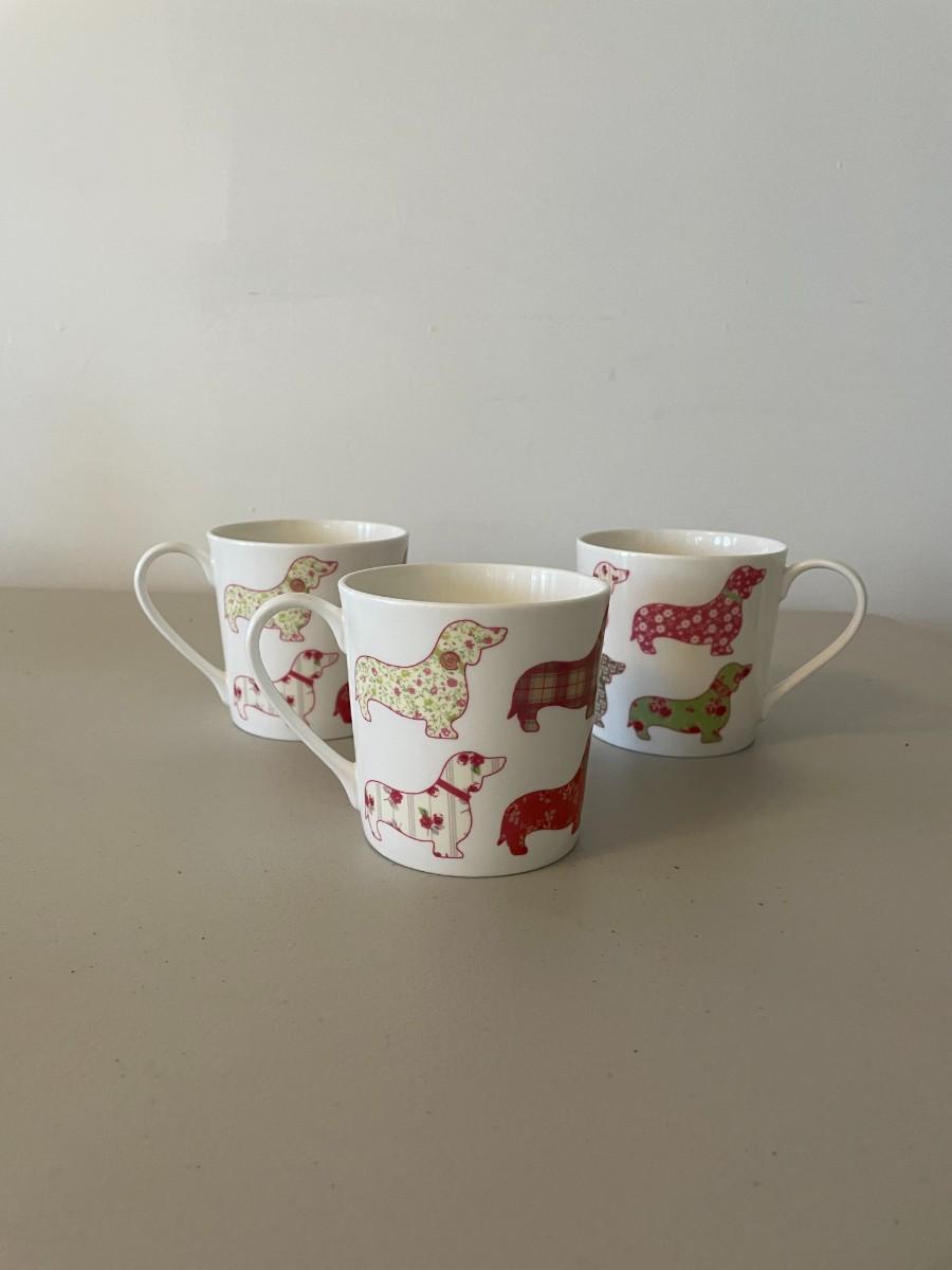 Puppy themed. Stamped on the bottom of each mug. 3 1/2"(h)