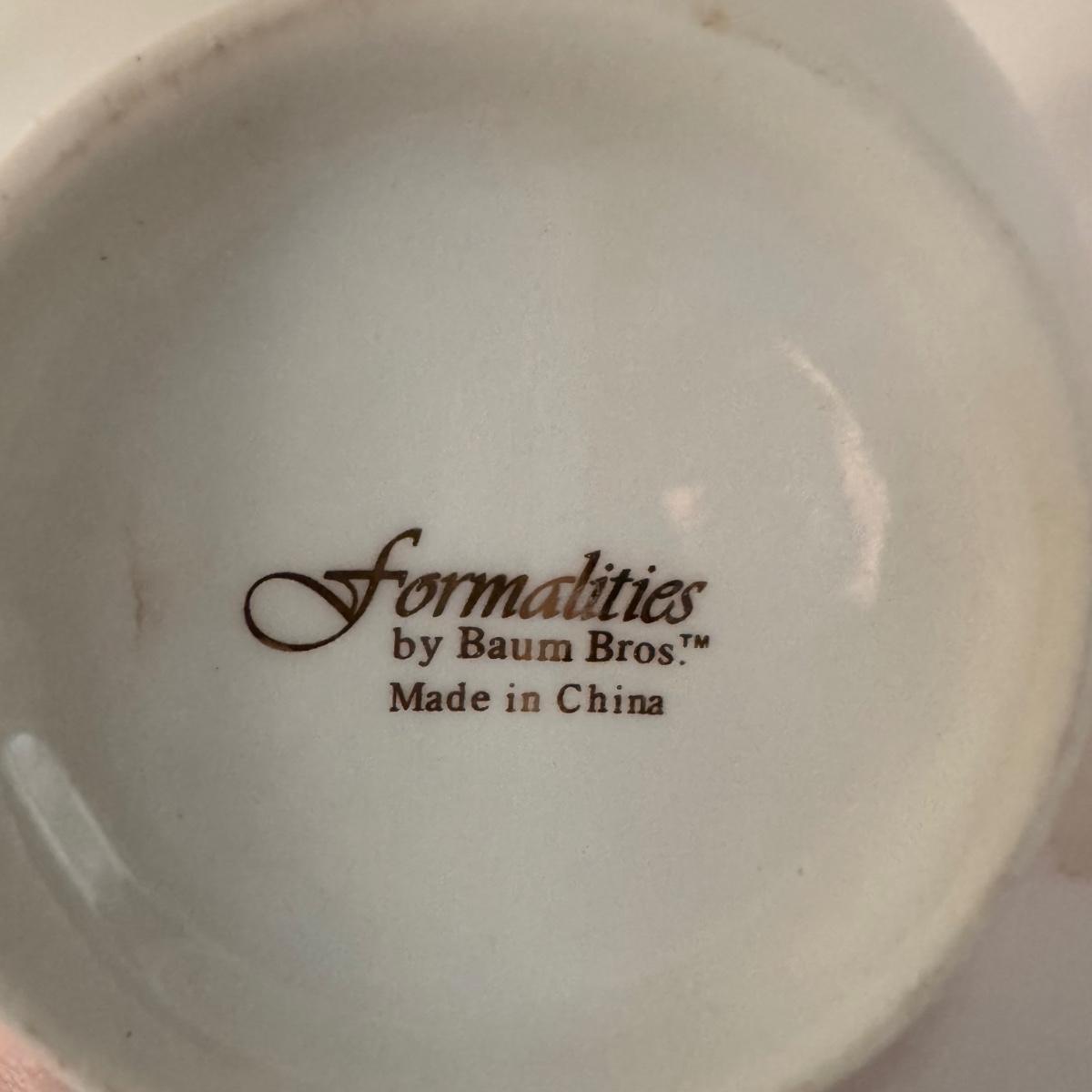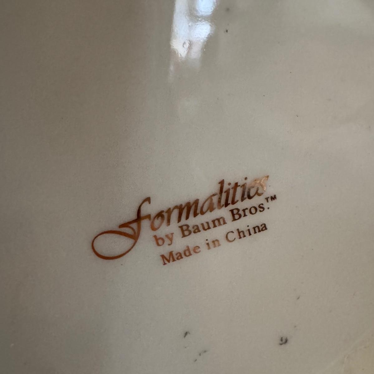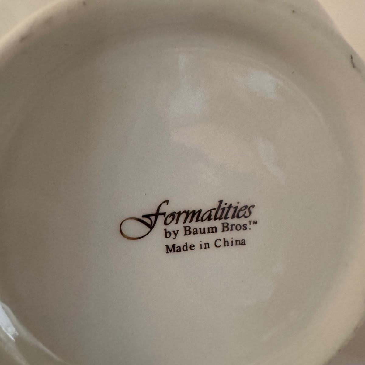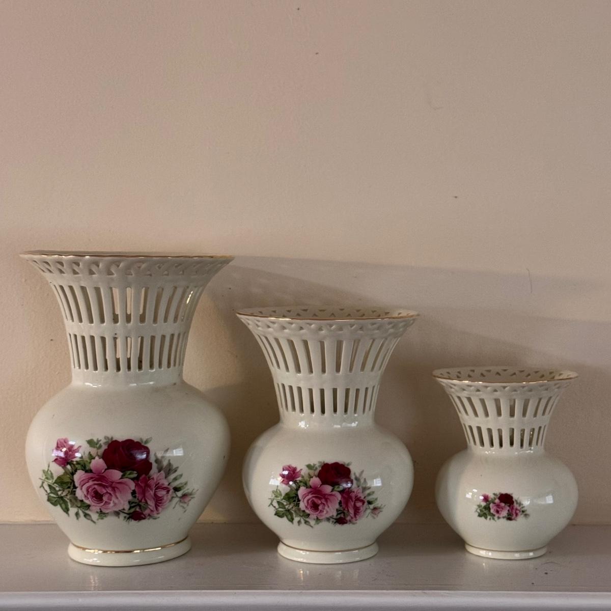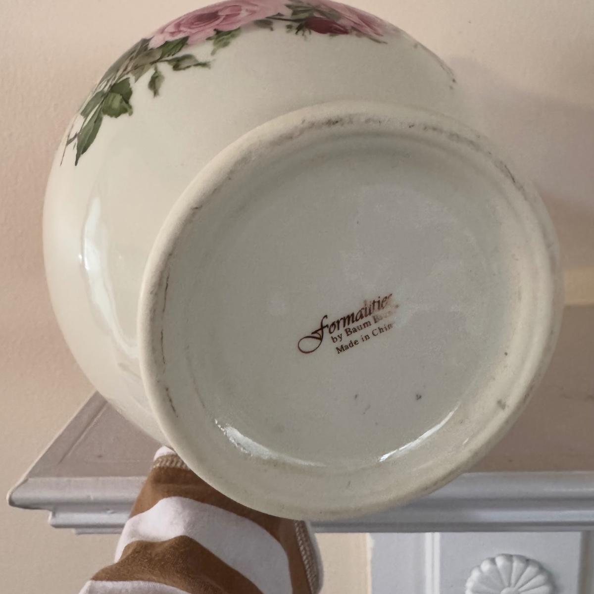 Lot includes three Formalities by Baum Bros ceramic vases in three staggered sizes. The largest vase measures 7”D x 10”H and the smallest is 4.95” x 5.5”H. Shipping available.