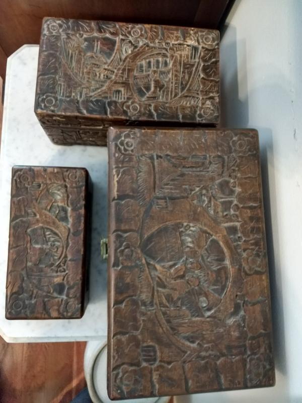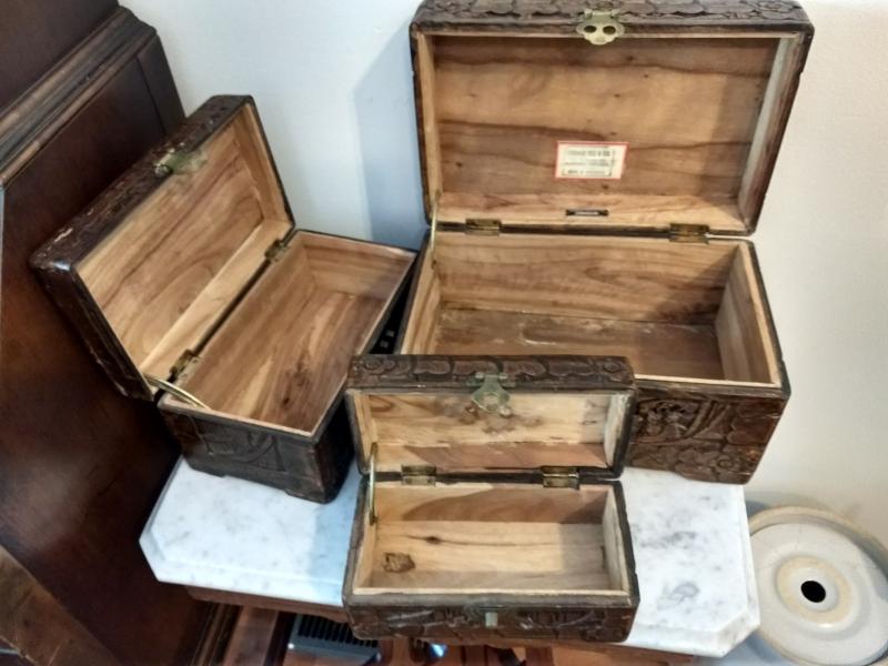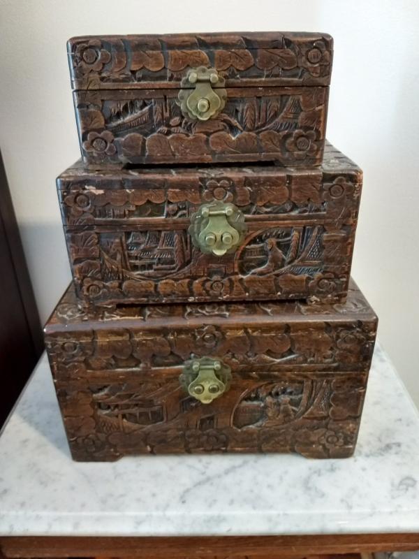 Set of Three George Zee & Co Carved Stack Boxes may have scratches and drying issues
