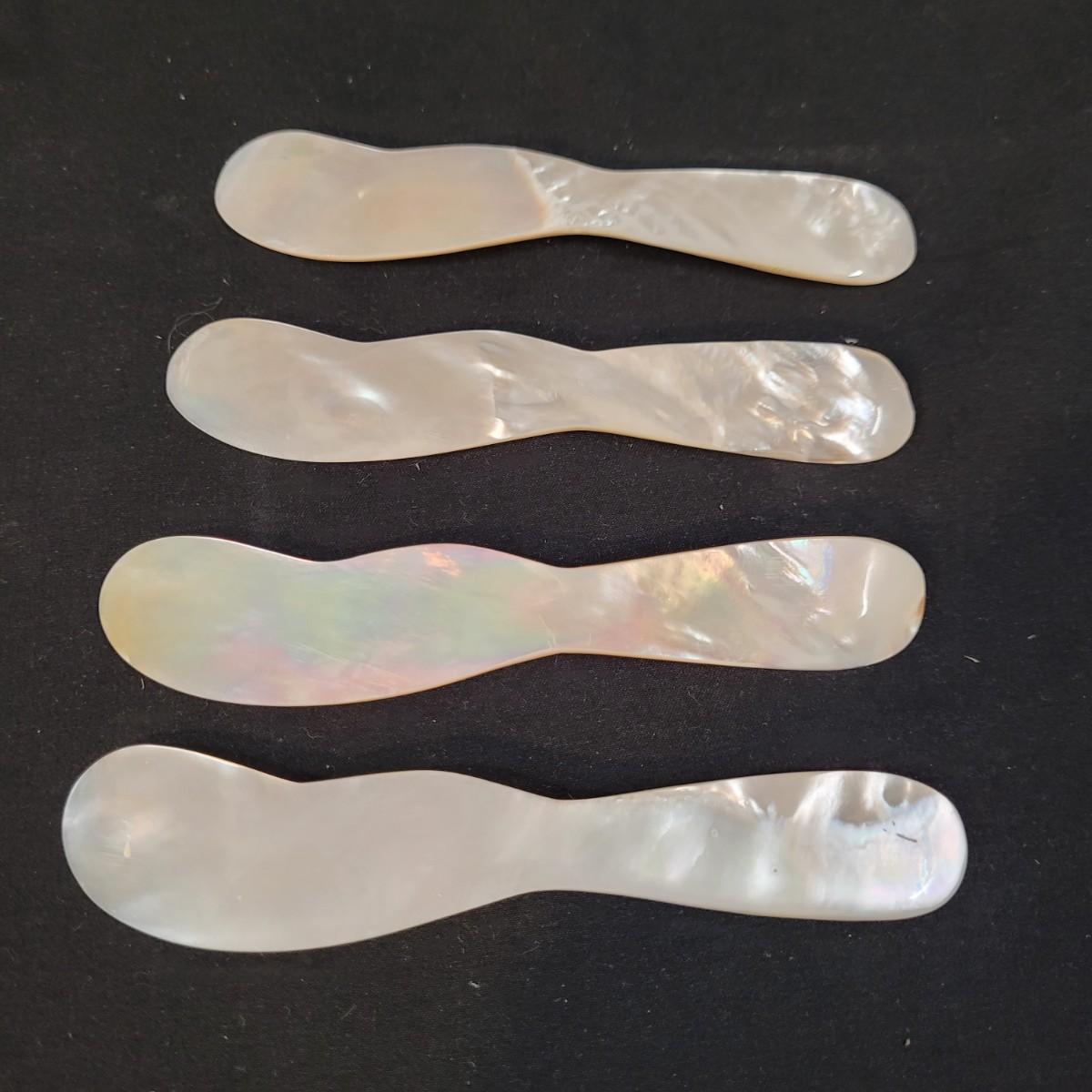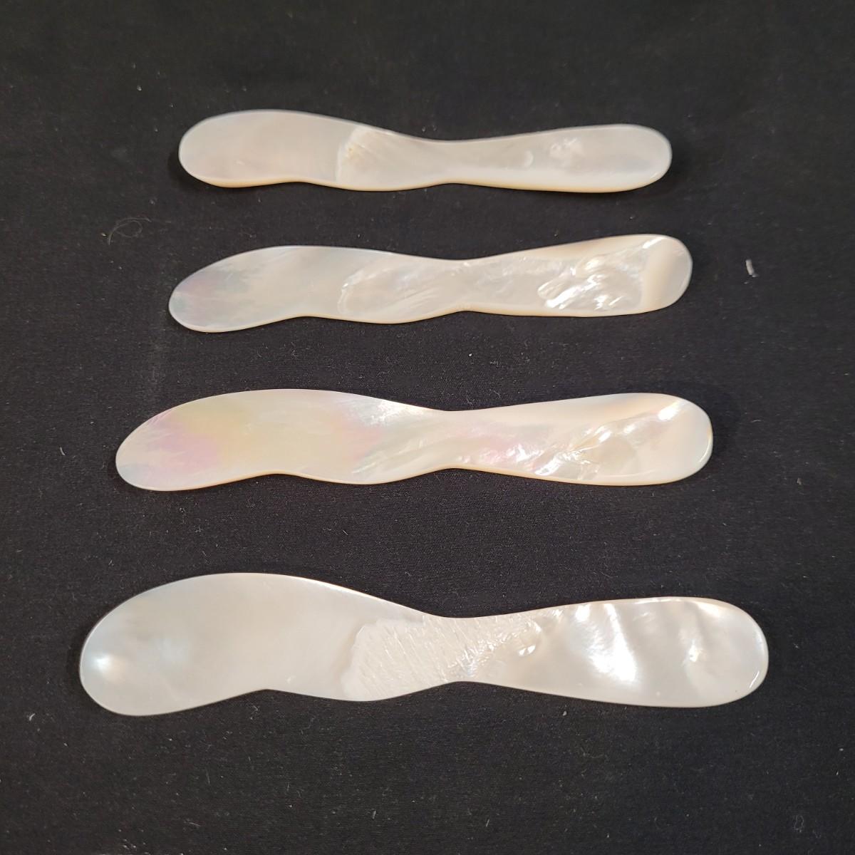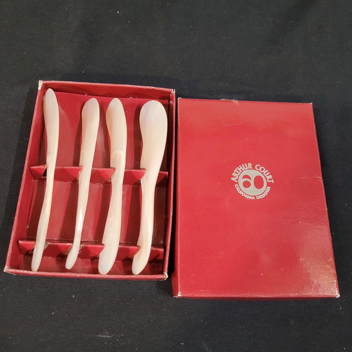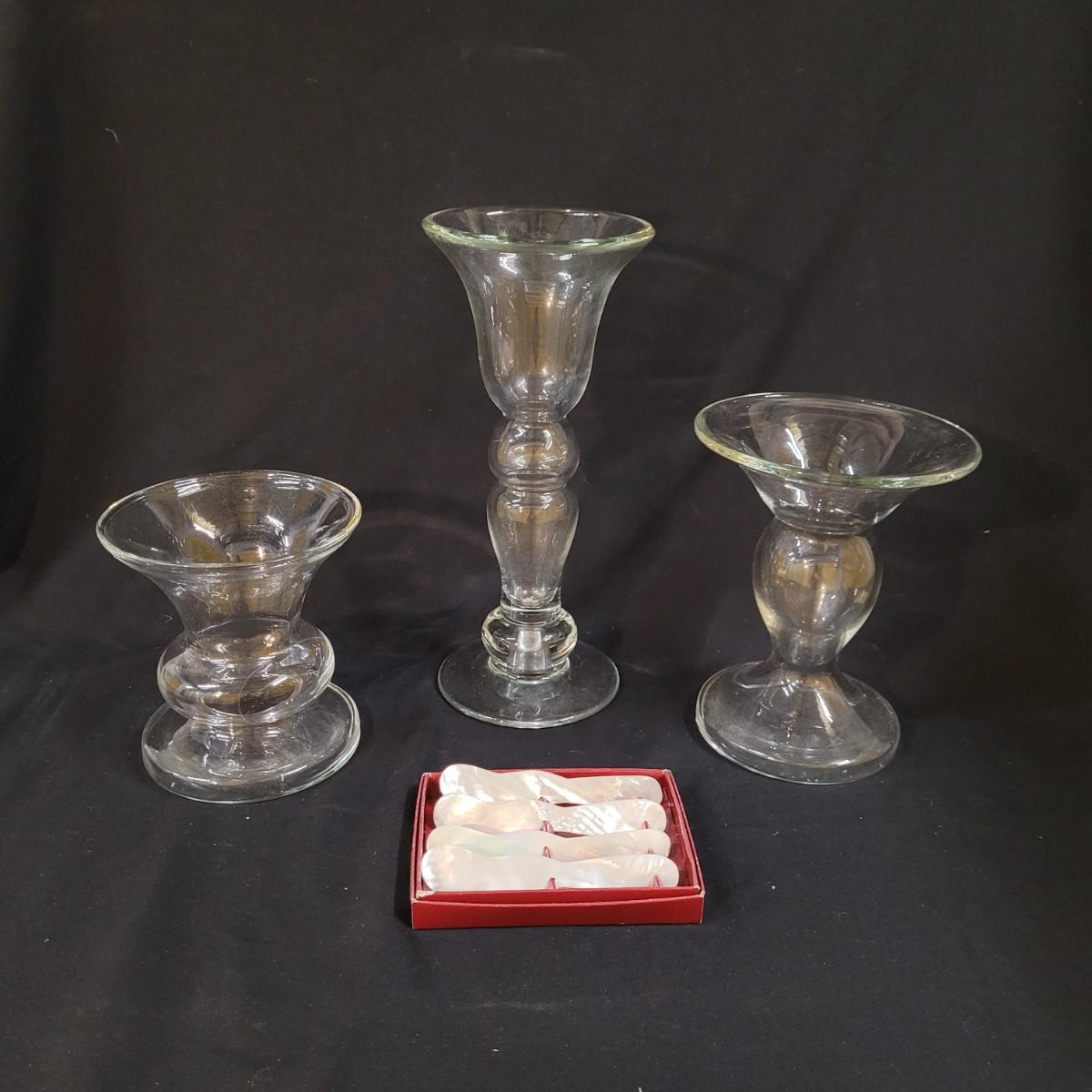 Three thick, sturdy glass vases, with various shapes and sizes. Excellent condition with smudging and grime buildup, easily cleanable. Set of four spreading knives by Arthur Court of California. Materiel appears to be mother of pearl but cannot verify. Very light in weight, with thicker handles and very thin blades. Each spreader is slightly different due to the natural material. Shipping available.