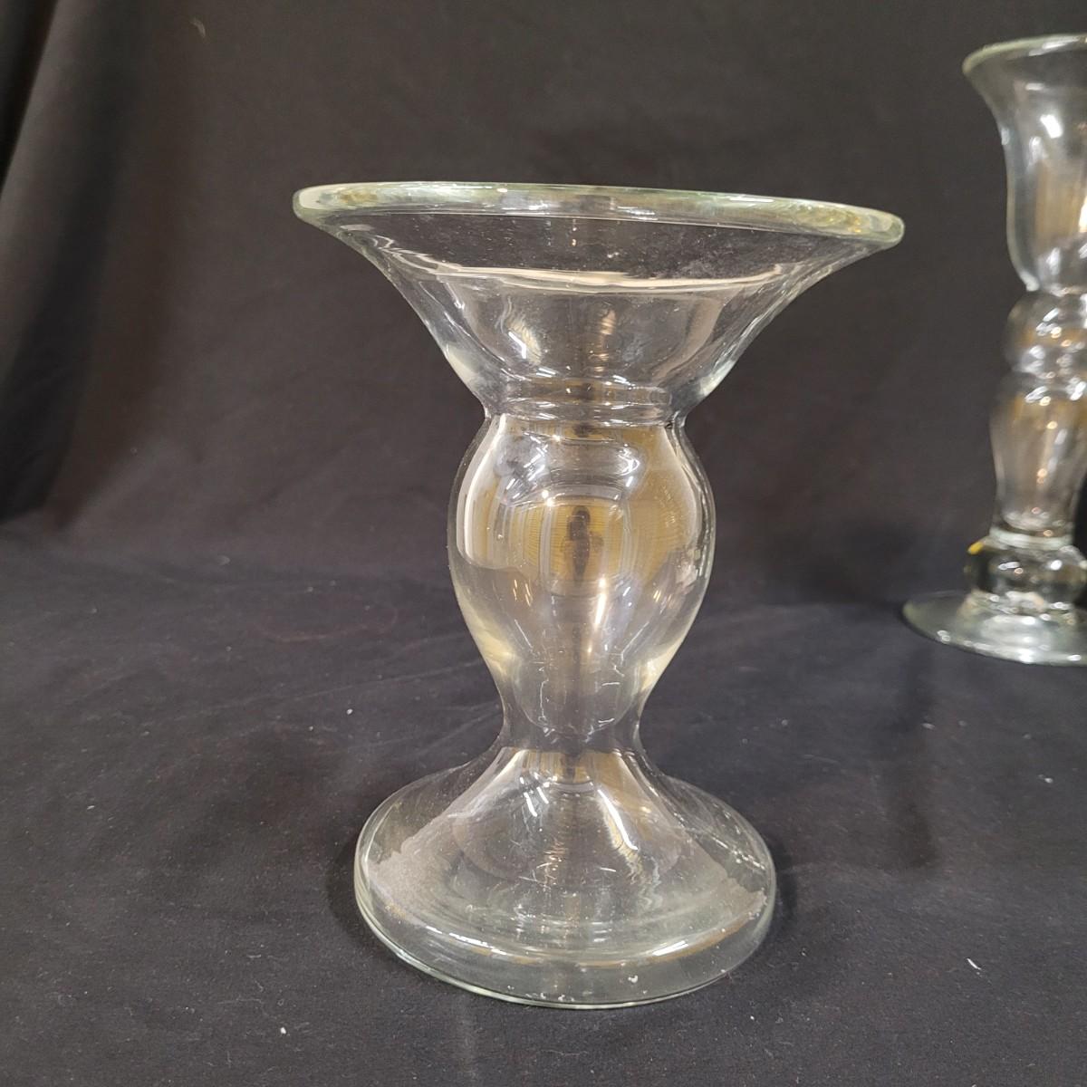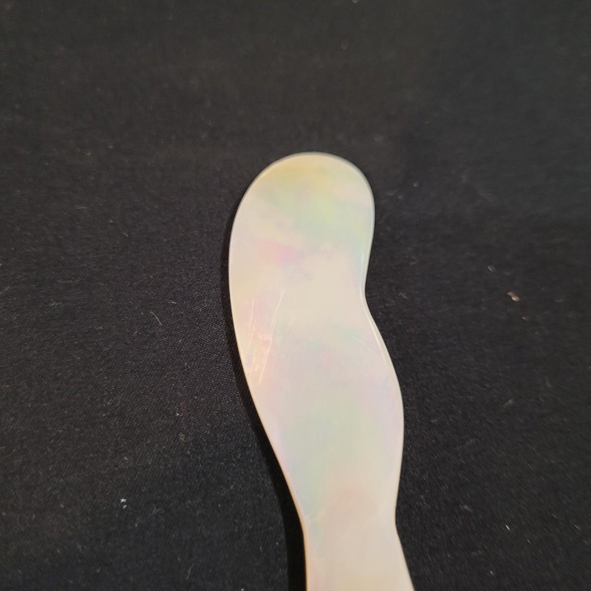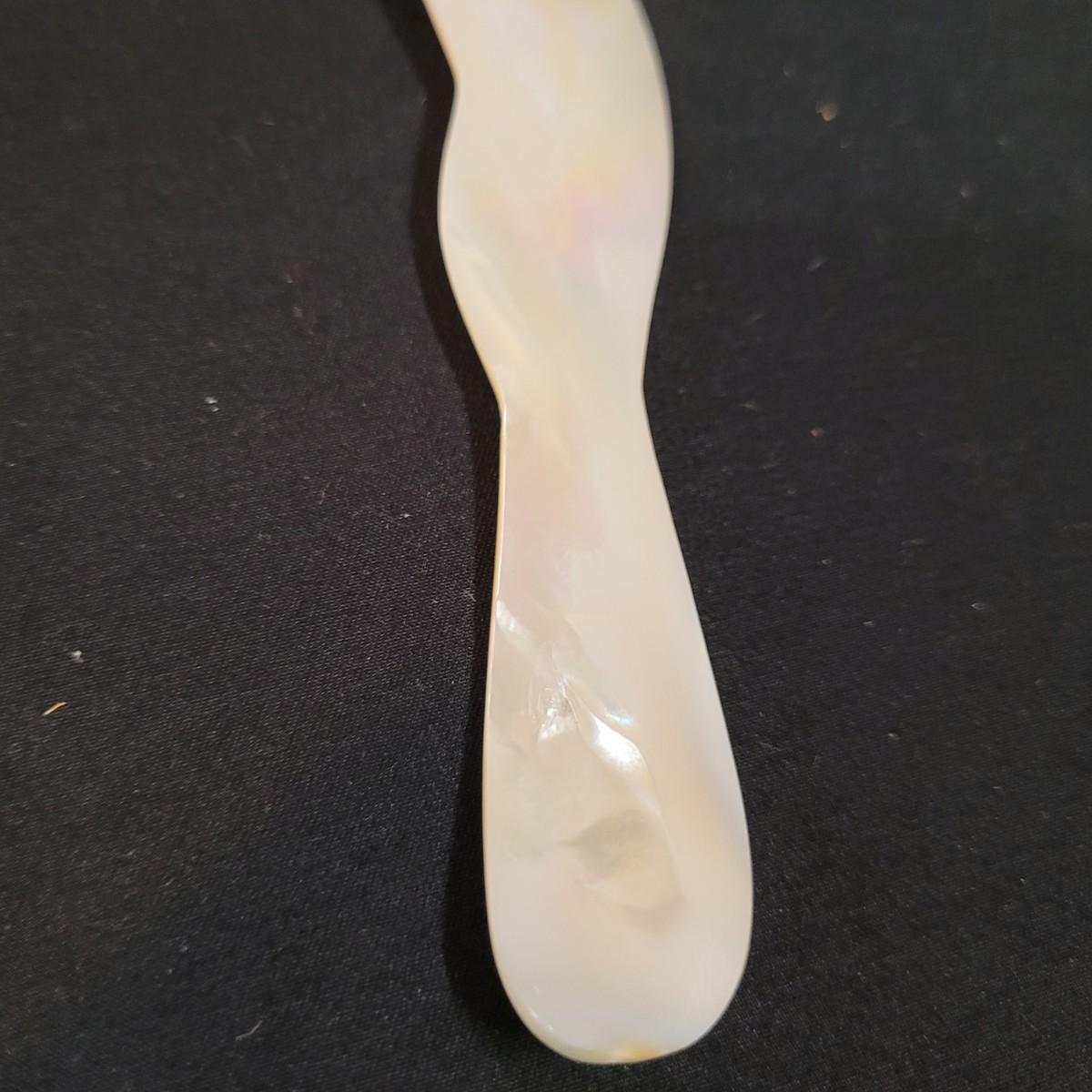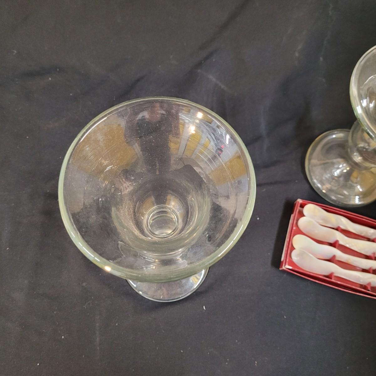 Three thick, sturdy glass vases, with various shapes and sizes. Excellent condition with smudging and grime buildup, easily cleanable. Set of four spreading knives by Arthur Court of California. Materiel appears to be mother of pearl but cannot verify. Very light in weight, with thicker handles and very thin blades. Each spreader is slightly different due to the natural material. Shipping available.