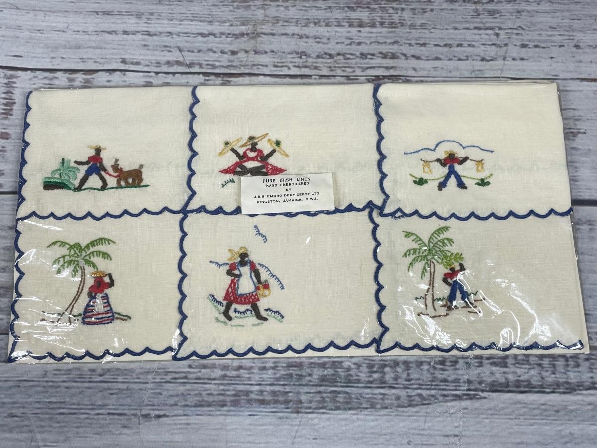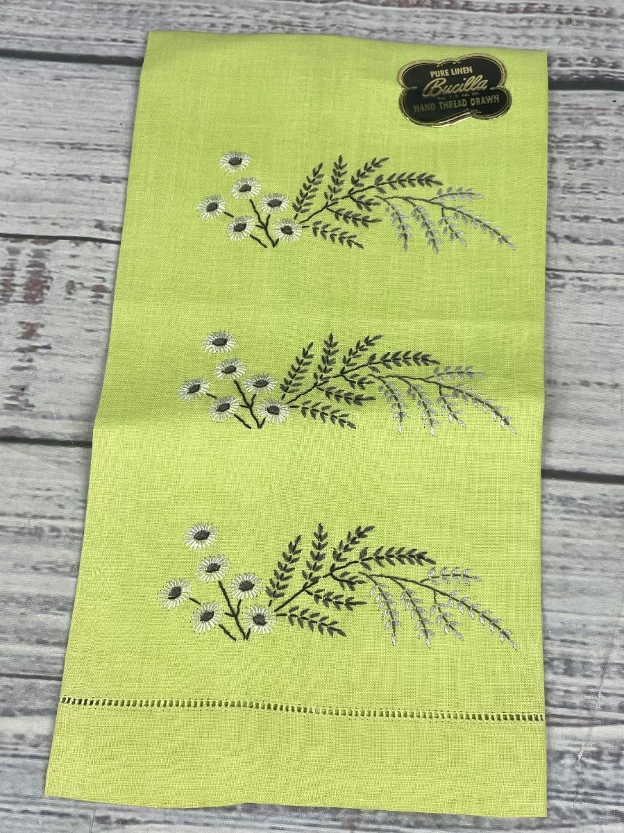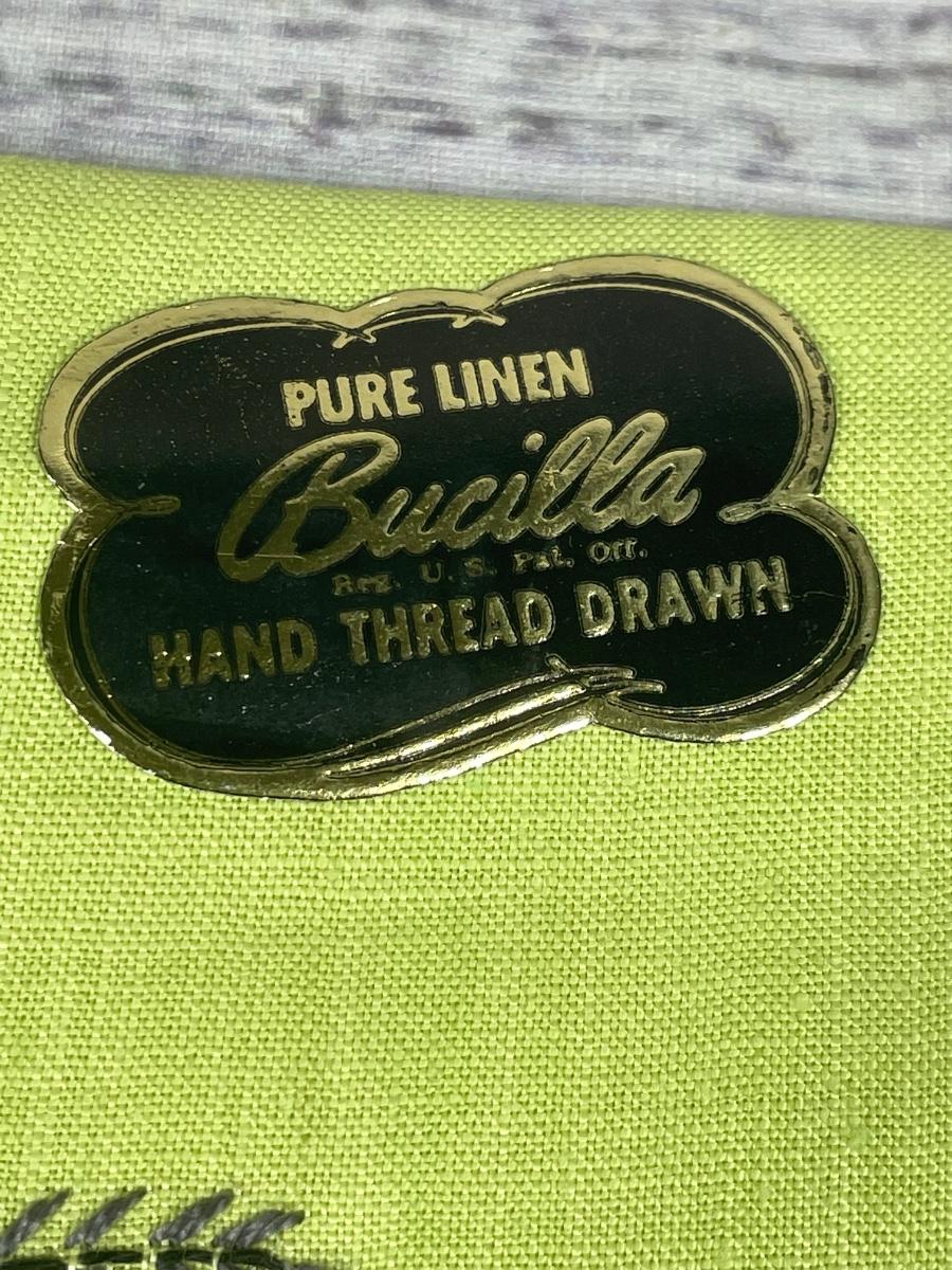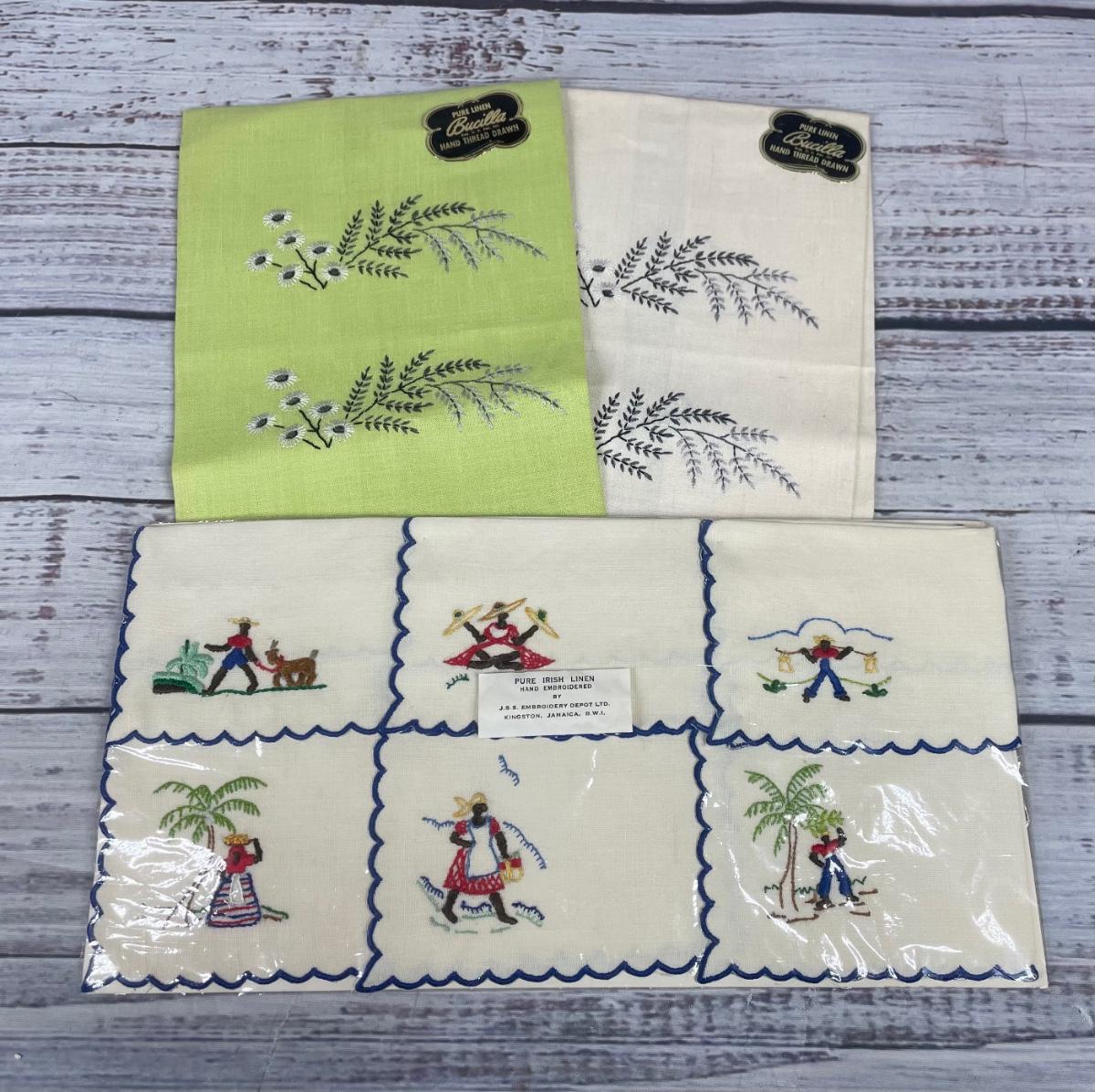 All three linen sets are in great condition. The first linen that is pictured comes in it’s original packaging and it is pure Irish linen. The other two have the same design as each other but in different colors: green and an off white.