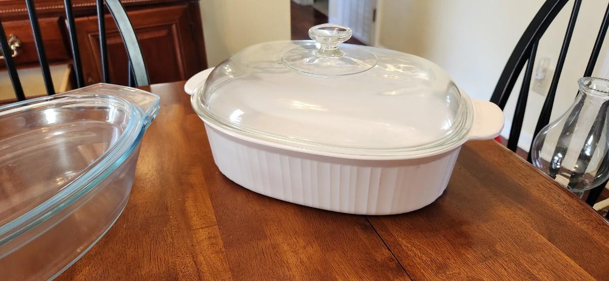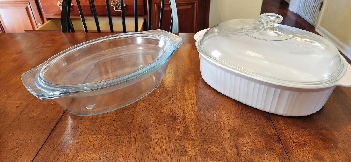 Set Of Three Large Glass Baking Dishes, Third Dish Can Be Used As Lid For Second Dish