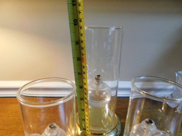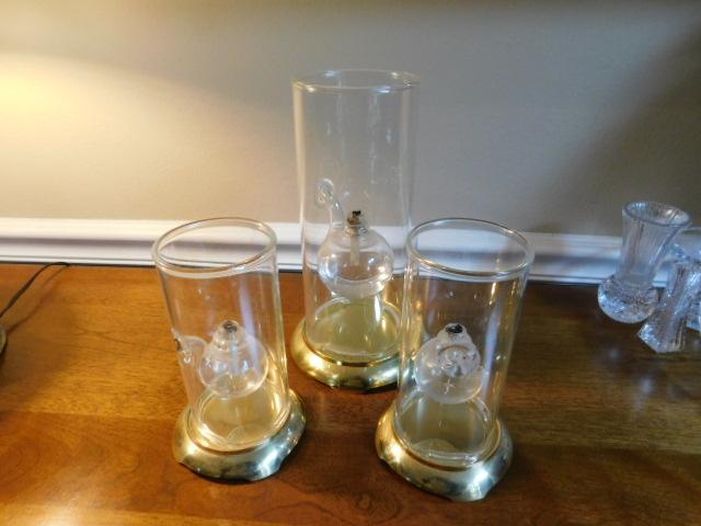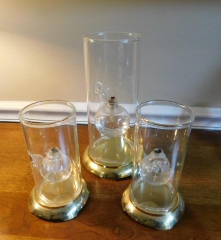 Set of Three Matching Table Top Oil Lanterns with Brass Bases (2) 6' (1) 10"