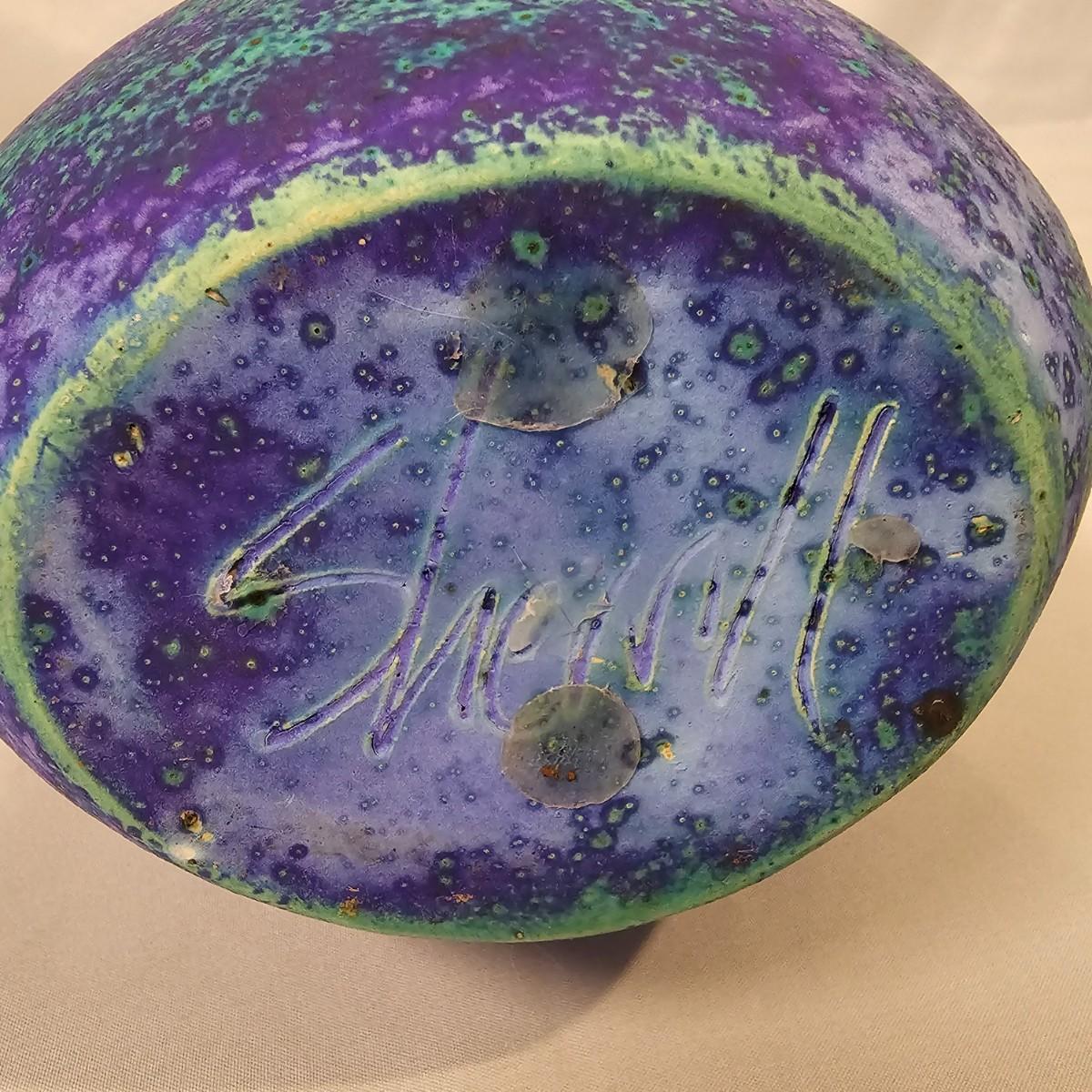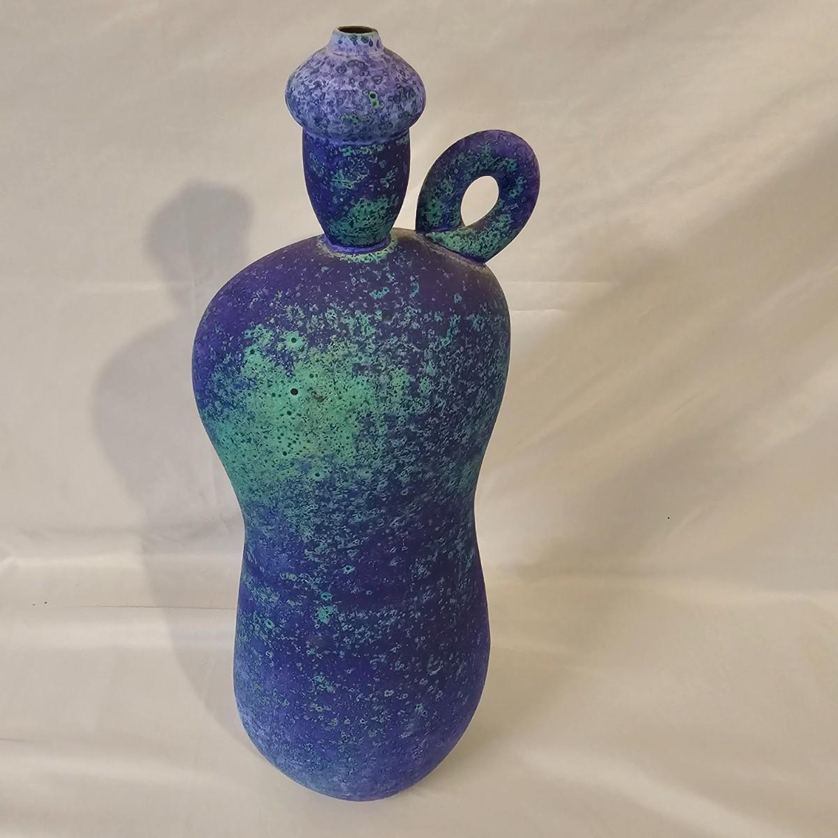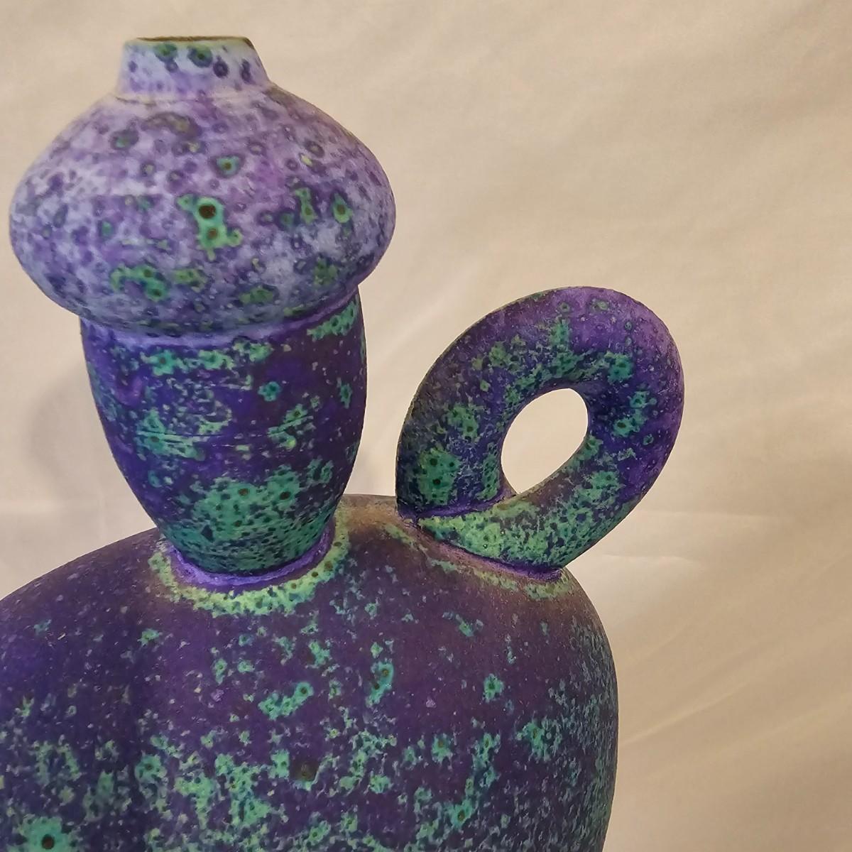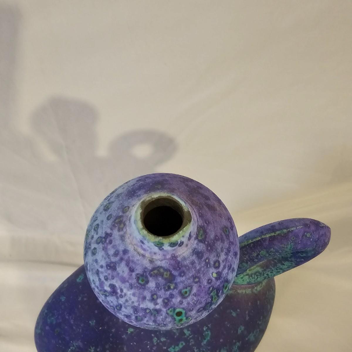 Vibrant purples and aquas adorn these three striking bottle shapes by N.C. artist Michael Sherrill. Similiar top styling with spouts and handles. A matte, nubby finish covers the exteriors. Tallest piece is 5" x 7" x 20"H, medium is 4" x 6" x 12" and shortest is 4" x 6.5" x 8.5"H. There appears to be residue from museum putty on the bottoms of the pieces. Some dust and debris may be stuck in this residue. See photos for details. Shipping available. Shipping can be costly. We suggest contacting our preferred local shipping provider, Postage Express, with dimensions and getting an estimate before bidding: (828) 670-5501 or shipping@postageexpressnc.com