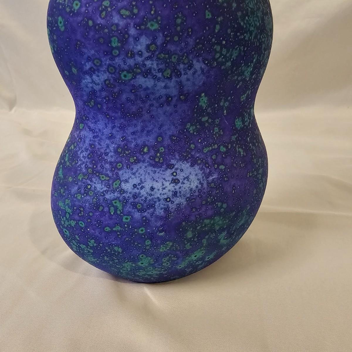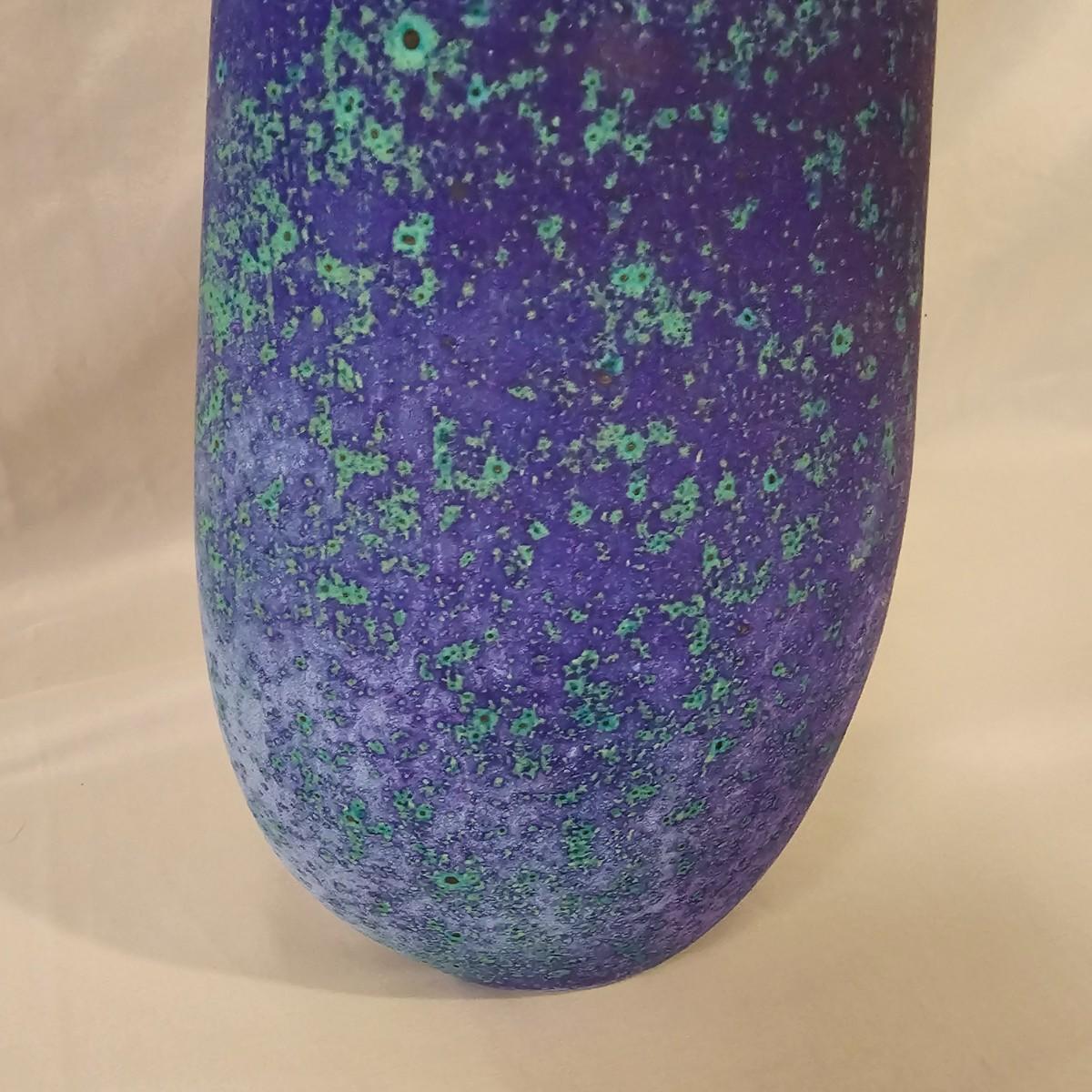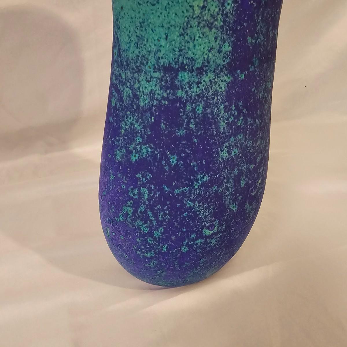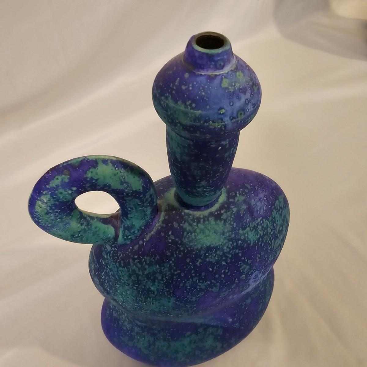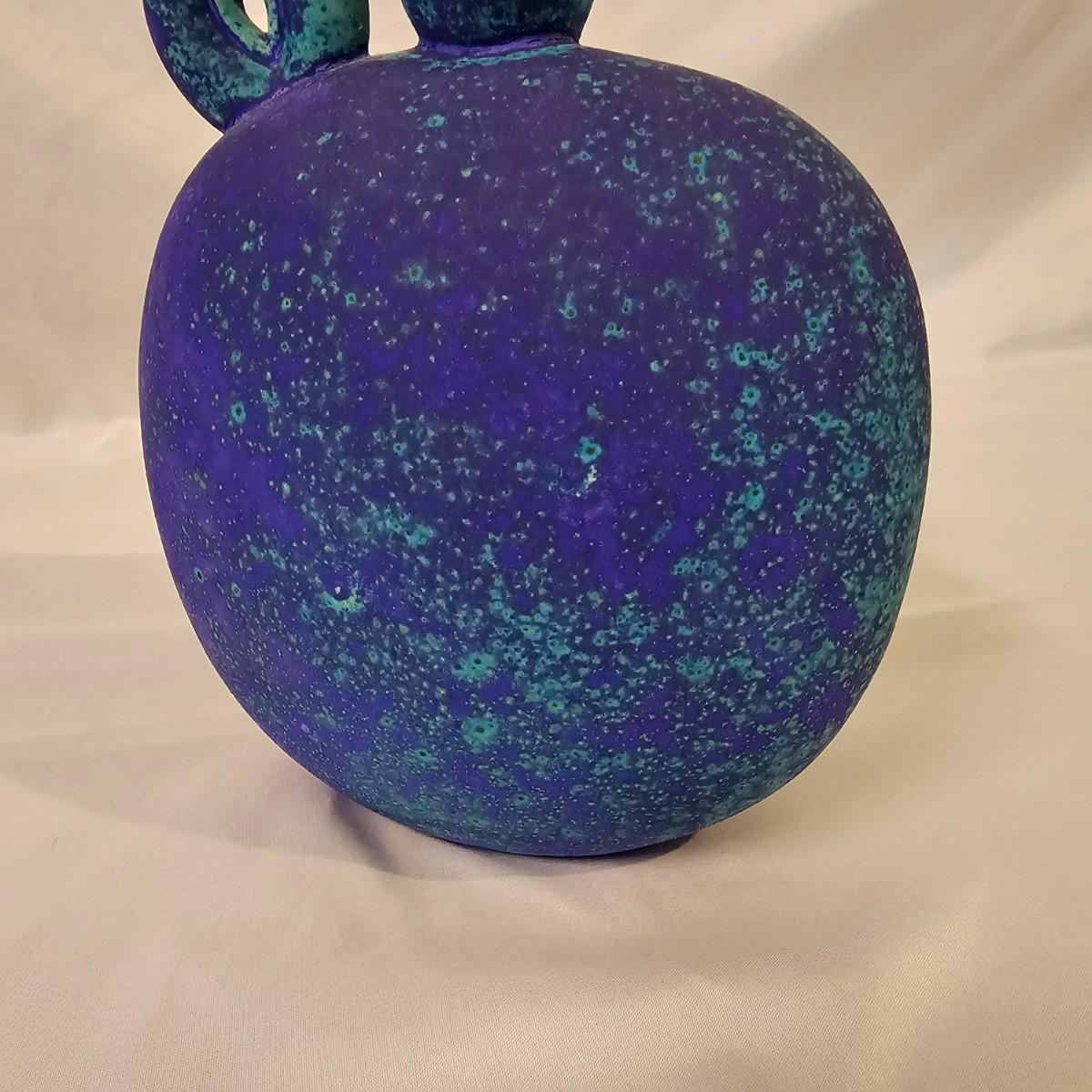 Vibrant purples and aquas adorn these three striking bottle shapes by N.C. artist Michael Sherrill. Similiar top styling with spouts and handles. A matte, nubby finish covers the exteriors. Tallest piece is 5" x 7" x 20"H, medium is 4" x 6" x 12" and shortest is 4" x 6.5" x 8.5"H. There appears to be residue from museum putty on the bottoms of the pieces. Some dust and debris may be stuck in this residue. See photos for details. Shipping available. Shipping can be costly. We suggest contacting our preferred local shipping provider, Postage Express, with dimensions and getting an estimate before bidding: (828) 670-5501 or shipping@postageexpressnc.com