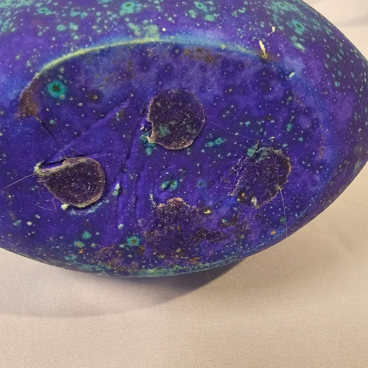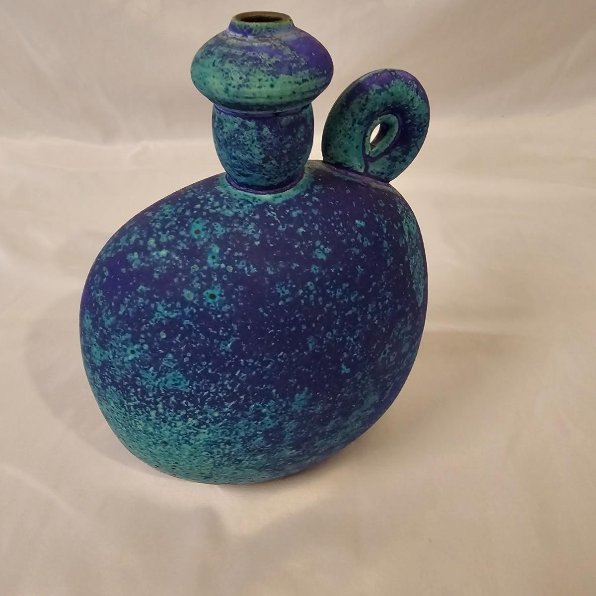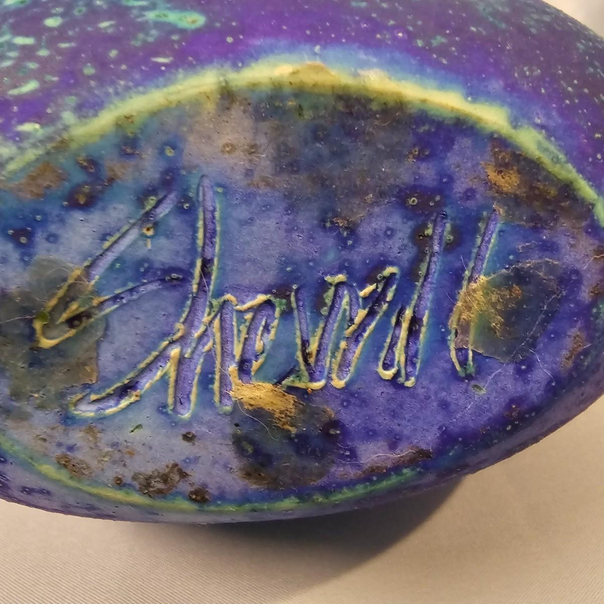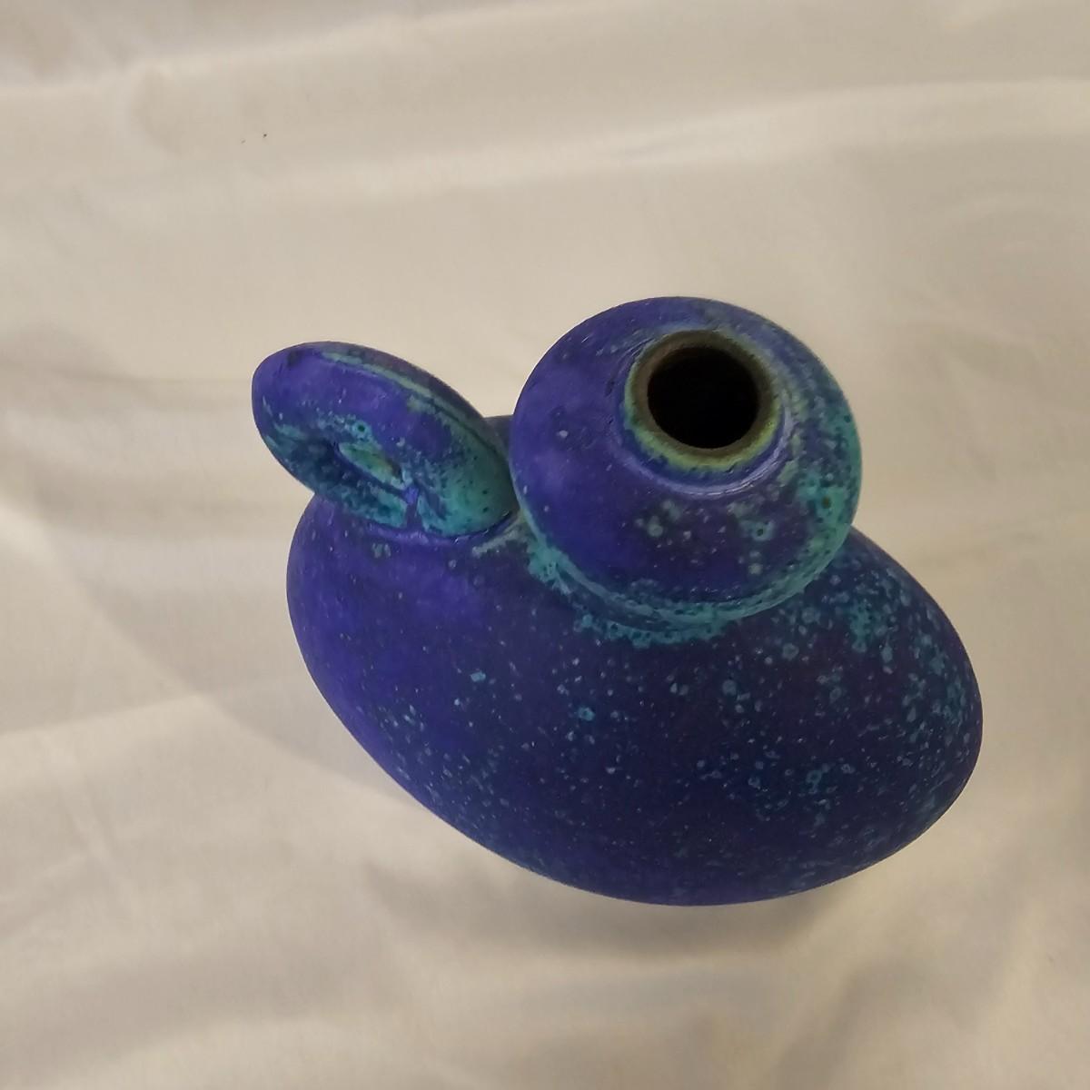 Vibrant purples and aquas adorn these three striking bottle shapes by N.C. artist Michael Sherrill. Similiar top styling with spouts and handles. A matte, nubby finish covers the exteriors. Tallest piece is 5" x 7" x 20"H, medium is 4" x 6" x 12" and shortest is 4" x 6.5" x 8.5"H. There appears to be residue from museum putty on the bottoms of the pieces. Some dust and debris may be stuck in this residue. See photos for details. Shipping available. Shipping can be costly. We suggest contacting our preferred local shipping provider, Postage Express, with dimensions and getting an estimate before bidding: (828) 670-5501 or shipping@postageexpressnc.com