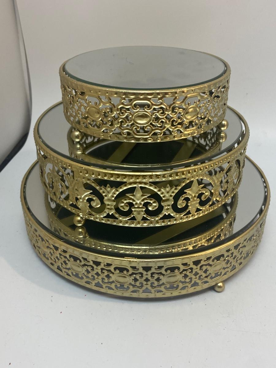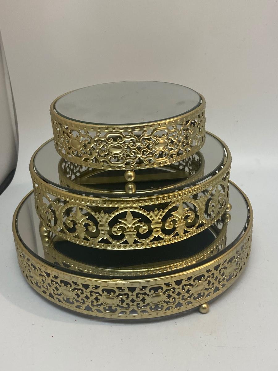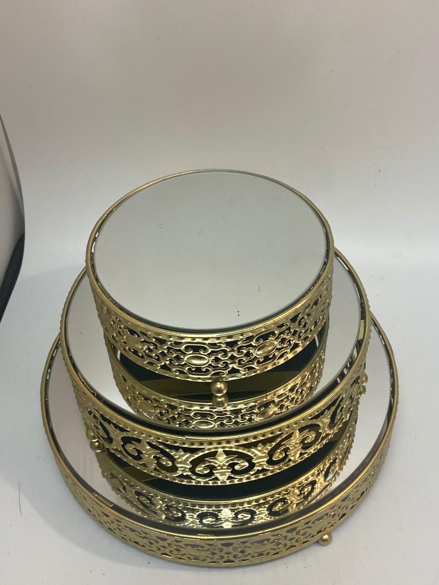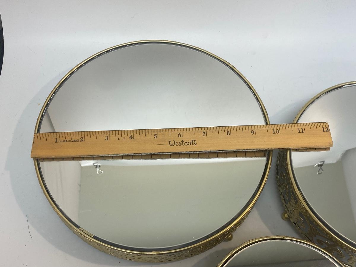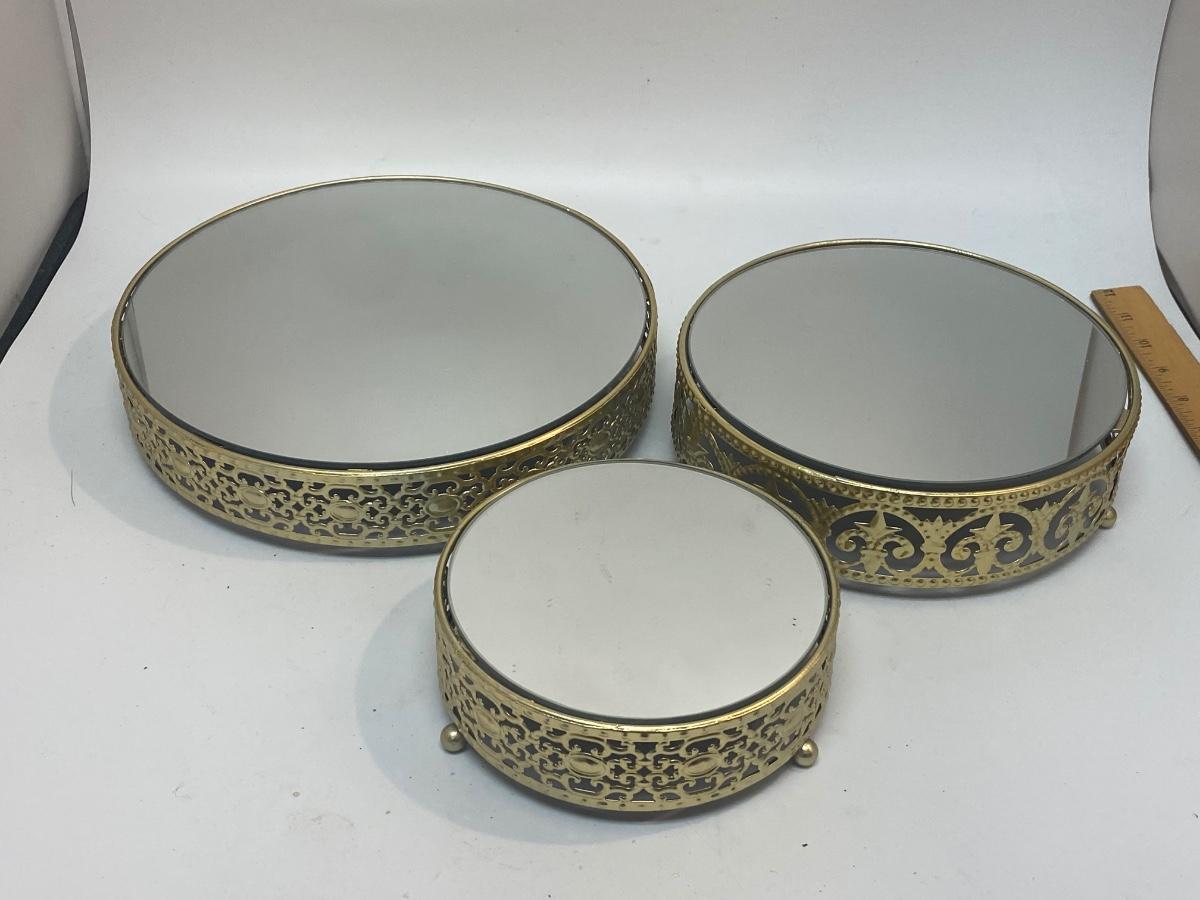 Set of Three Mirrored Display Trays. Great for figurines or as candle bases. Good condition. Largest is almost 10" diameter.