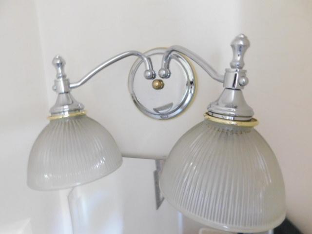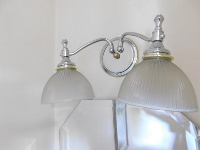 Set of Three Nickel Finish Double Arm Vanity Light Fixtures with Ribbed Shades bring tools to remove from wall