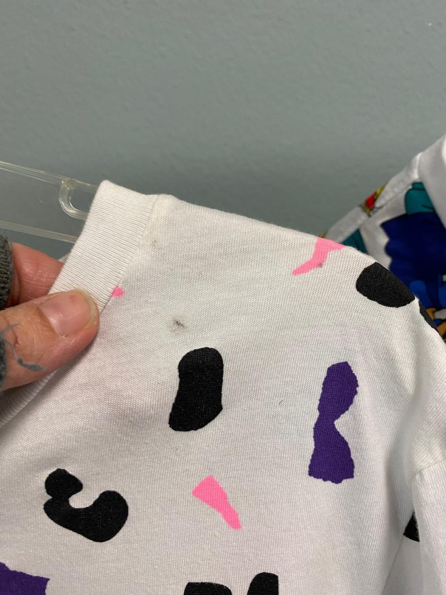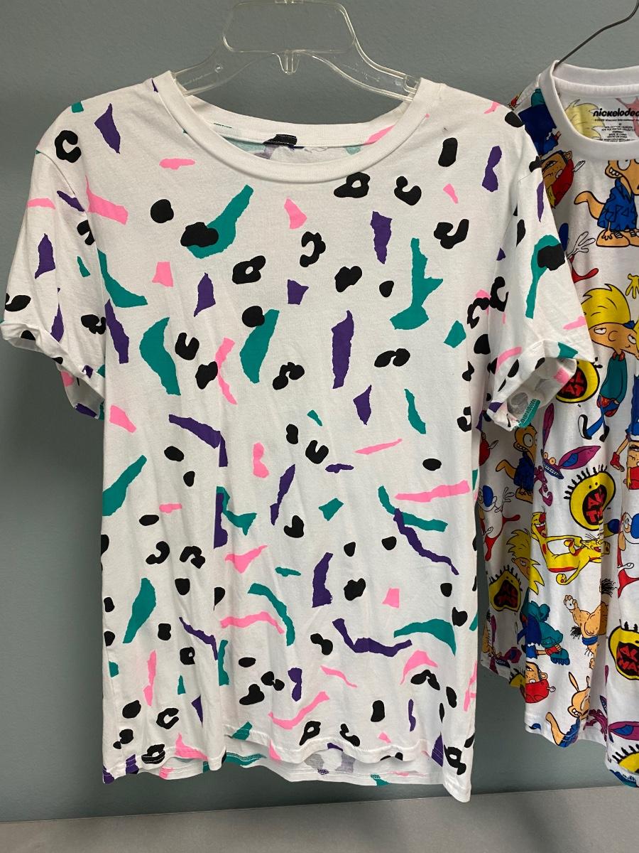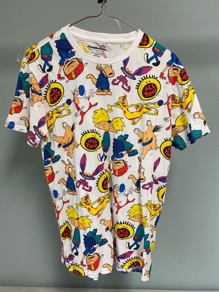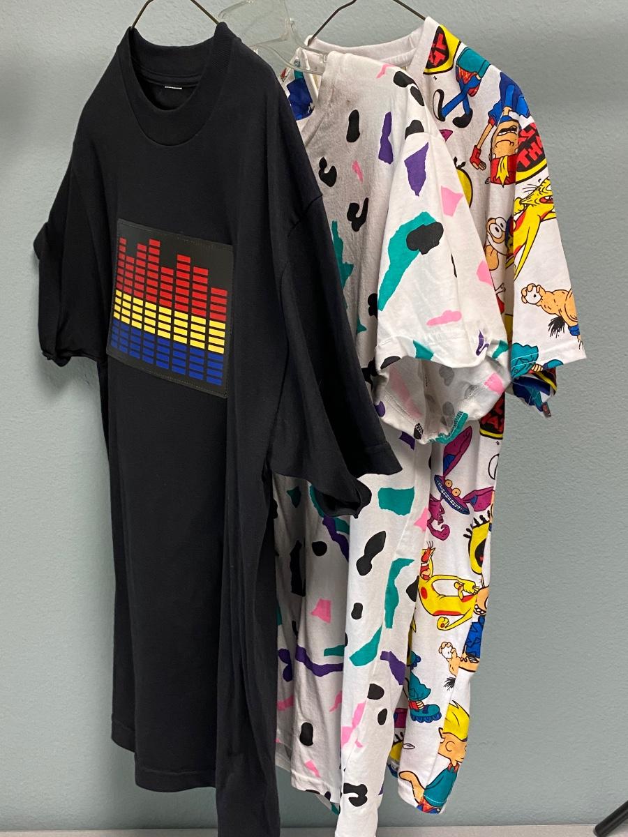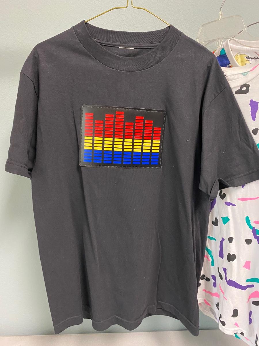 Set of 3 novelty graphic t-shirts. All in good condition. The black shirt is battery op, has a small mic box and the equalizer bars light up with sound. One is a retro looking 1980s color design. The last is a Nickelodeon flash back cartoon characters shirt. All are about the same size, Medium.