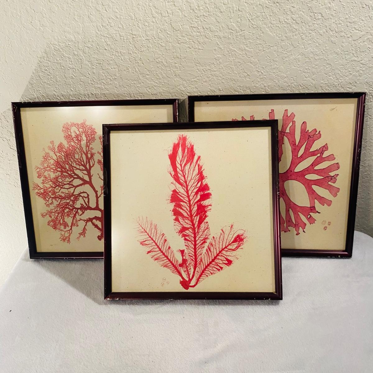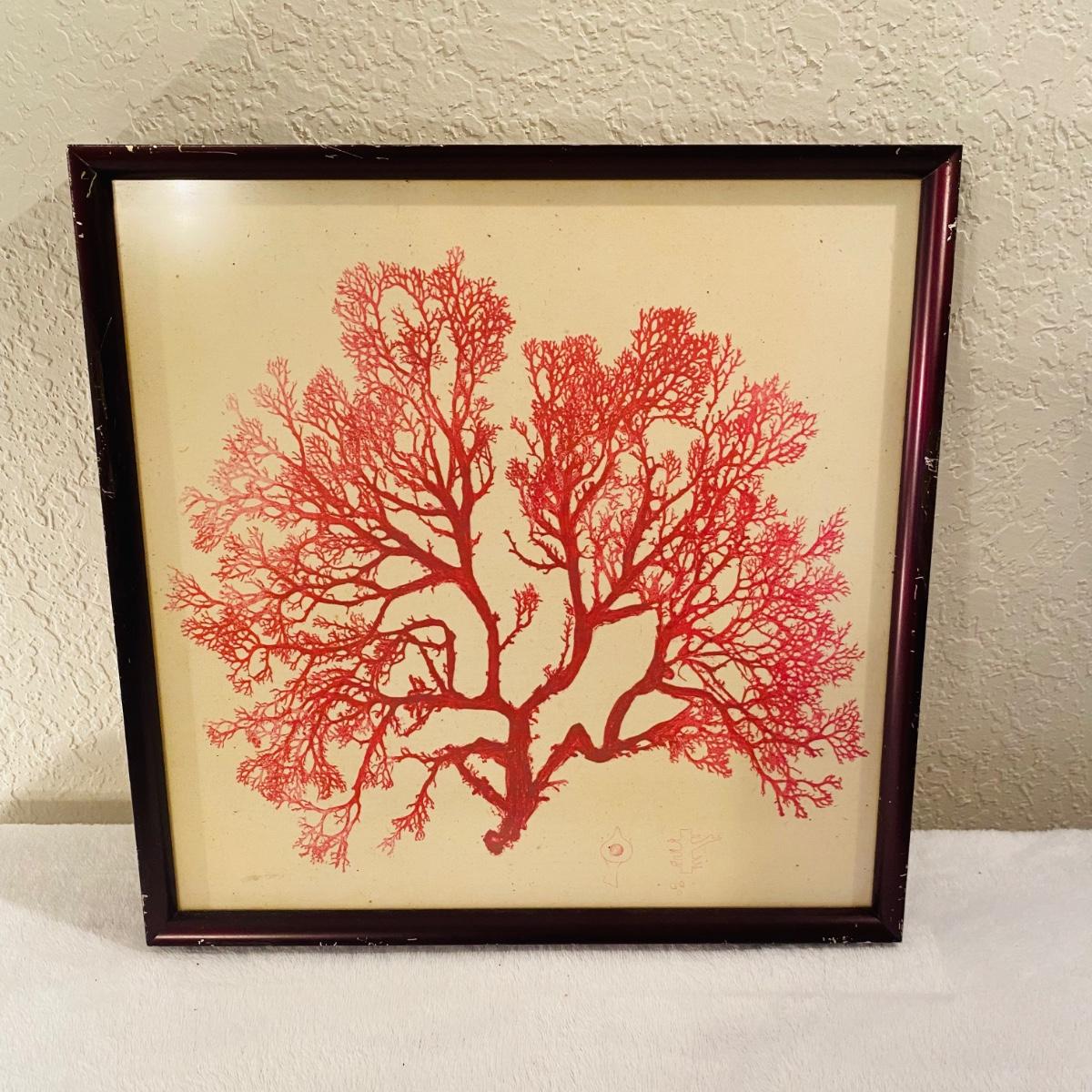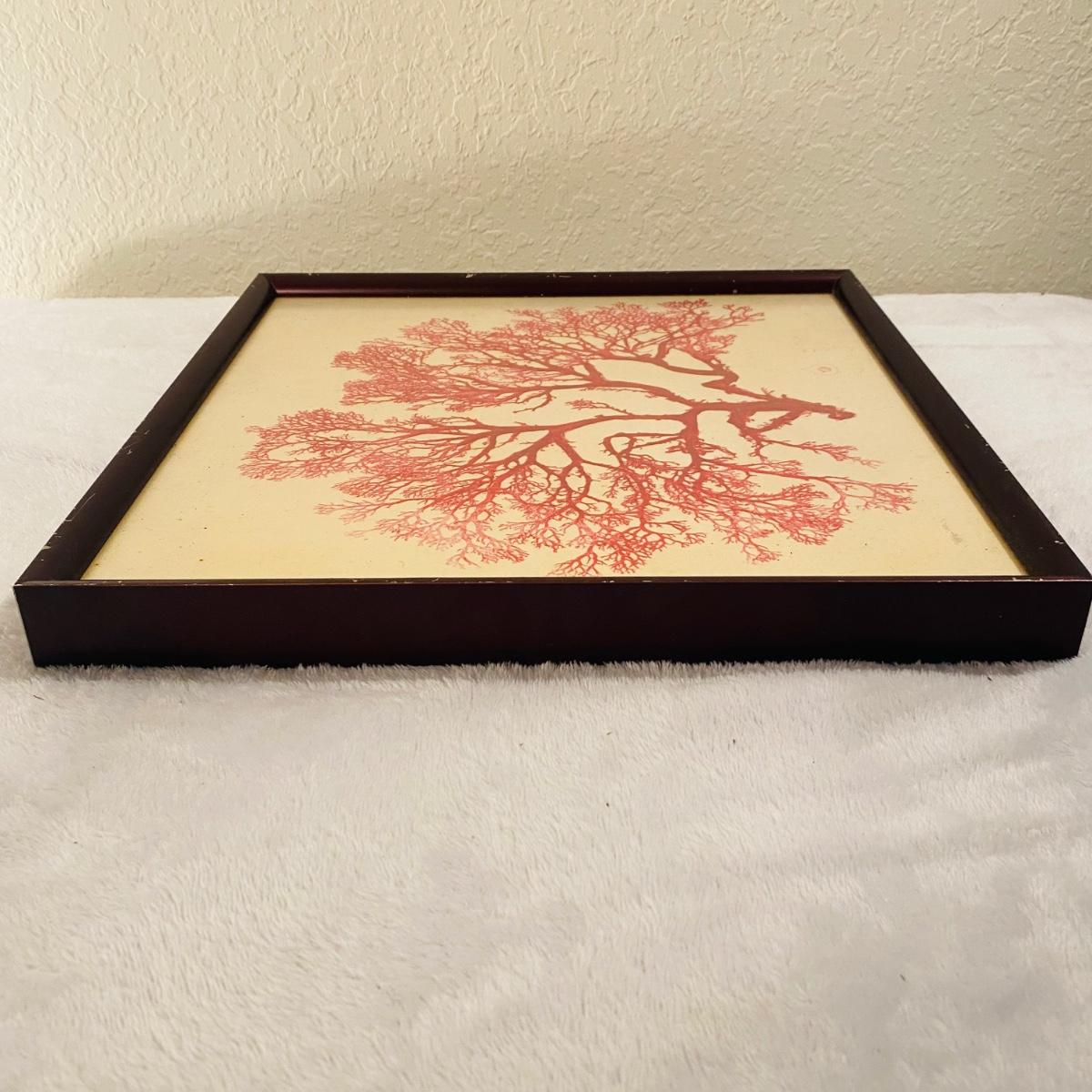 14” square framed red coral prints in Michael’s frames. Frames are 1.5” thick.