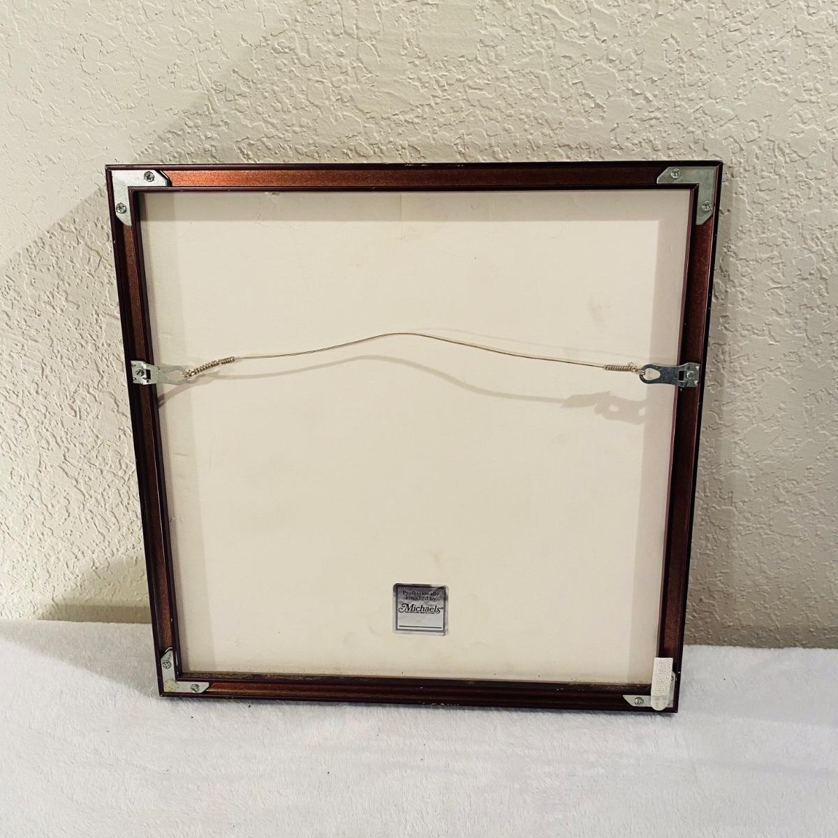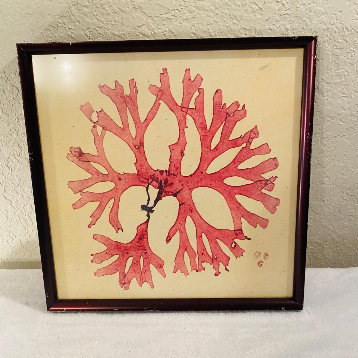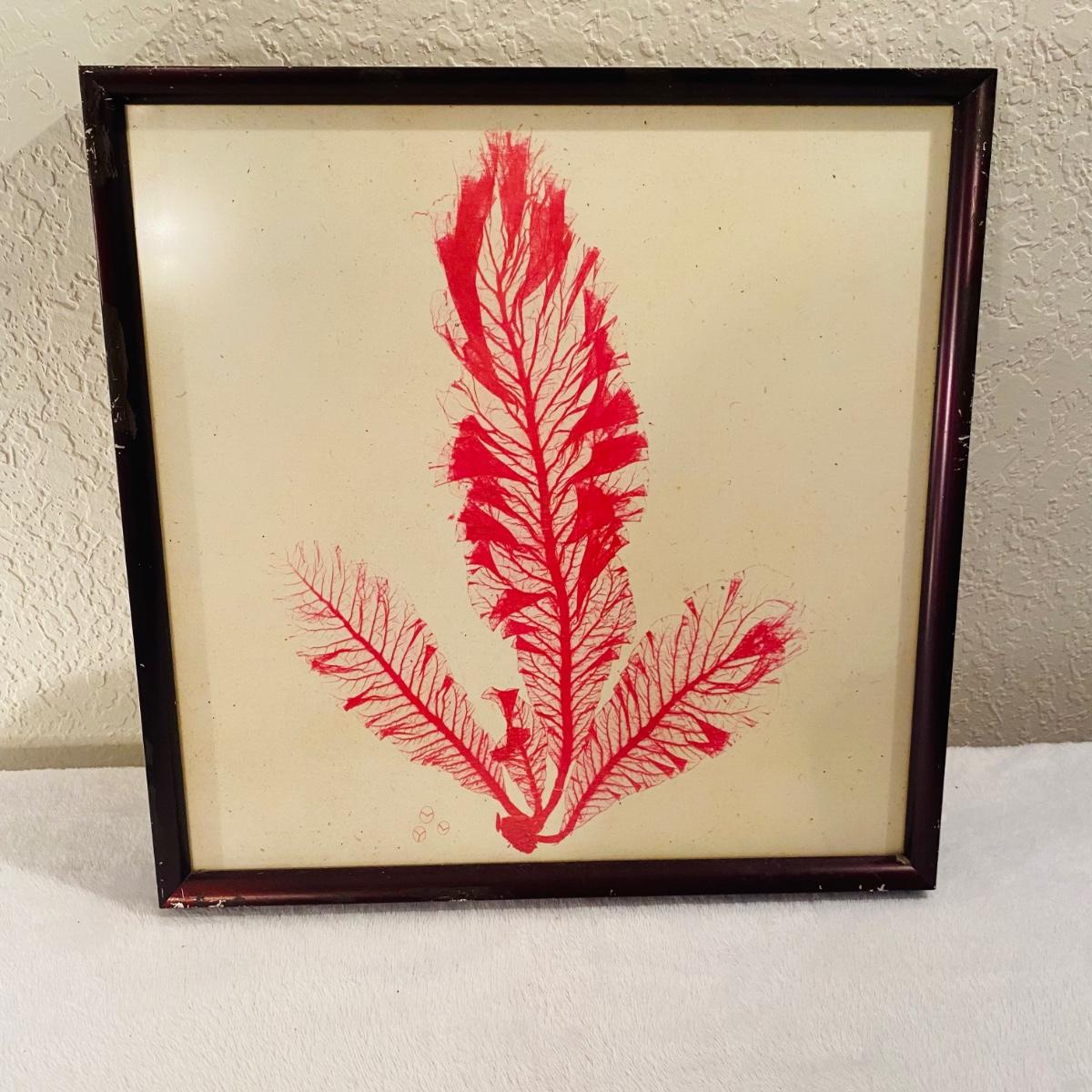14” square framed red coral prints in Michael’s frames. Frames are 1.5” thick.