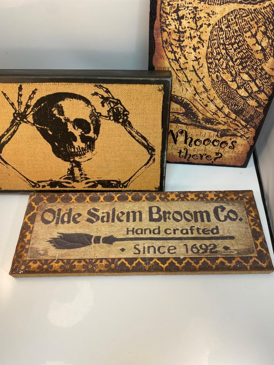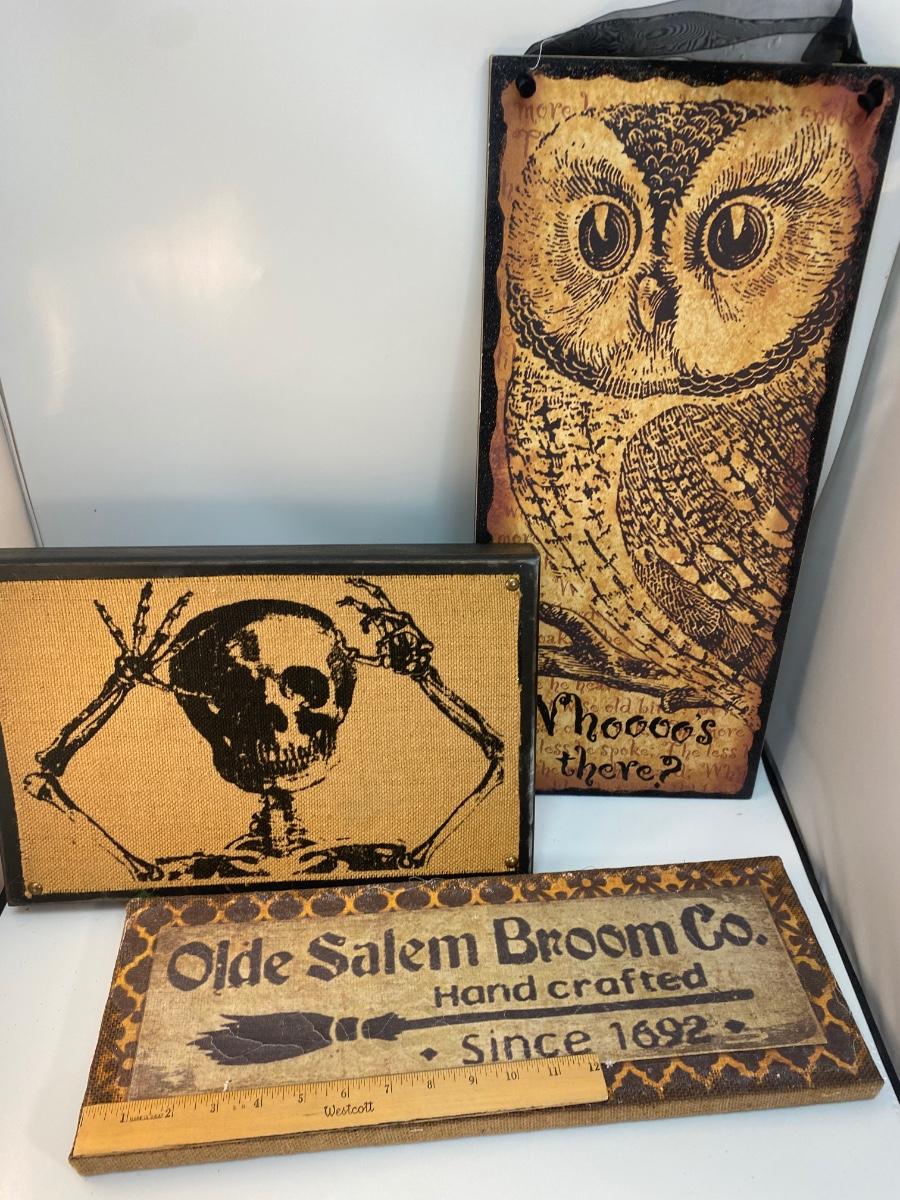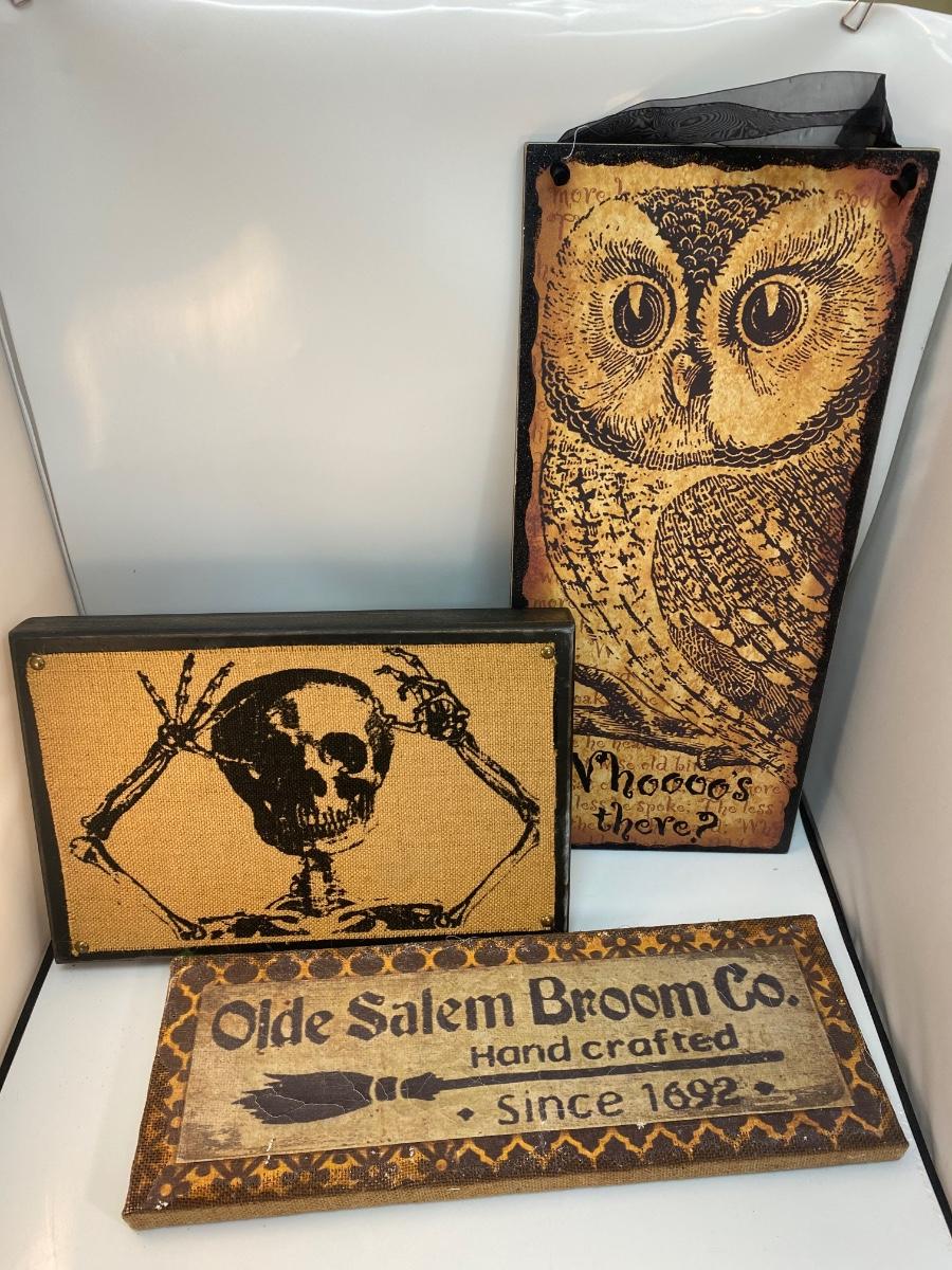 Set of Three Rustic Style Halloween Seasonal Spooky Wall Signs Decor. All in good useable condition. Over 12" sizes.
