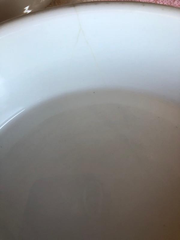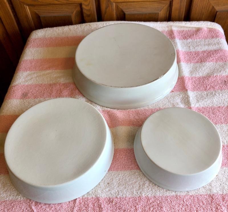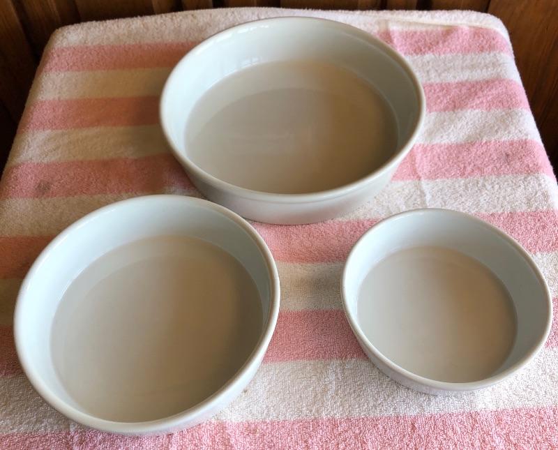 Set of three shallow casserole dishes. There is a fine line crack in one.
