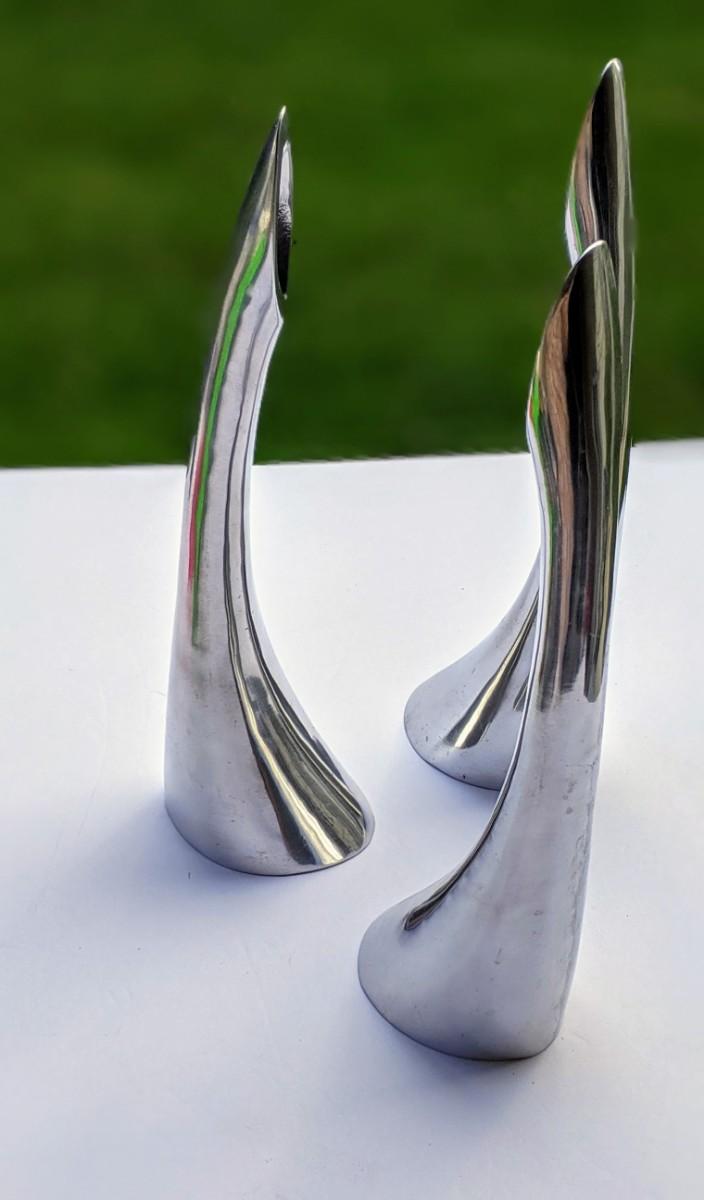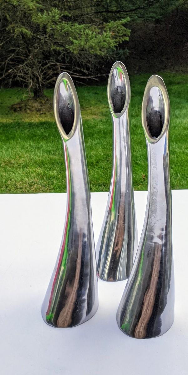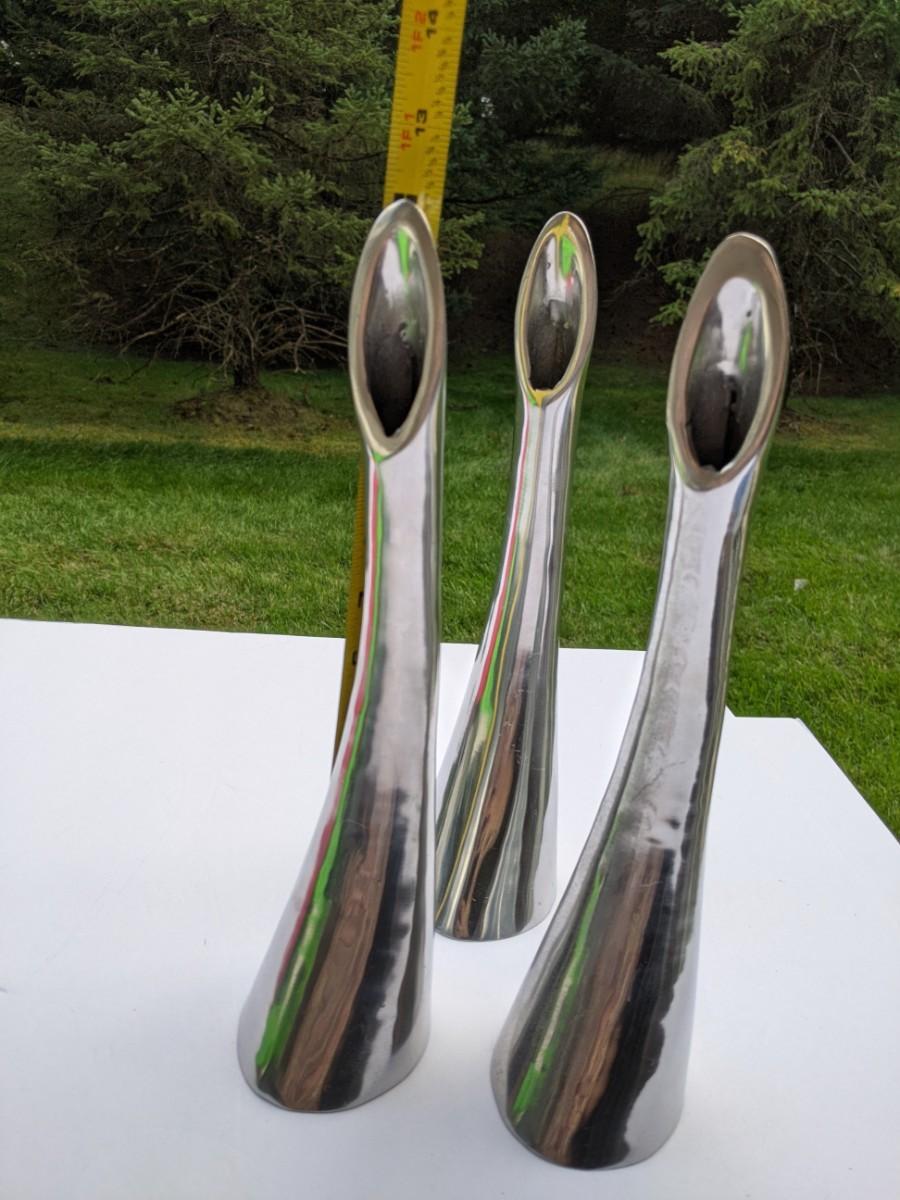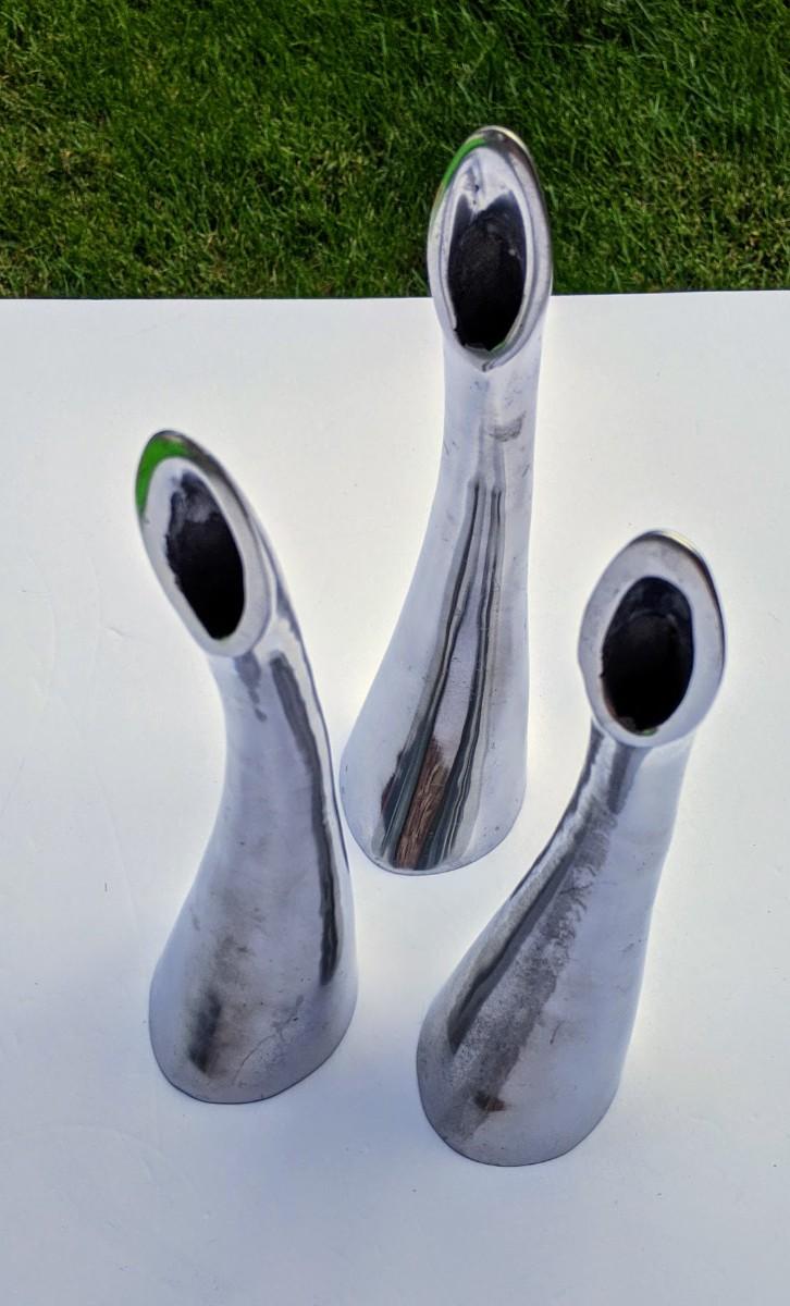 Set of three silver metal vases. Please see all pictures as they are the best representation of the items. The pictures show condition, measurements if taken, and what is included in the lot. Due to the large amount that we photograph and the time frame, we are not always able to take measurements. All items unless noted, are pre-owned and have been used. If you purchased furniture, you must bring help. We do not allow one person to carry large furniture out on their own. Bring help, tools and a truck for the safety of our client’s homes, and your personal safety. Company policy. Thank you.