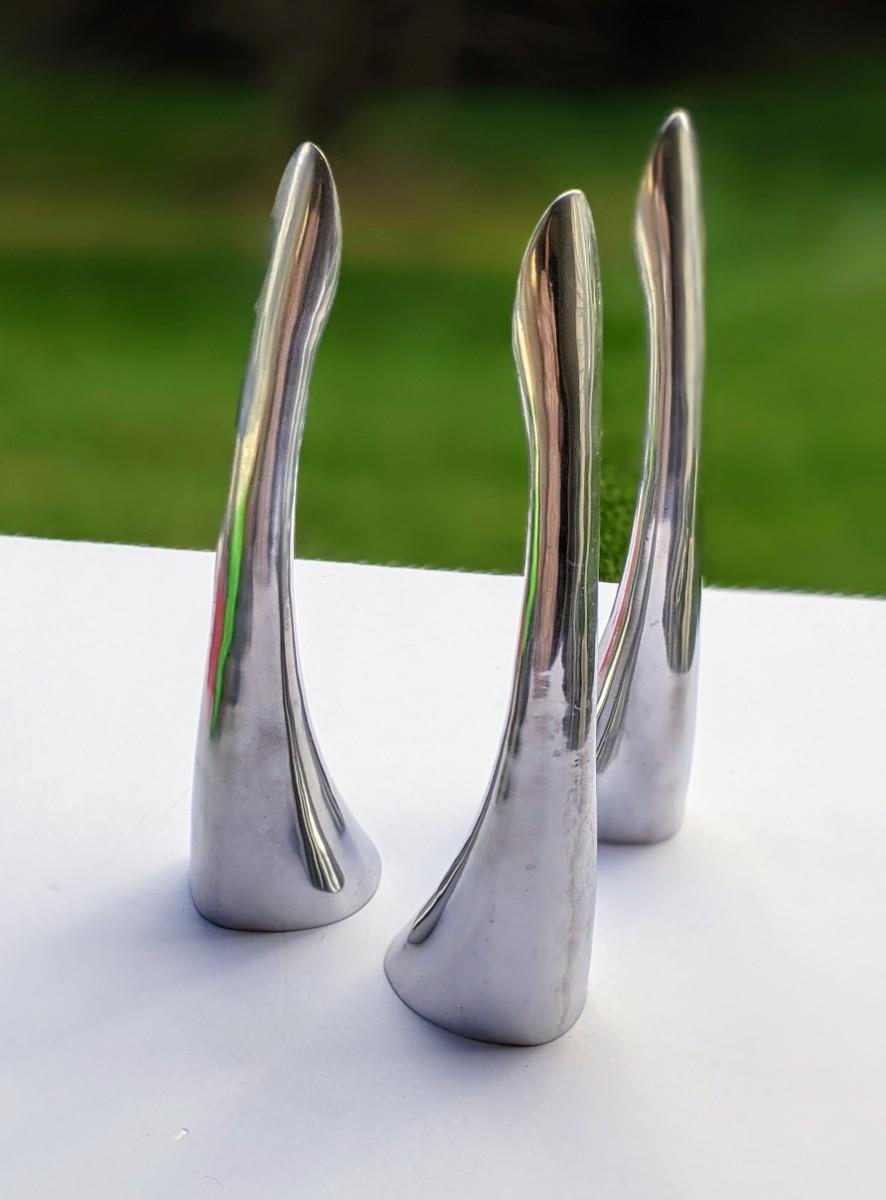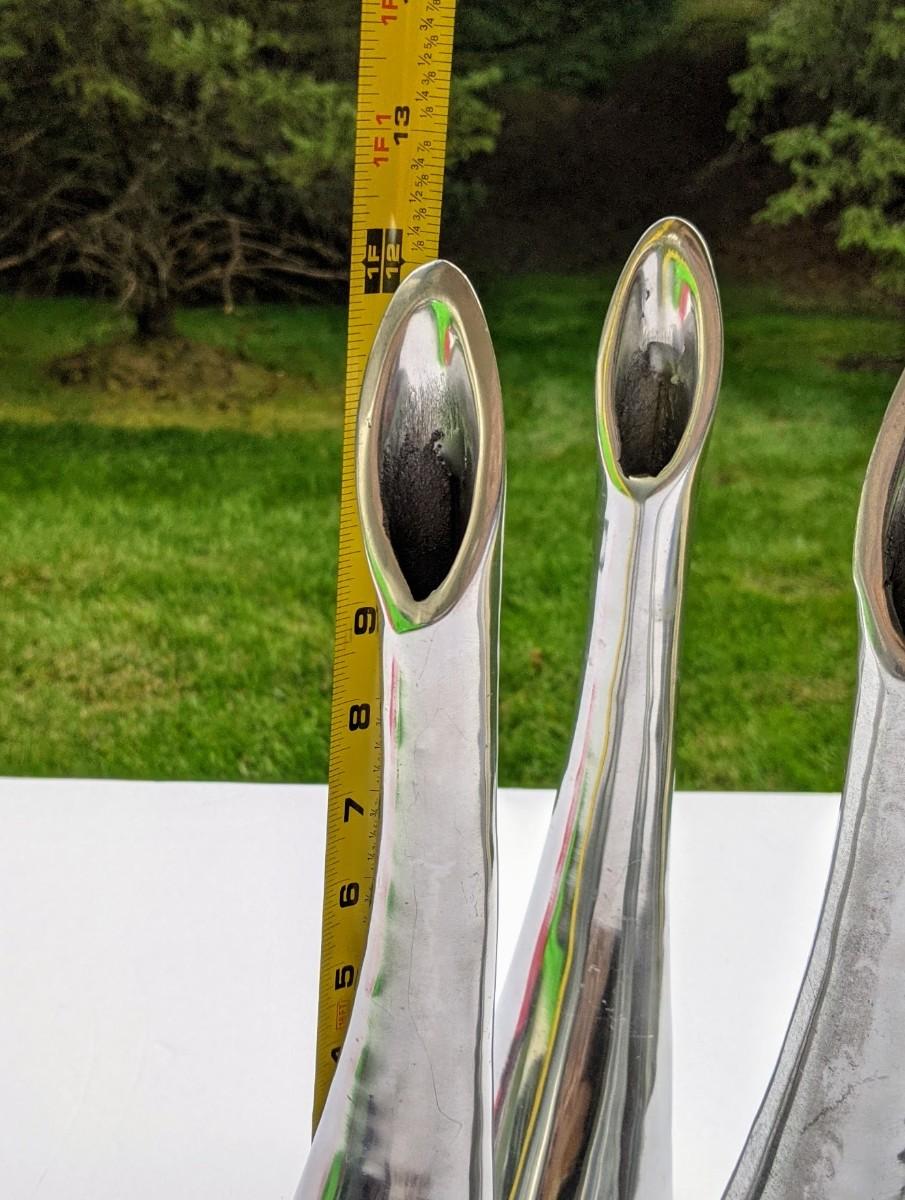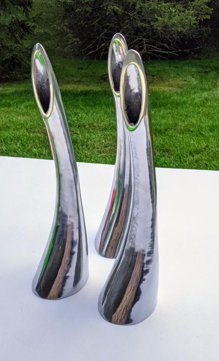 Set of three silver metal vases. Please see all pictures as they are the best representation of the items. The pictures show condition, measurements if taken, and what is included in the lot. Due to the large amount that we photograph and the time frame, we are not always able to take measurements. All items unless noted, are pre-owned and have been used. If you purchased furniture, you must bring help. We do not allow one person to carry large furniture out on their own. Bring help, tools and a truck for the safety of our client’s homes, and your personal safety. Company policy. Thank you.