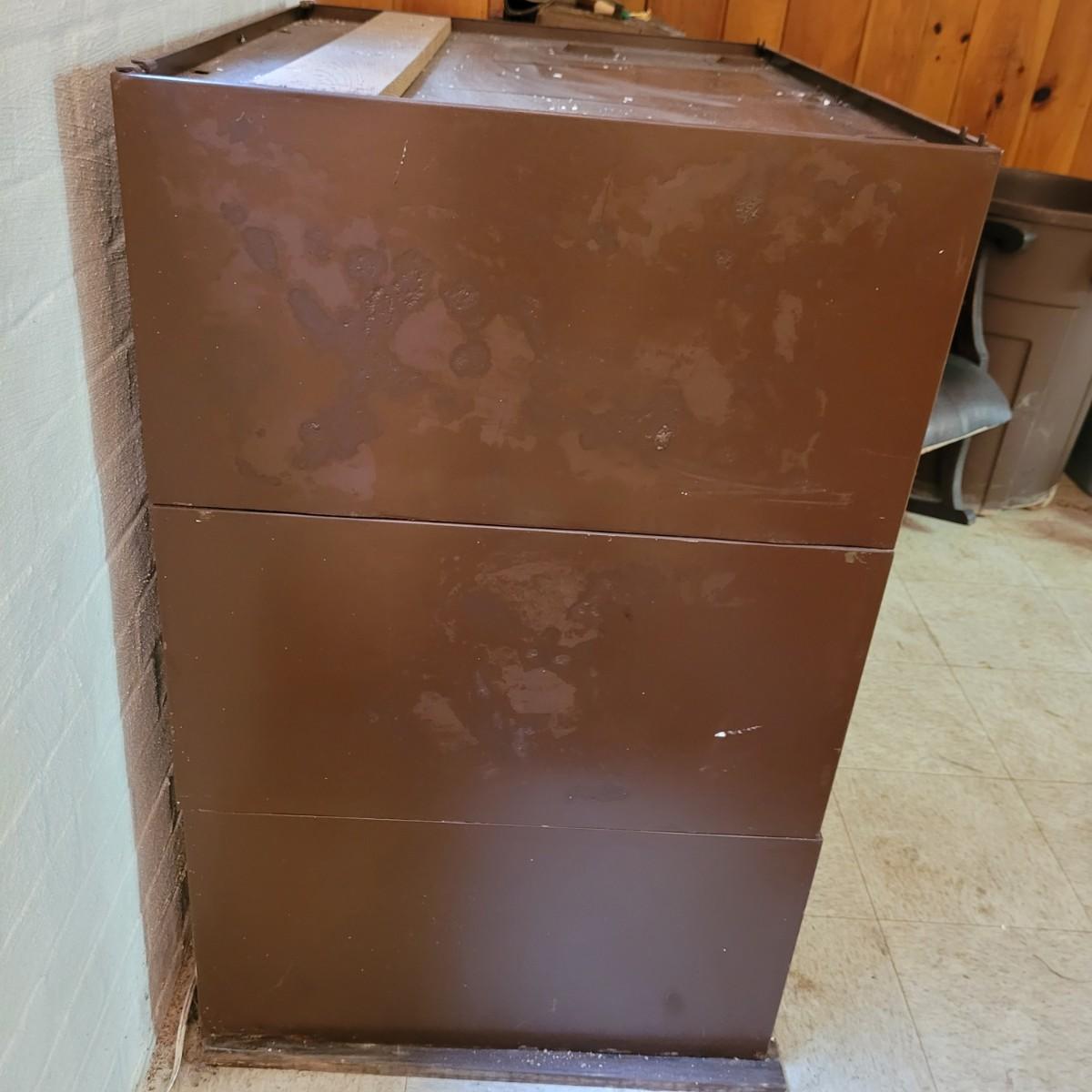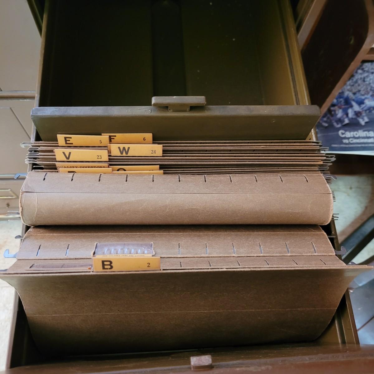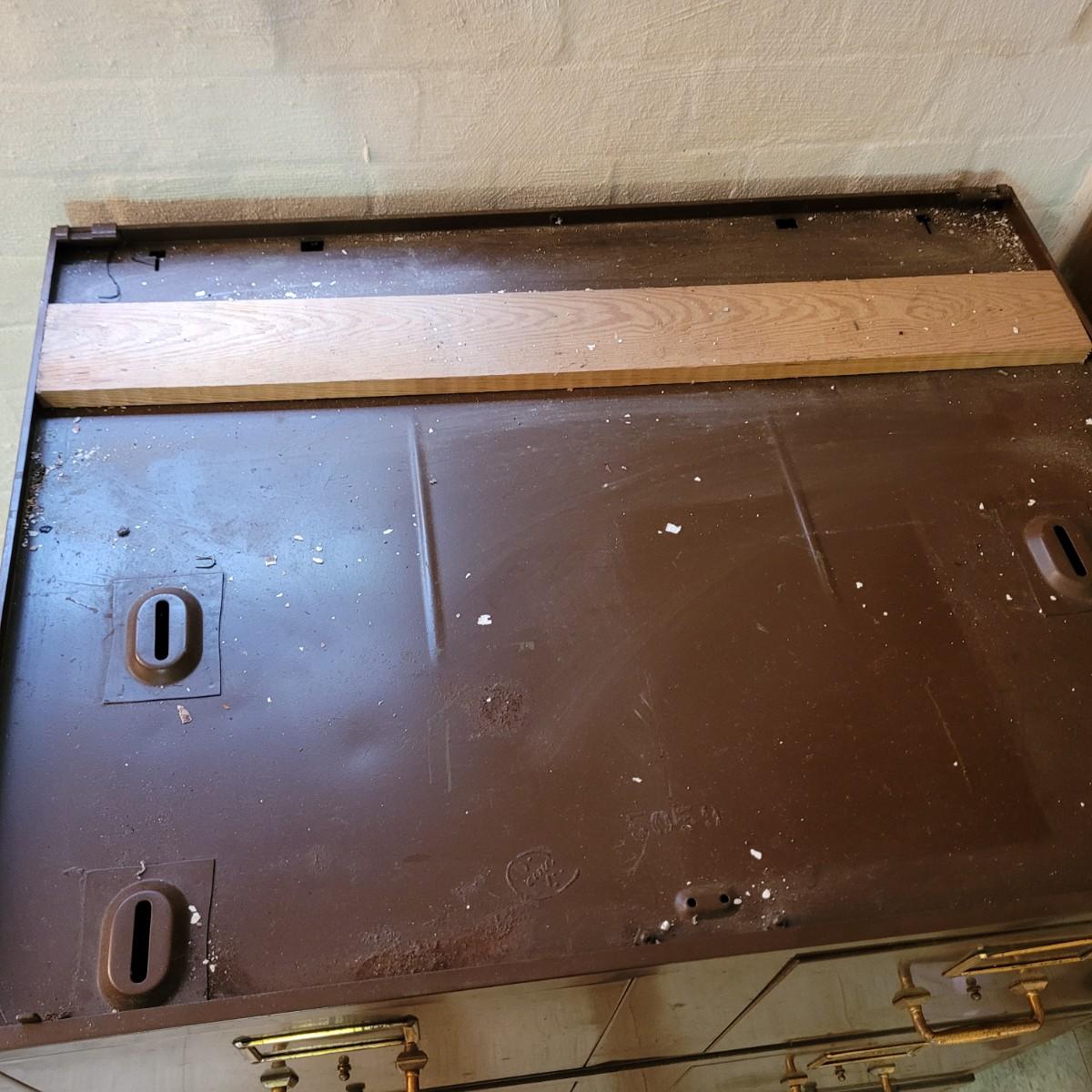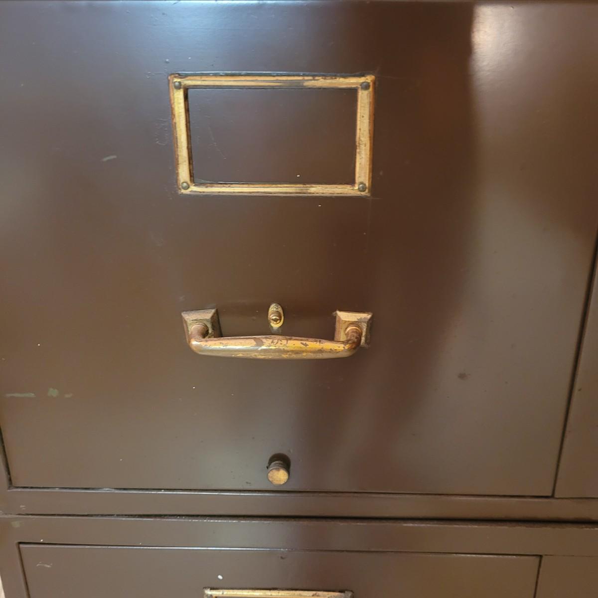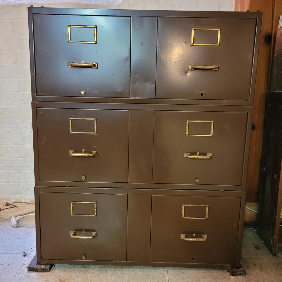 Set of three stackable side-by-side metal file cabinets, appear in good working condition. All drawers open. One drawer has file folders, others are empty. Some rusting on side that is exposed. Individual cabinets measure approximately 33"L x25"W x13"H. Stacked height 39.5"H. Local pickup only.