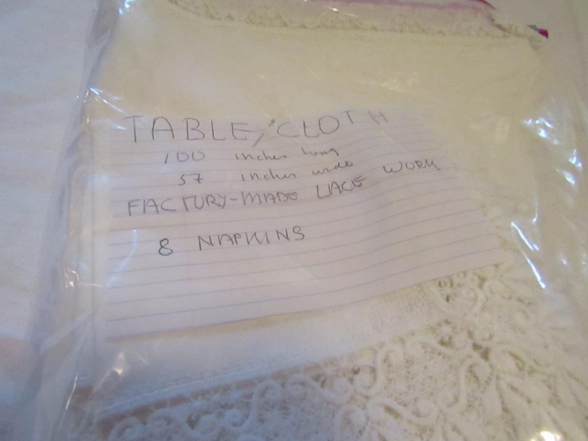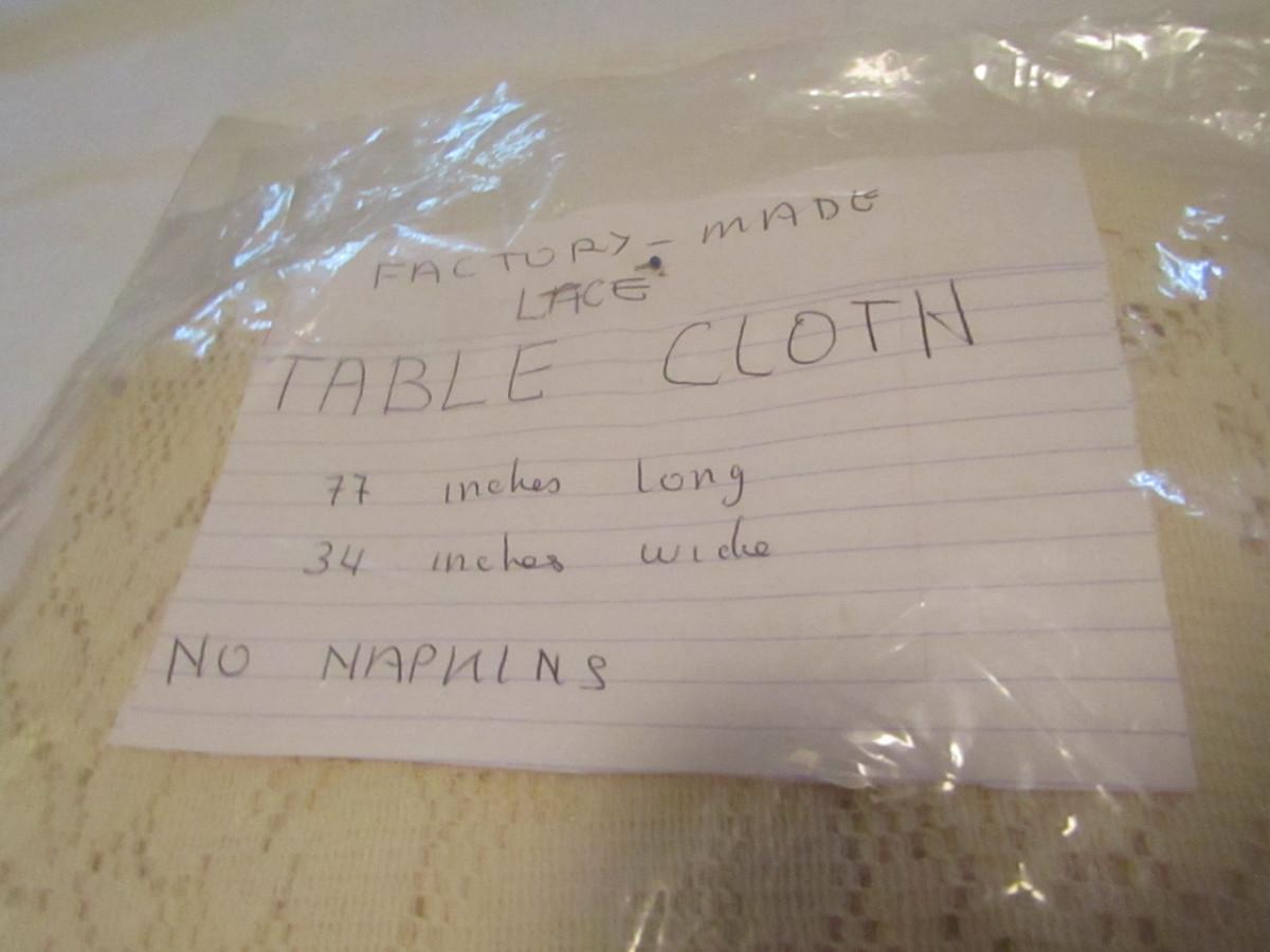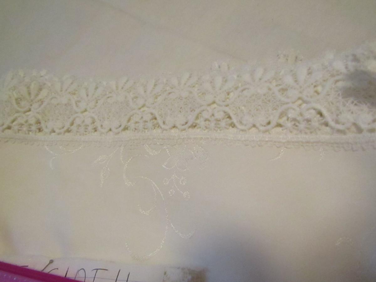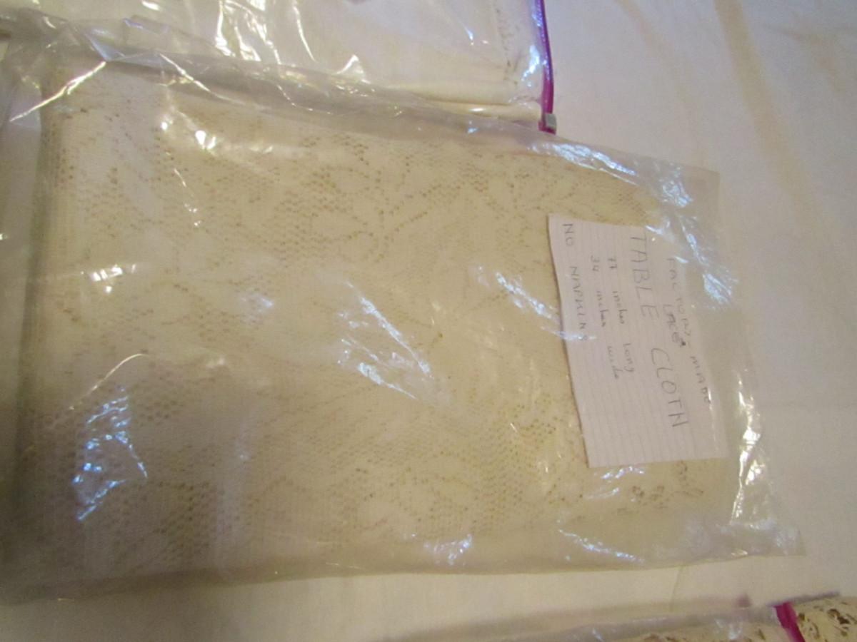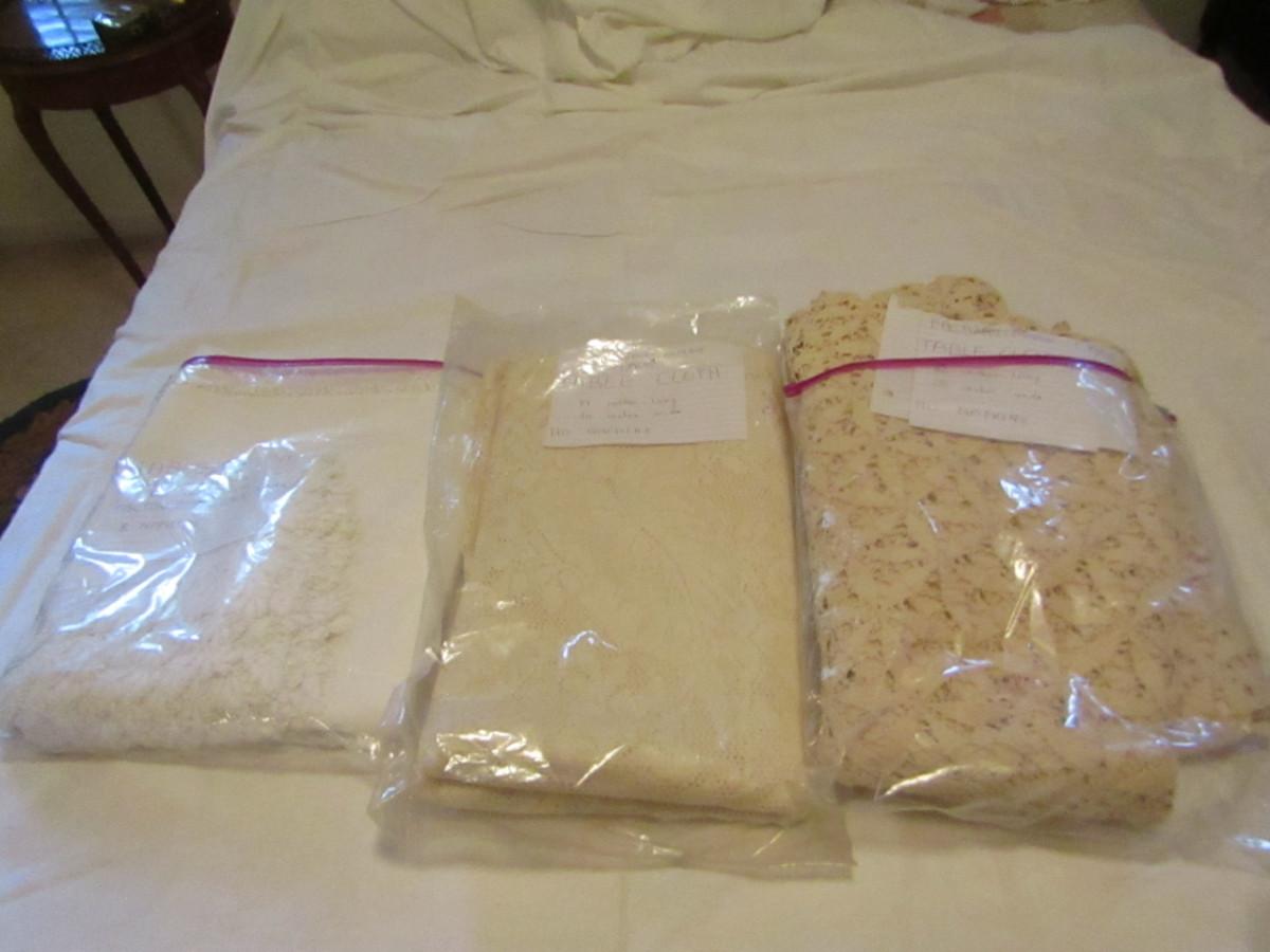 Set of Three Tablecloths with Factory Made Lacework- (#18). #1- tablecloth is approx 100" x 57" and has 8 napkins. #2- tablecloth is approx 77" x 34". #3- tablecloth is approx 82" x 68".