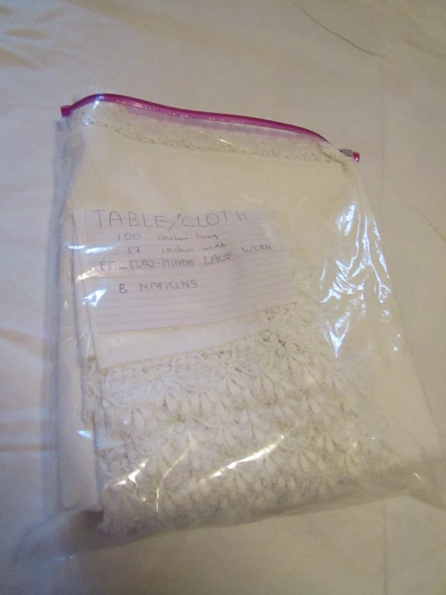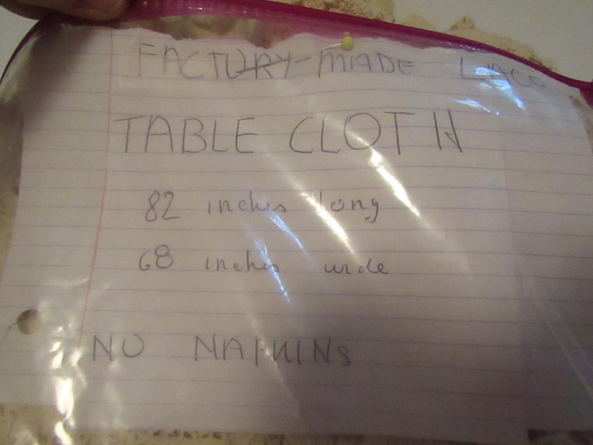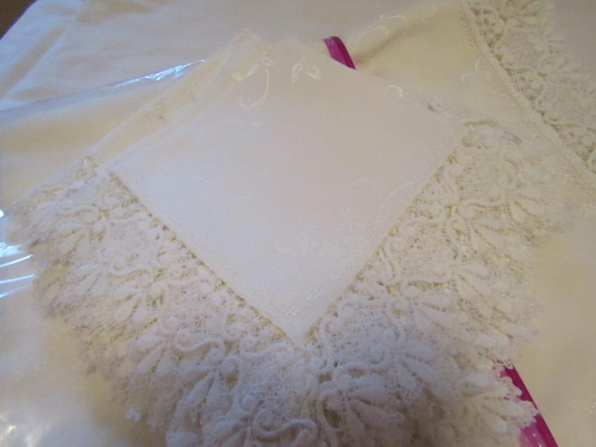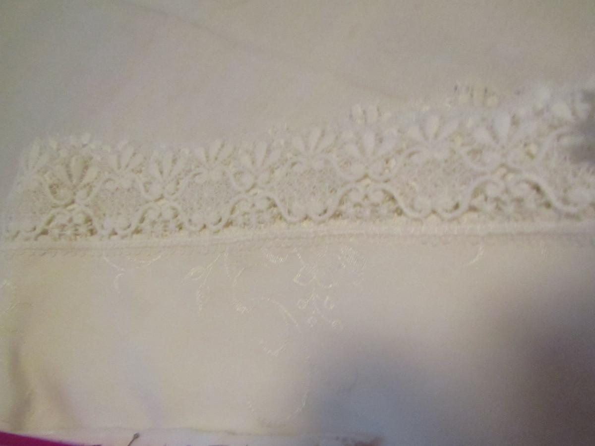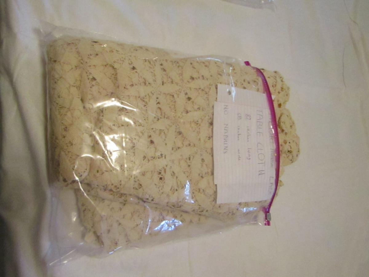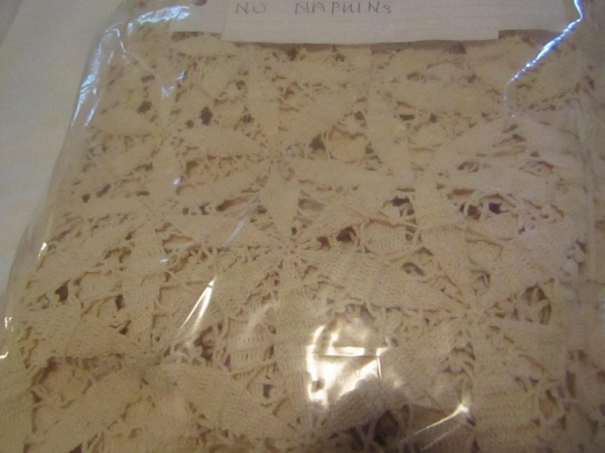 Set of Three Tablecloths with Factory Made Lacework- (#18). #1- tablecloth is approx 100" x 57" and has 8 napkins. #2- tablecloth is approx 77" x 34". #3- tablecloth is approx 82" x 68".