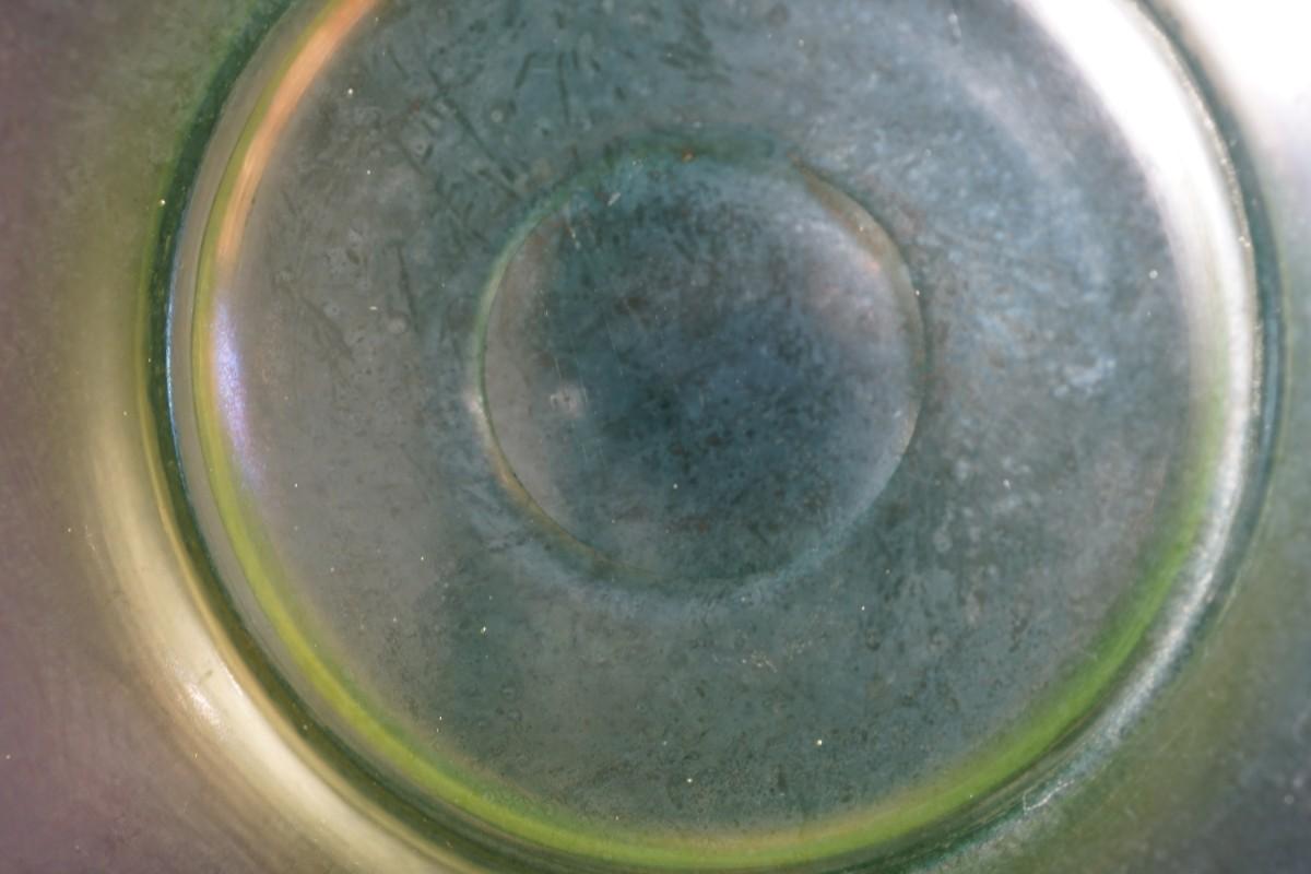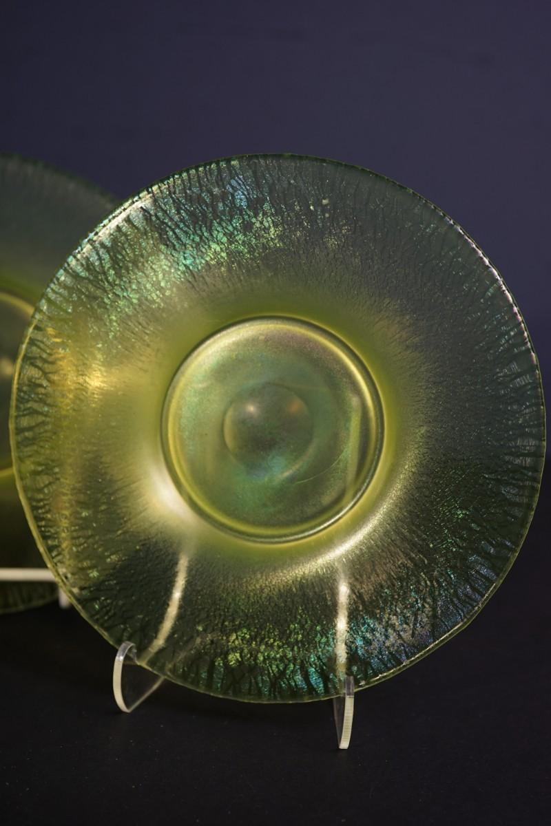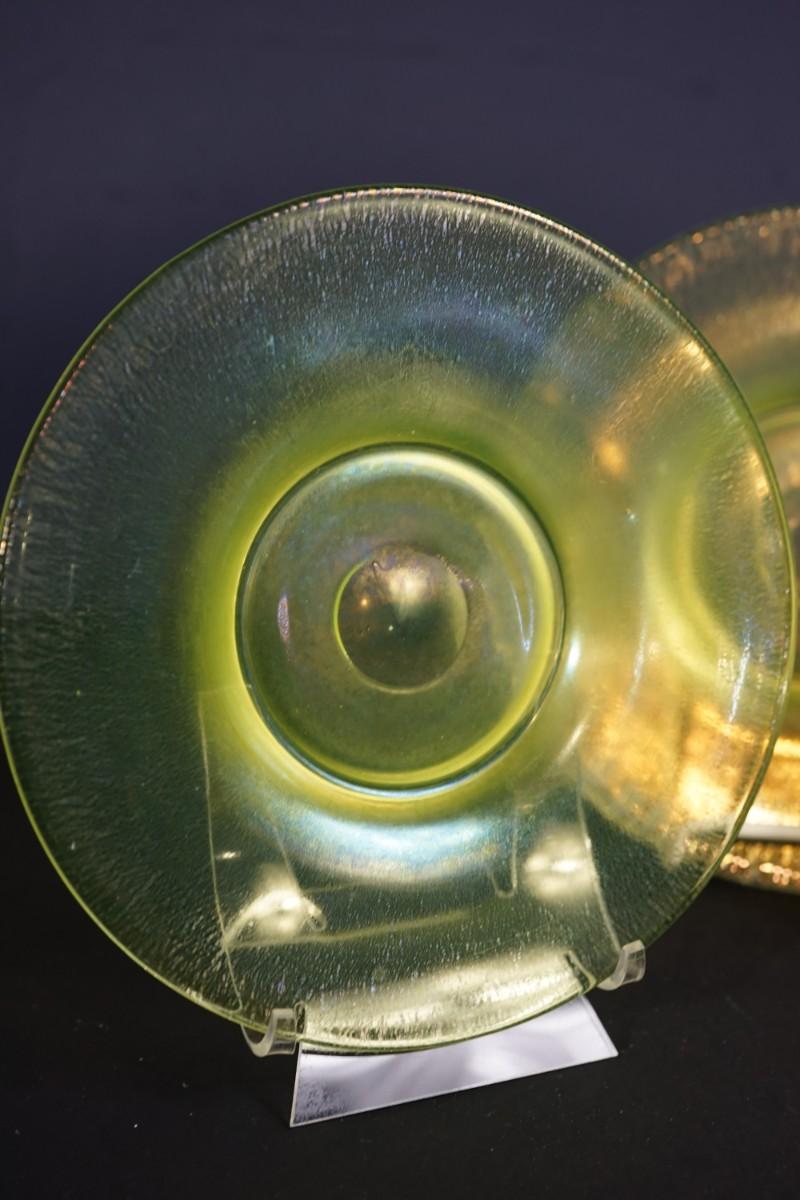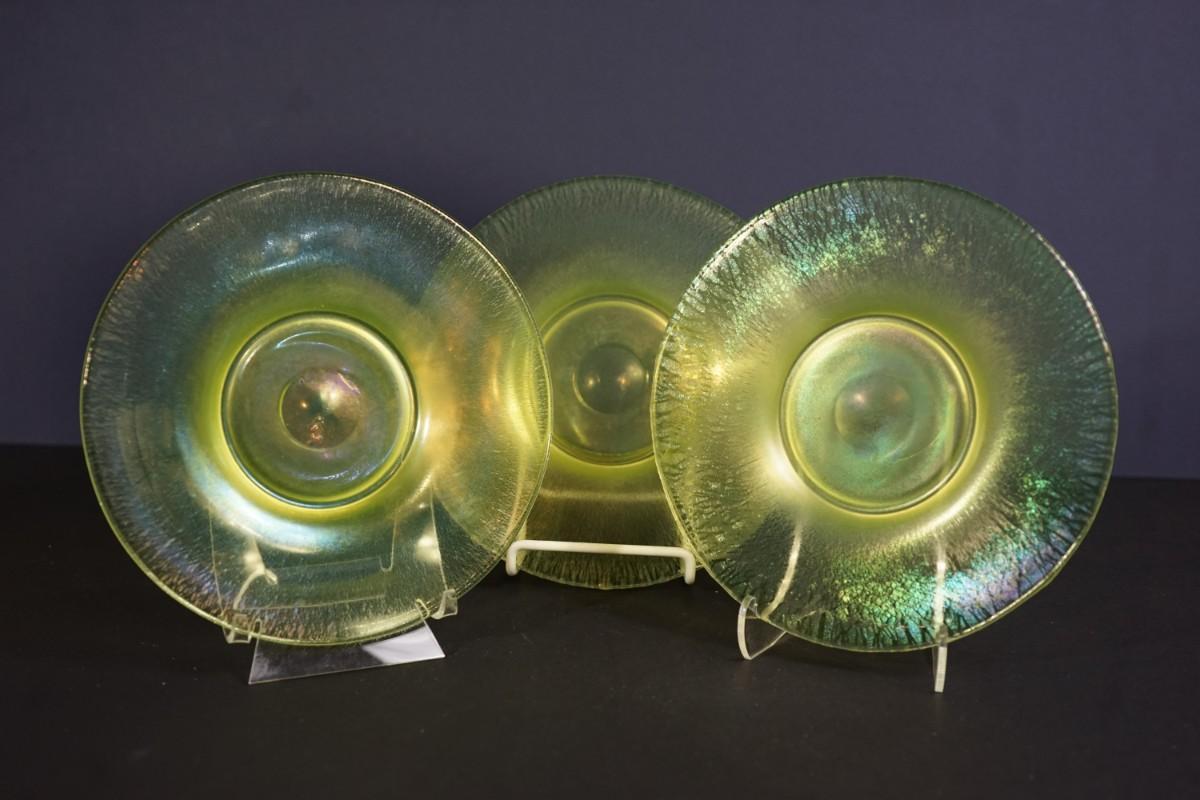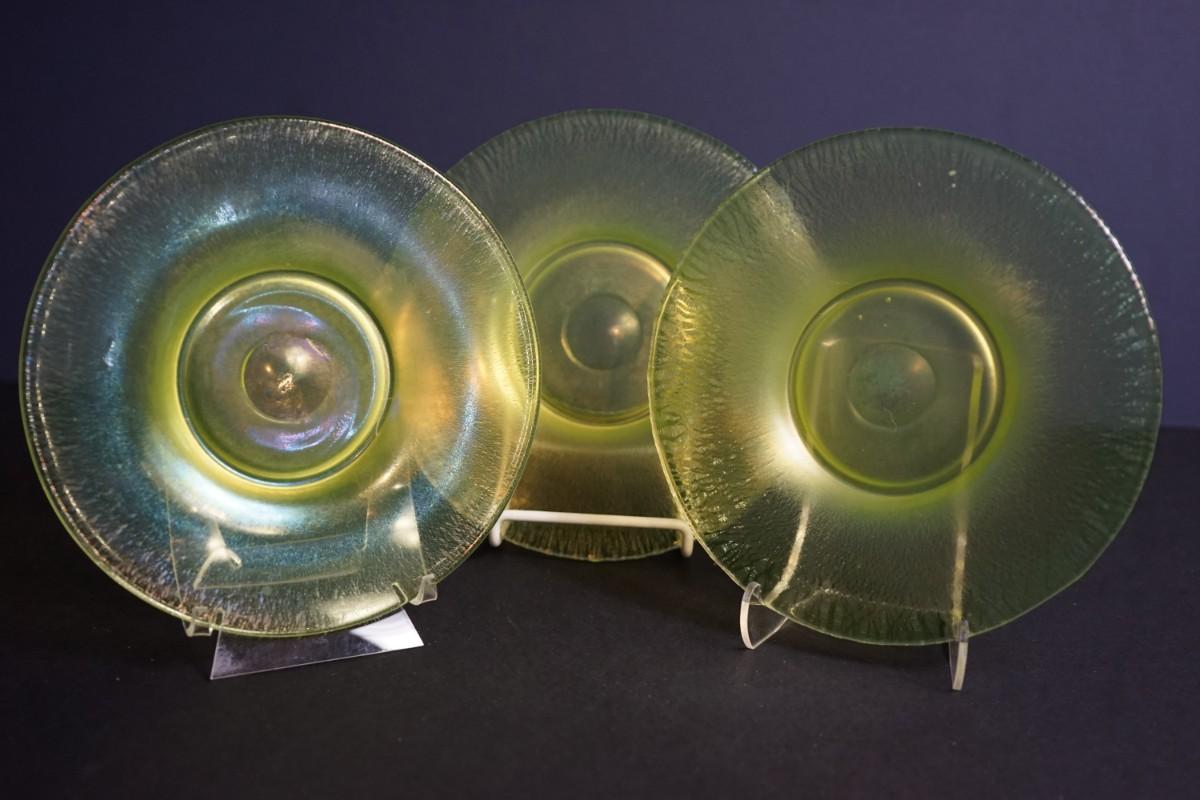group of 3 8" vaseline glass stretch glass plates. The have the look of favrille glass, multi color in the right light,