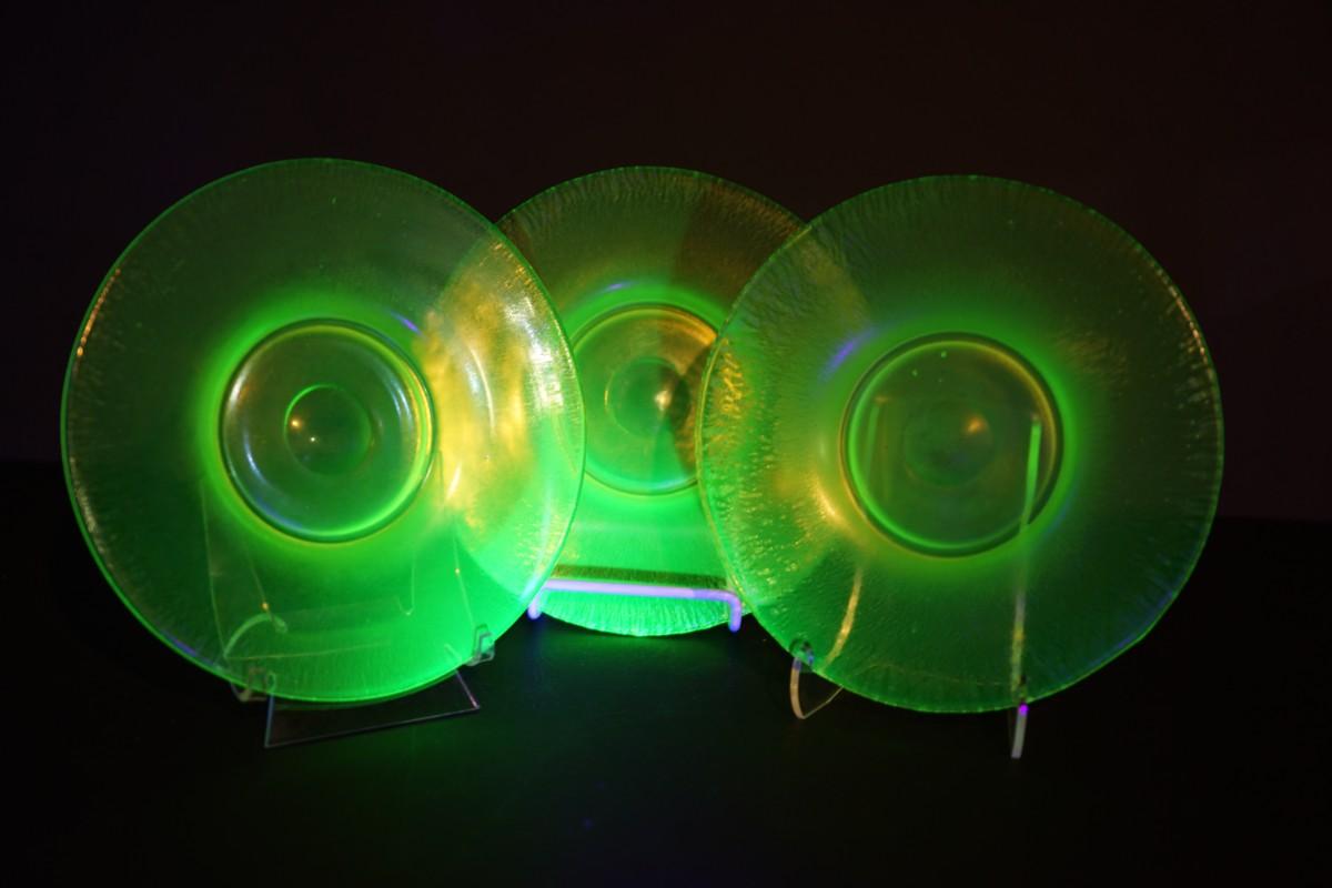SET OF THREE VASELINE "STRETCH" GLASS 8" PLATES -URANIUM