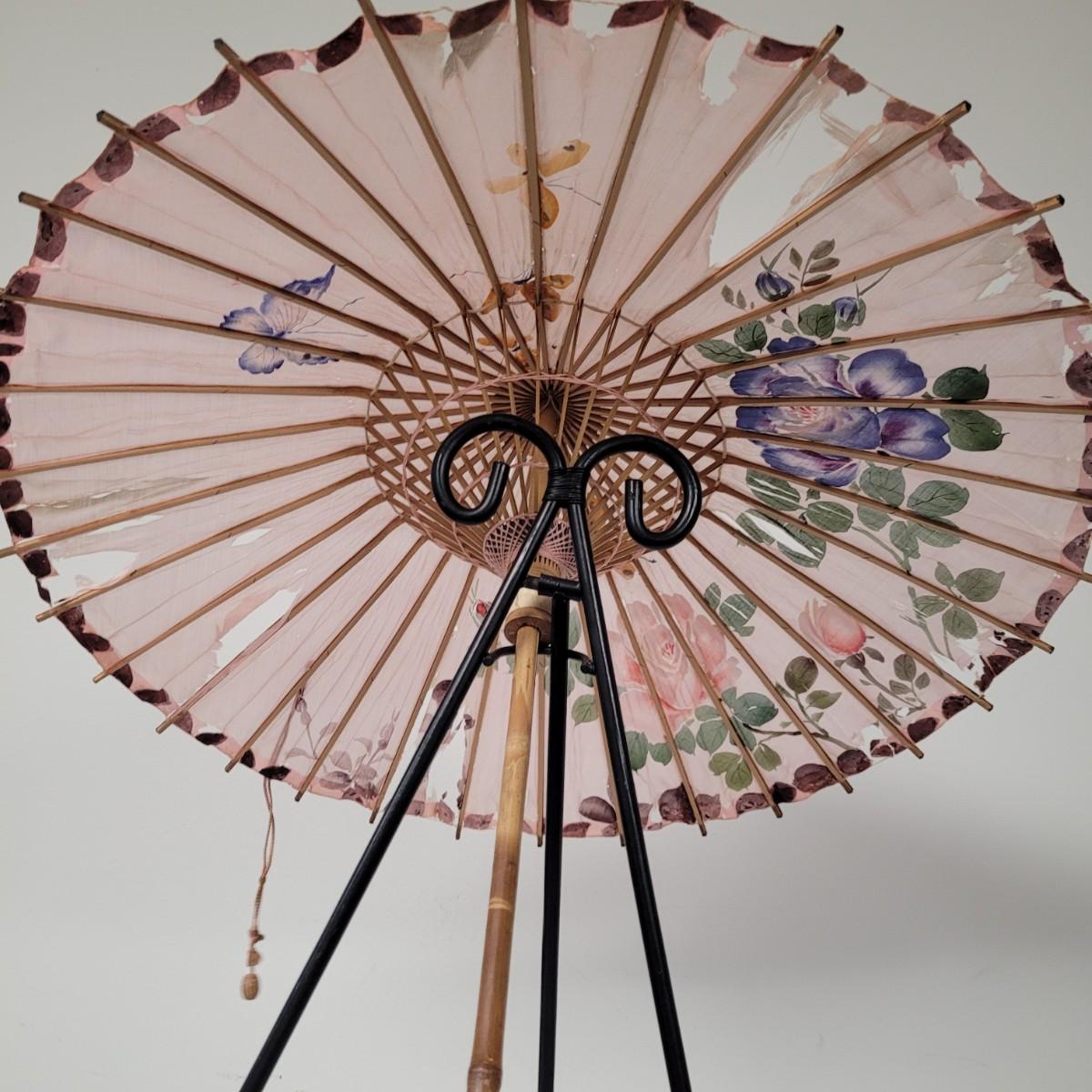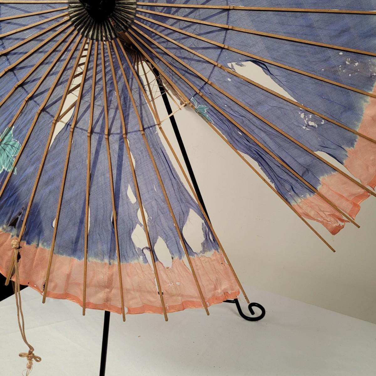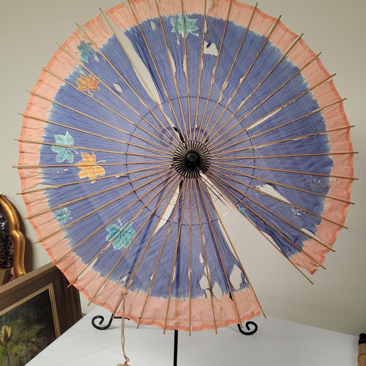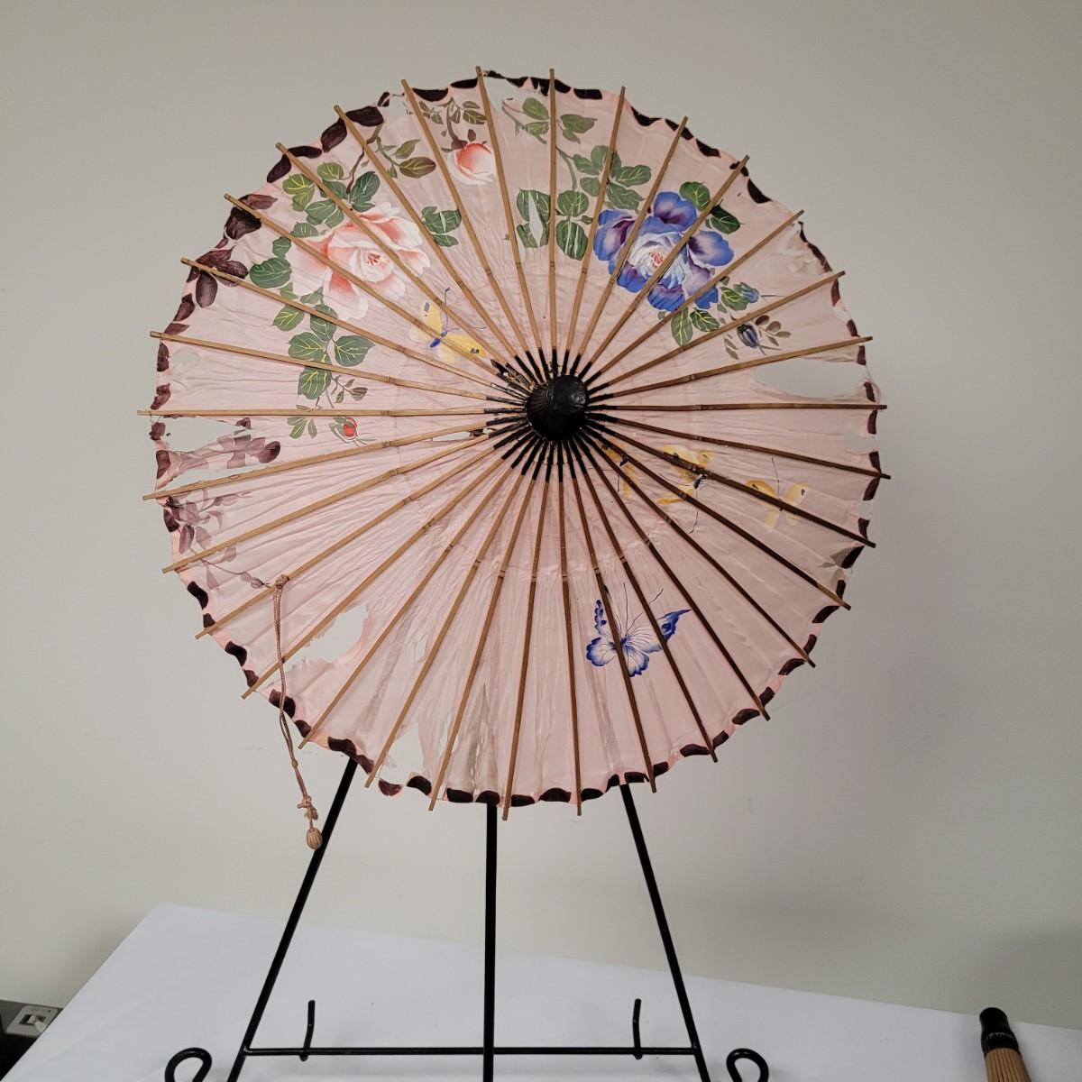 Three Asian parasols with what appears to be dyed silk with painted floral designs. Levers to hold shades open do function when tested. Items in fair condition with extensive deterioration of silk (see photos). Largest parasol measures approximately 29.5"L from end to end when closed, open shade 30"DIA. Display stand not included. Shipping available.
