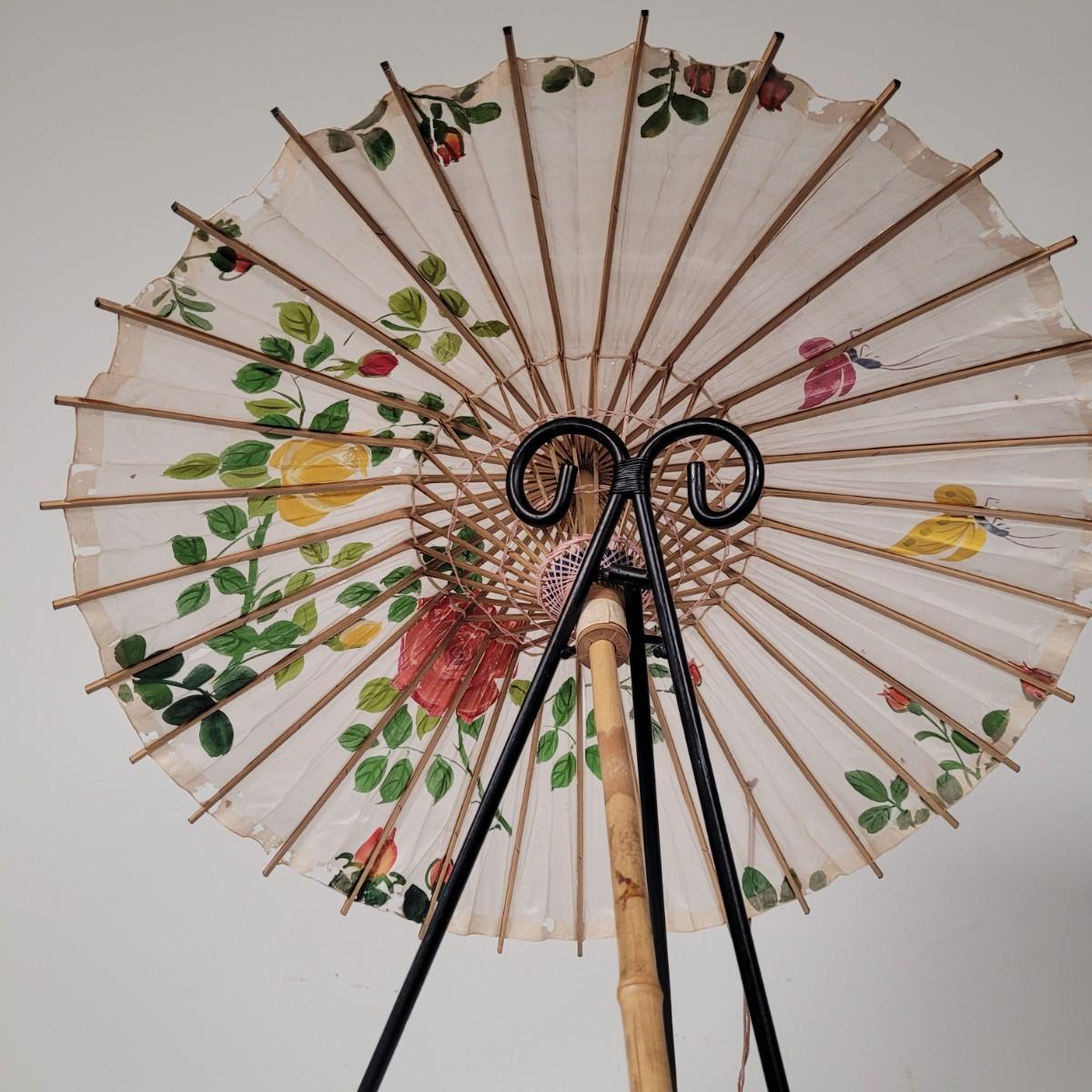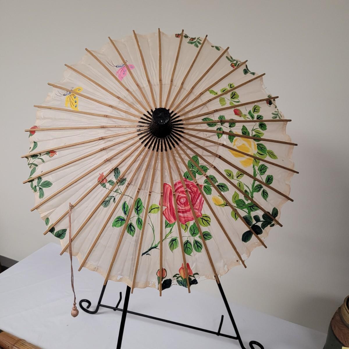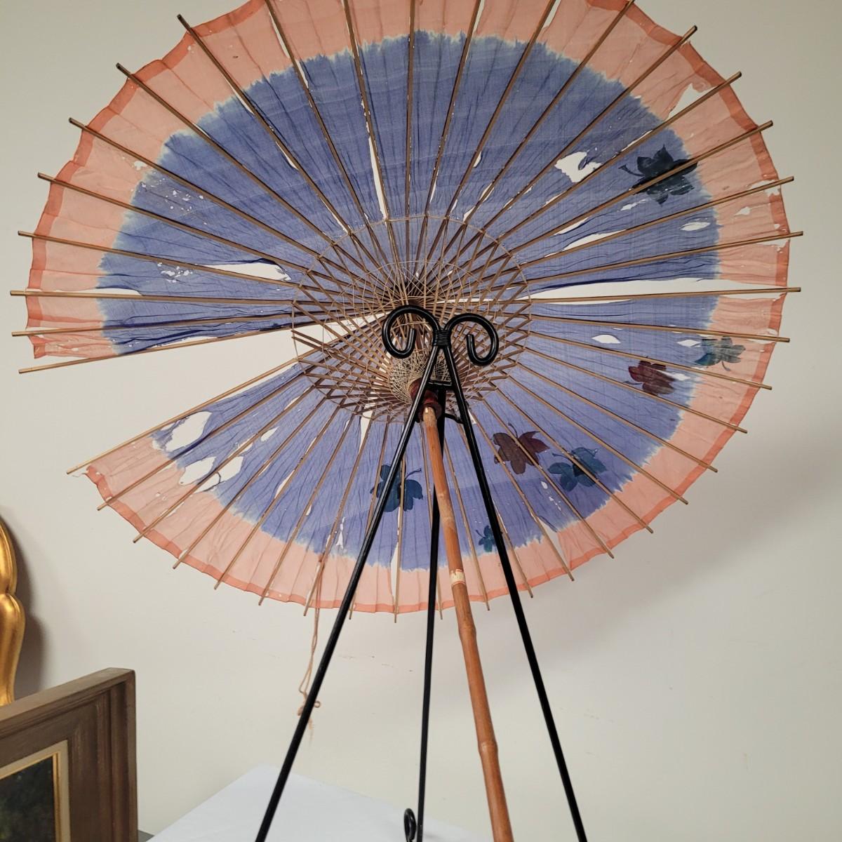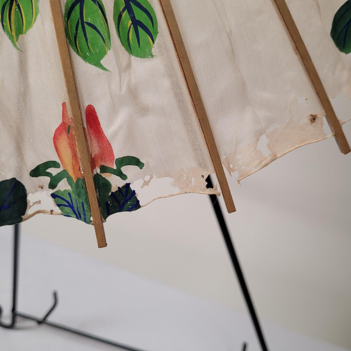 Three Asian parasols with what appears to be dyed silk with painted floral designs. Levers to hold shades open do function when tested. Items in fair condition with extensive deterioration of silk (see photos). Largest parasol measures approximately 29.5"L from end to end when closed, open shade 30"DIA. Display stand not included. Shipping available.