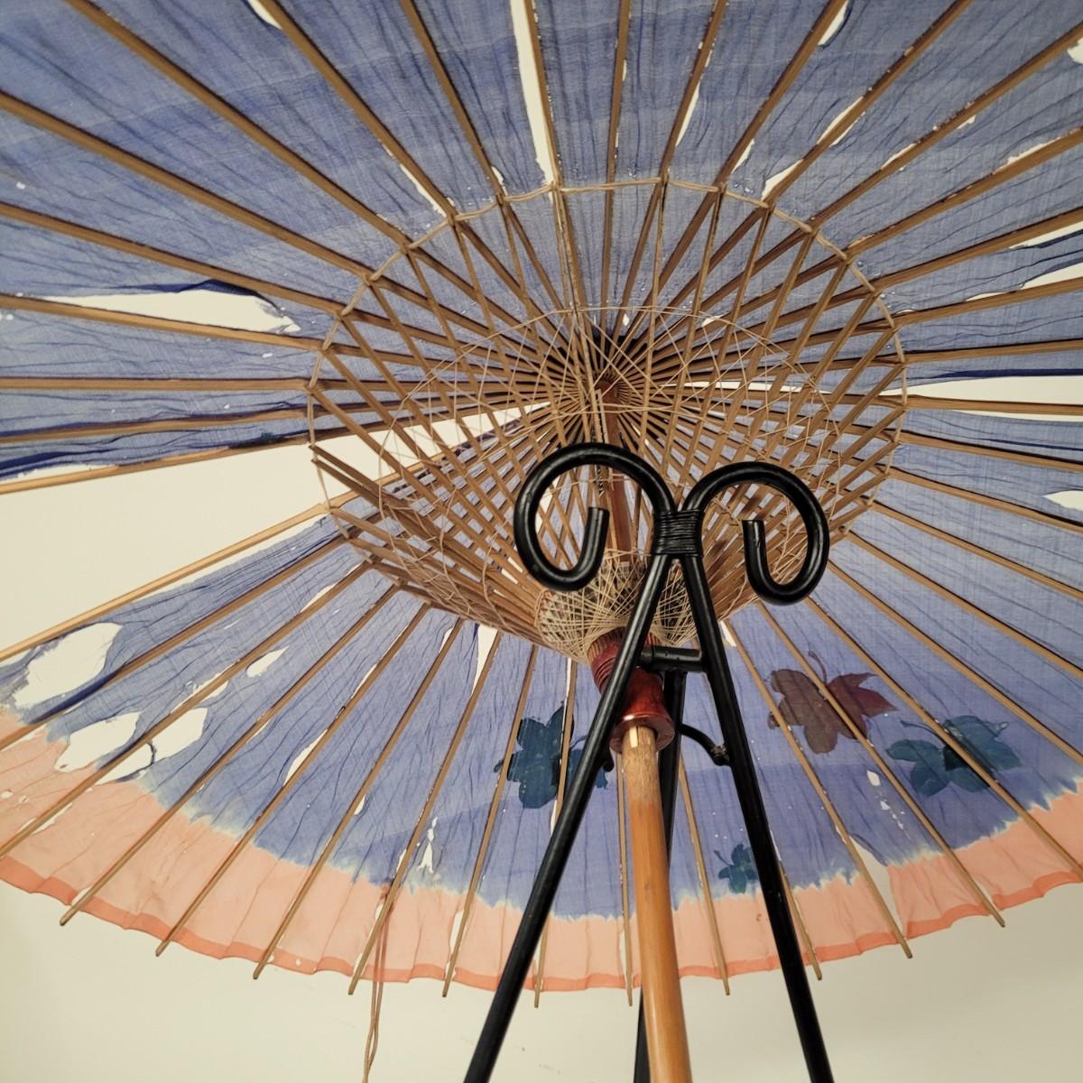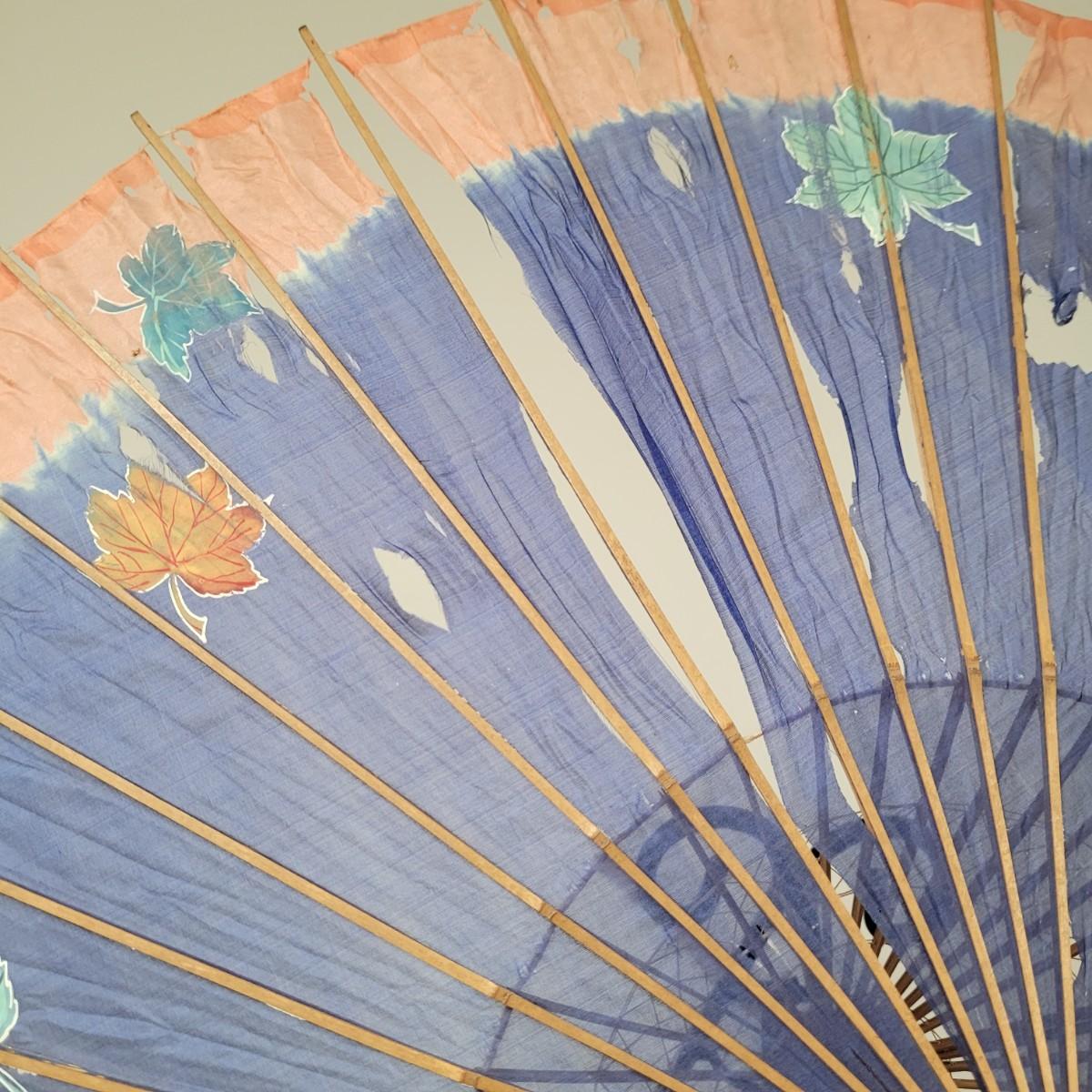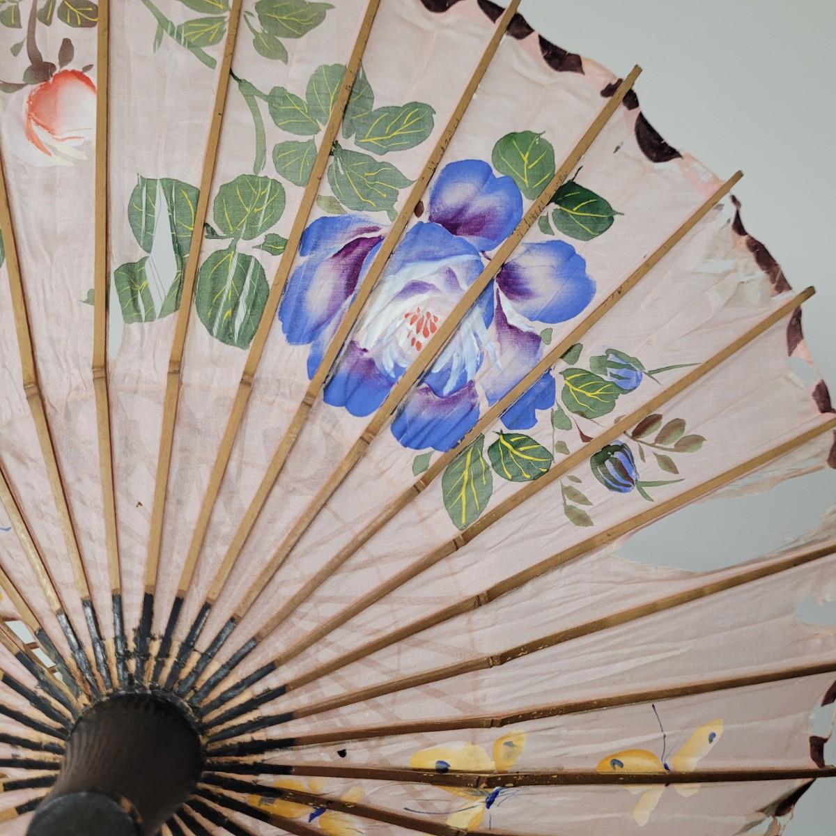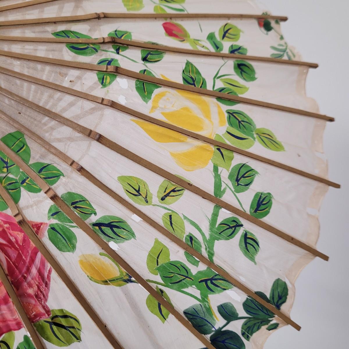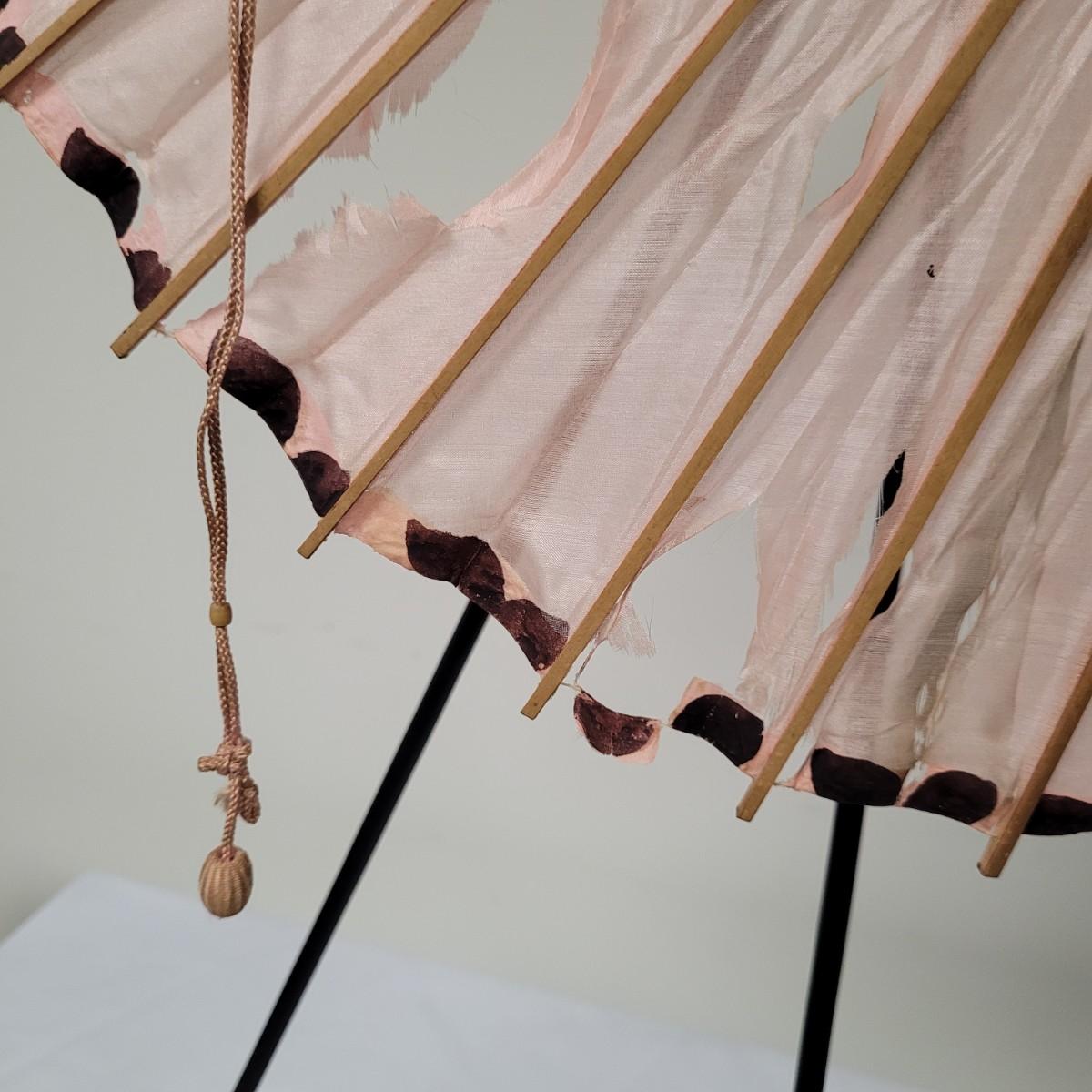 Three Asian parasols with what appears to be dyed silk with painted floral designs. Levers to hold shades open do function when tested. Items in fair condition with extensive deterioration of silk (see photos). Largest parasol measures approximately 29.5"L from end to end when closed, open shade 30"DIA. Display stand not included. Shipping available.