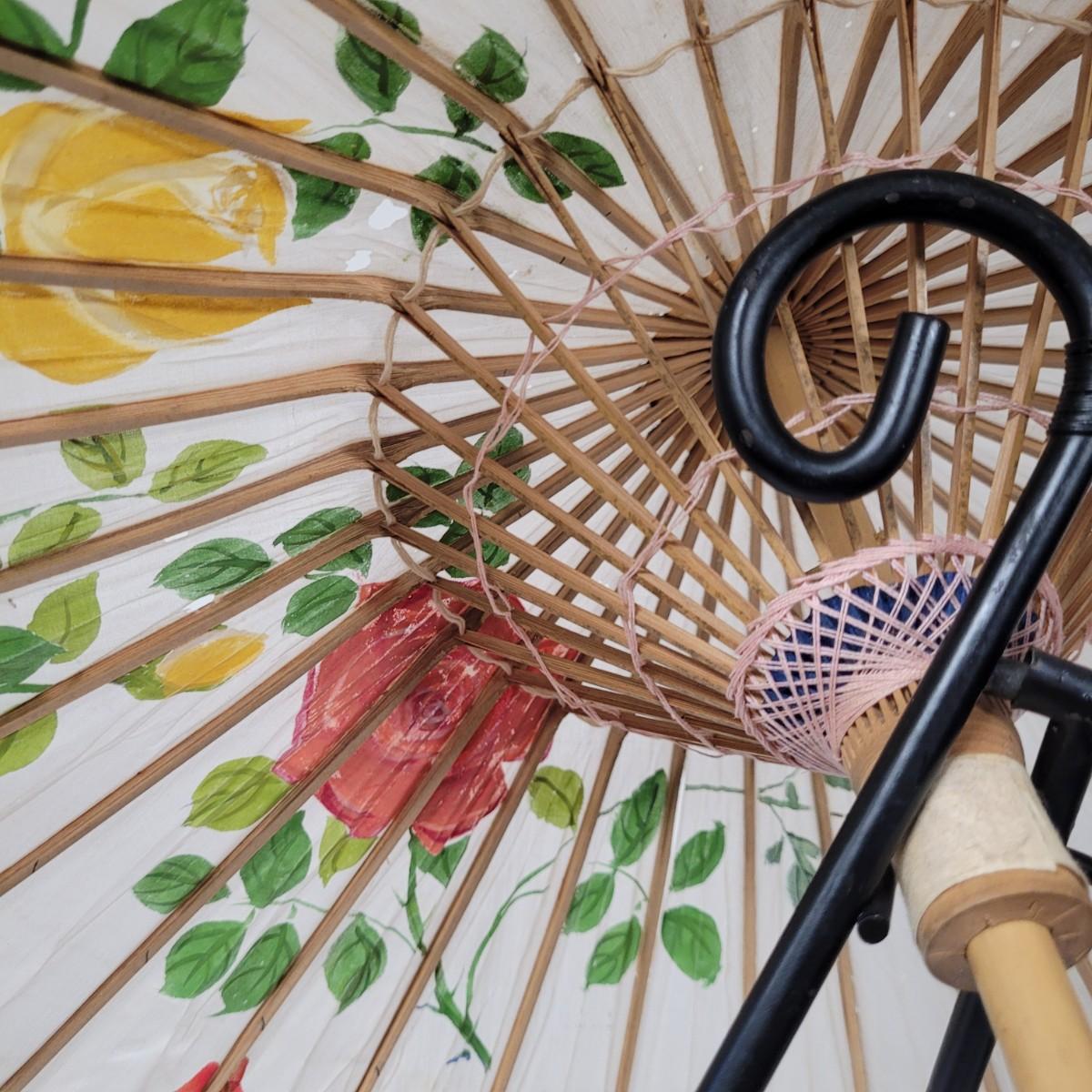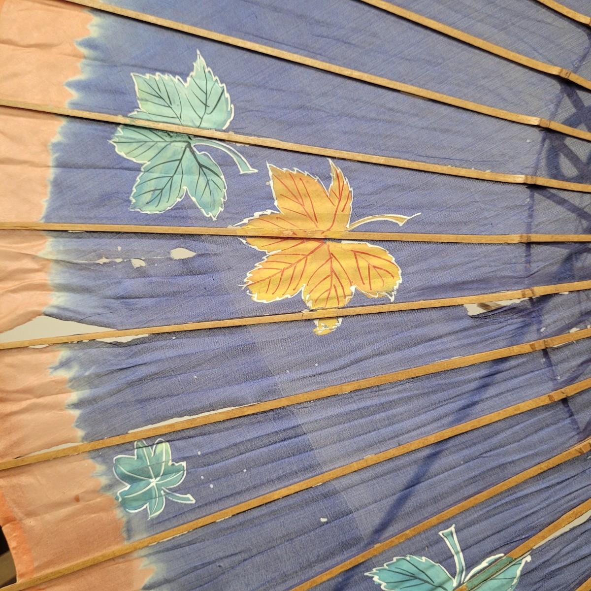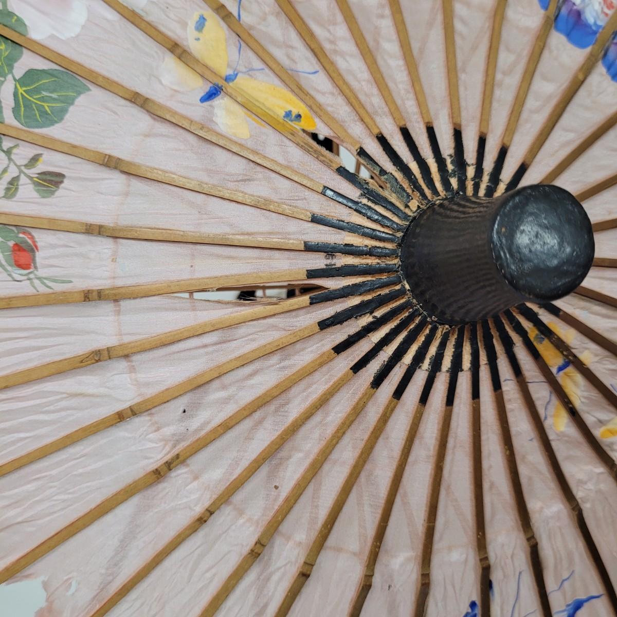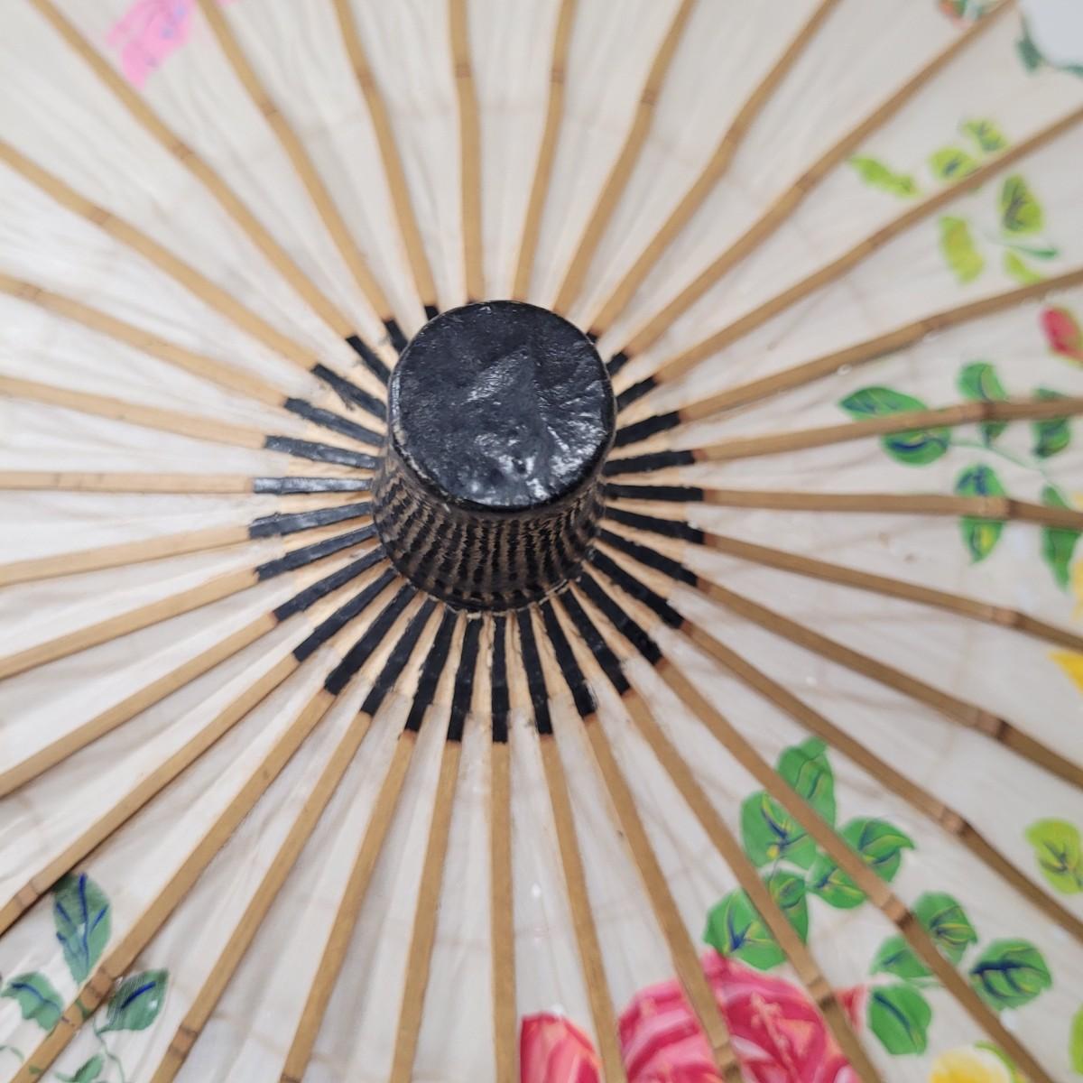 Three Asian parasols with what appears to be dyed silk with painted floral designs. Levers to hold shades open do function when tested. Items in fair condition with extensive deterioration of silk (see photos). Largest parasol measures approximately 29.5"L from end to end when closed, open shade 30"DIA. Display stand not included. Shipping available.