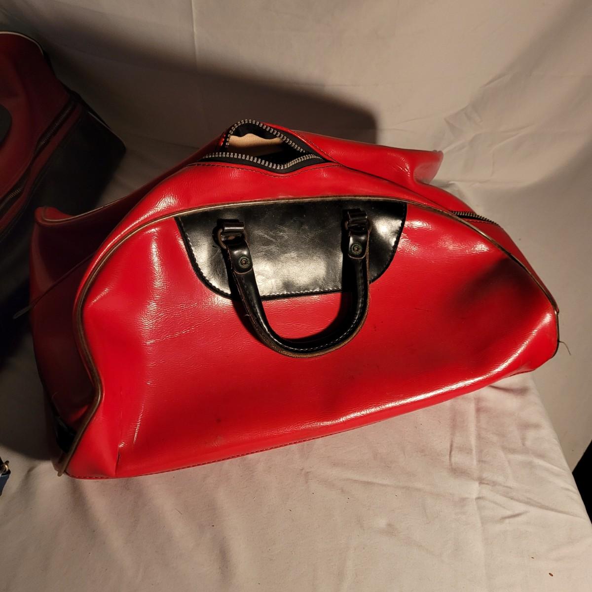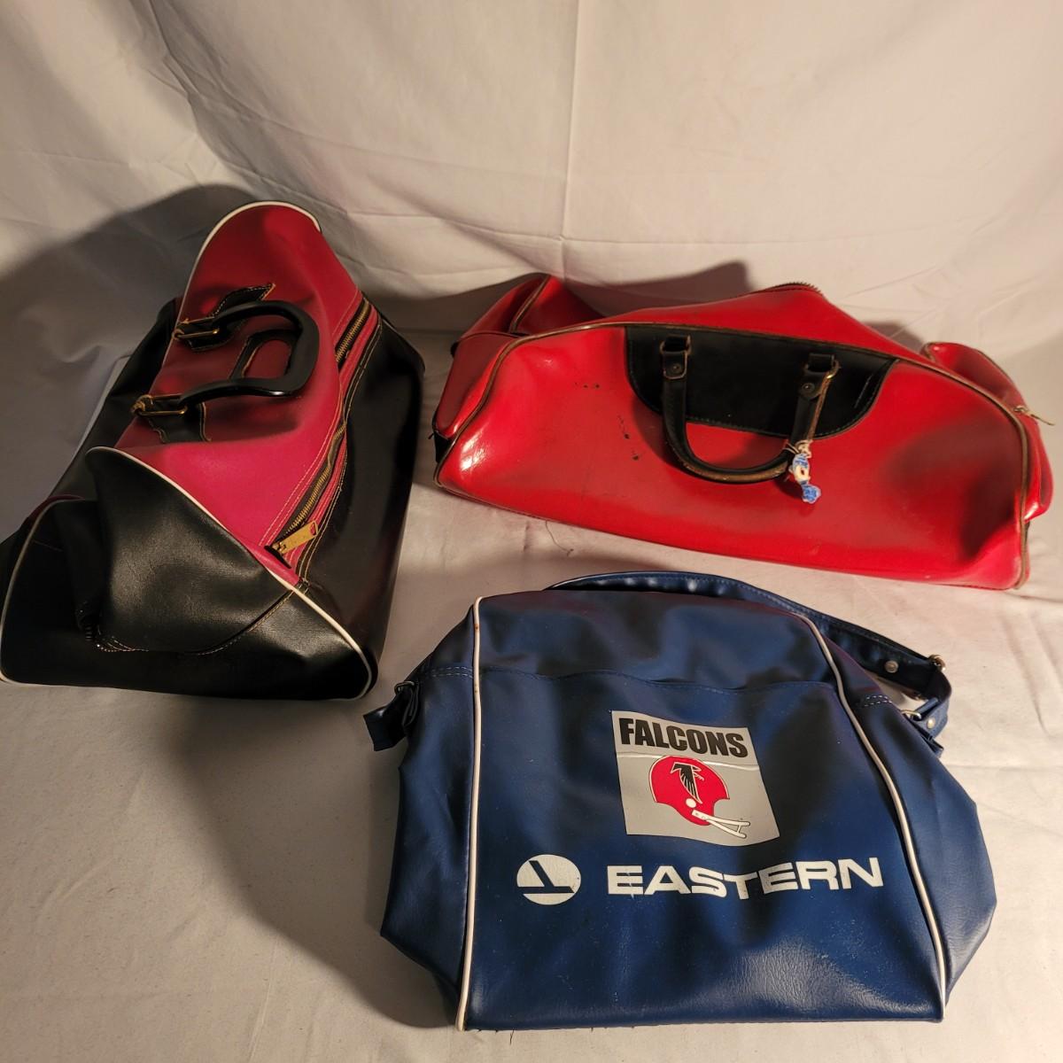 Set of three vintage bowling bags. Appear to be made of vinyl. Zippers work on all bags. Spalding bag has loose stitching at zipper at top of bag. Bags are generally clean with some marks and scuffs (see pictures). For reference, Spalding bag measures approximately 19"L x10.5"D x11"H. Shipping available.