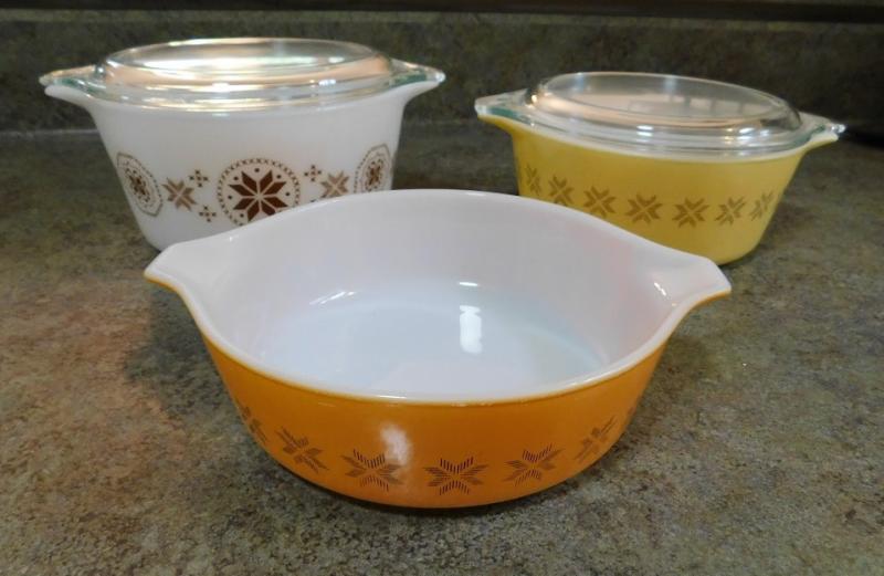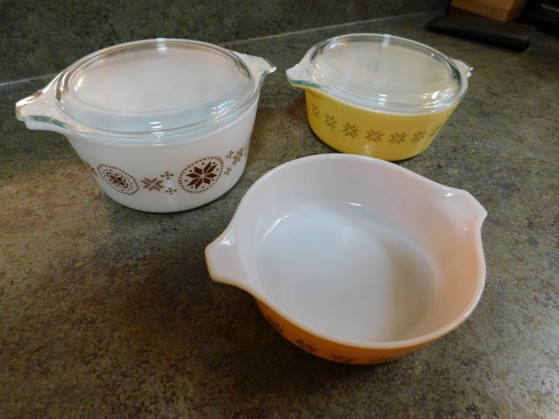 Set of Three Vintage Color Pyrex Baking Dishes may have some wear on exterior