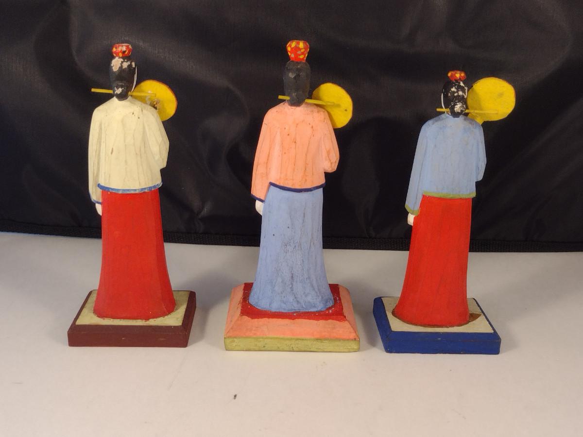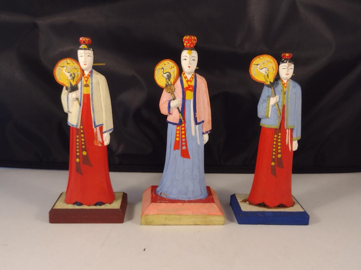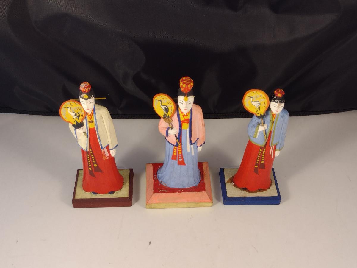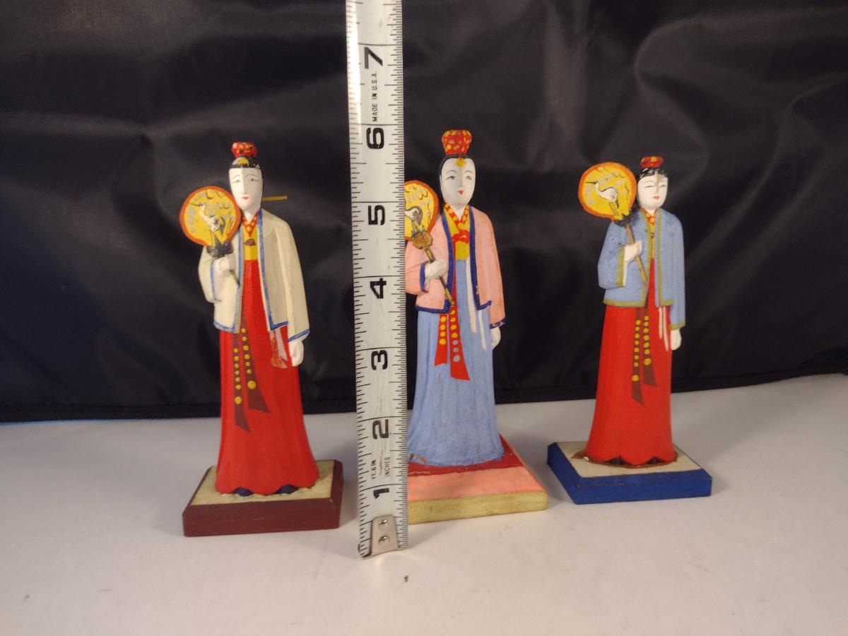 Set of Three Vintage Hand Made Japanese Dolls. Items have some wear to finish/missing paint- please see all pictures for condition.