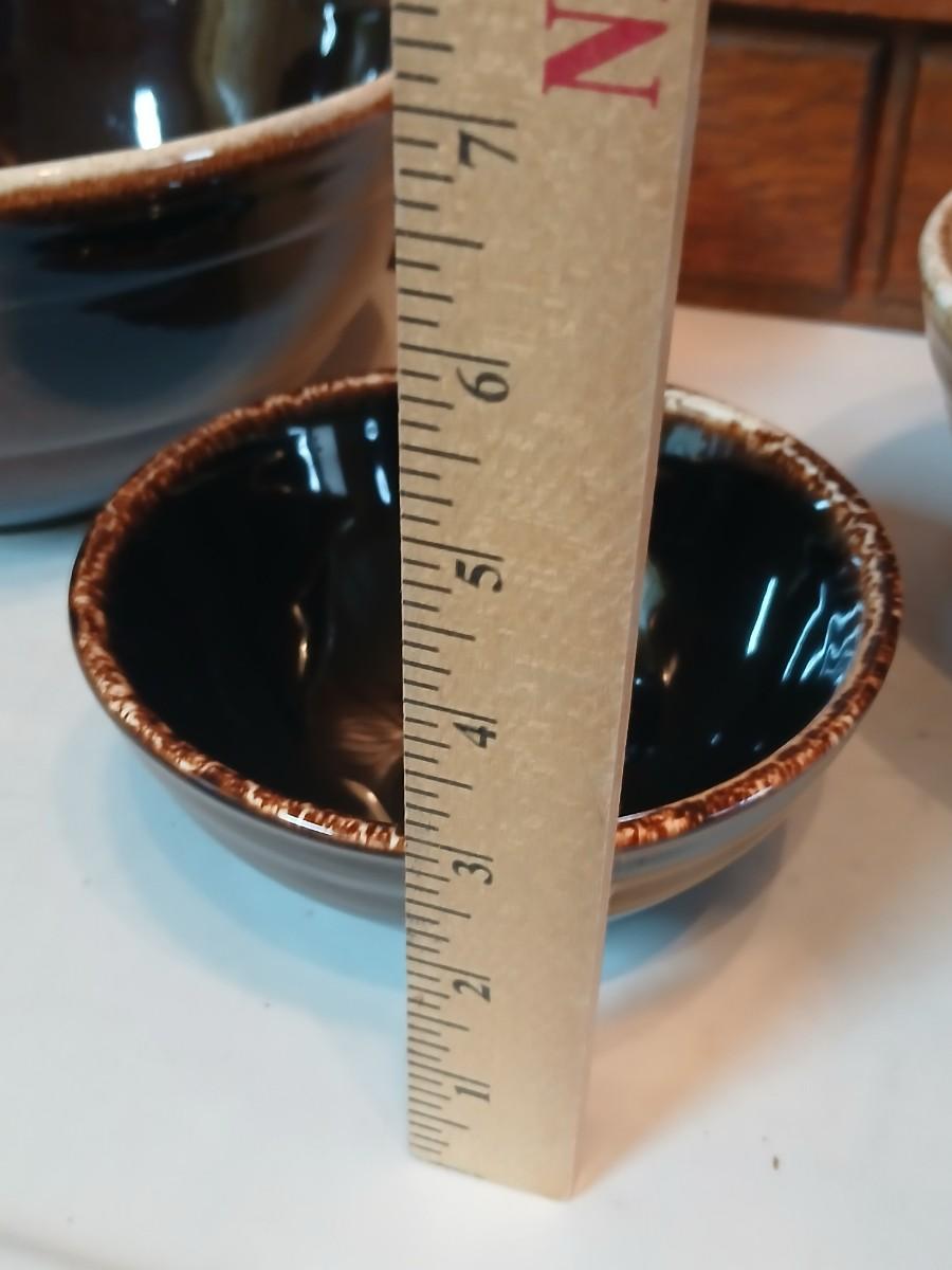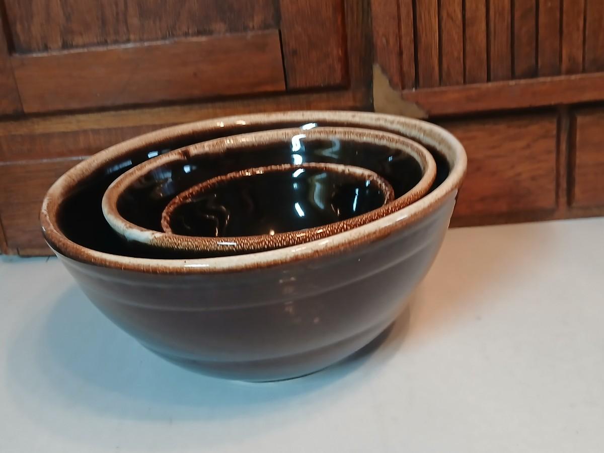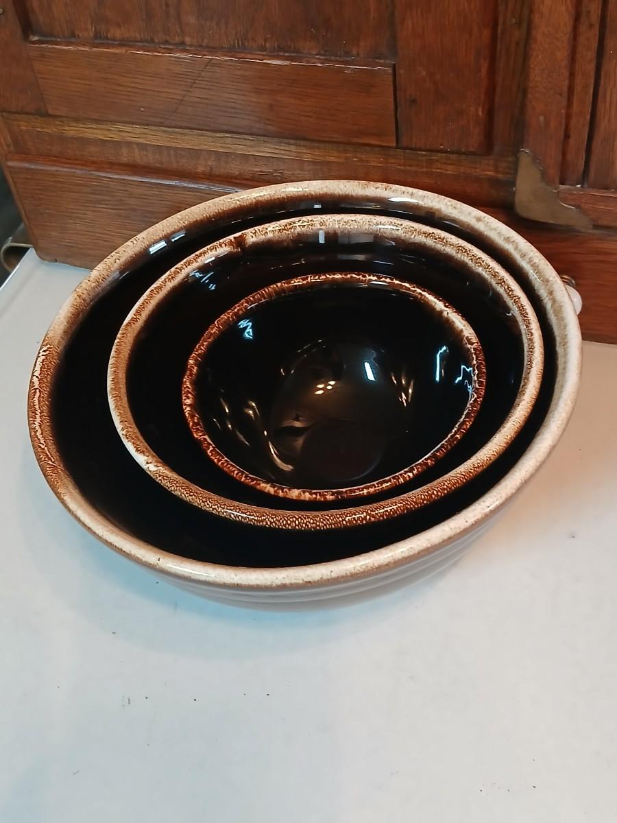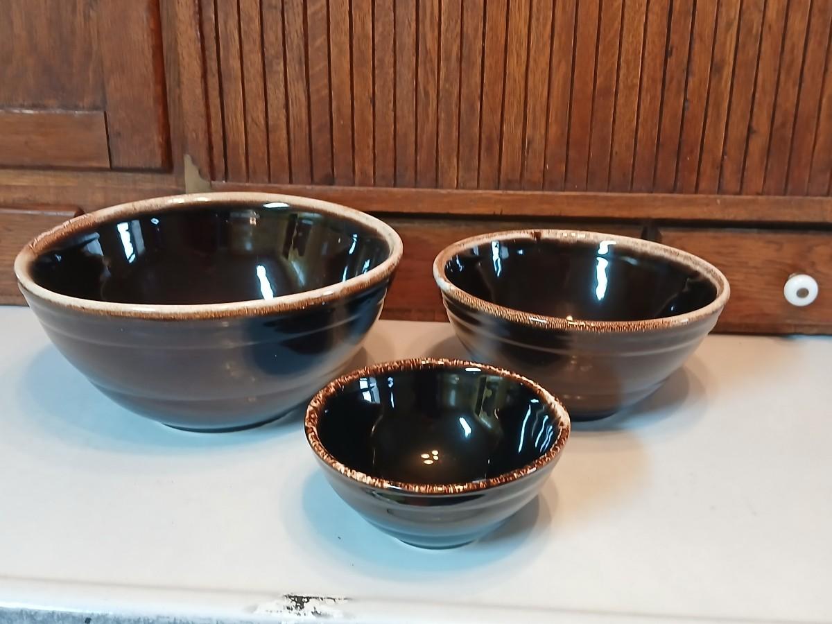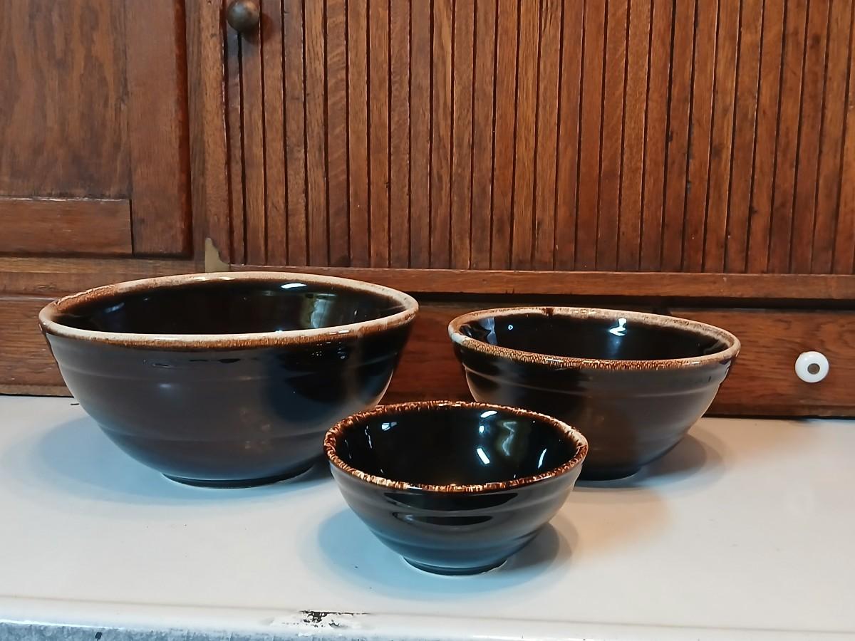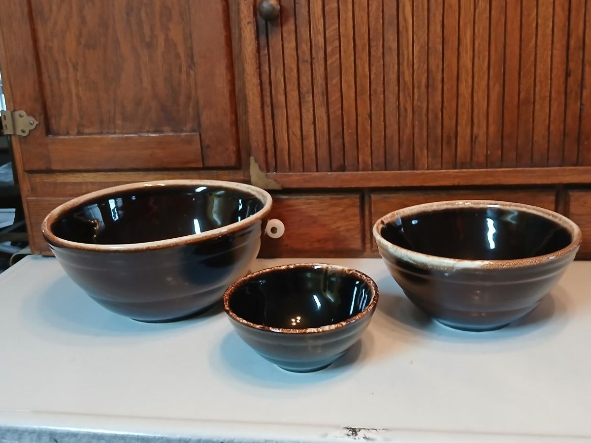 Set of three vintage- Nesting glazed brown stoneware drip edge bowls