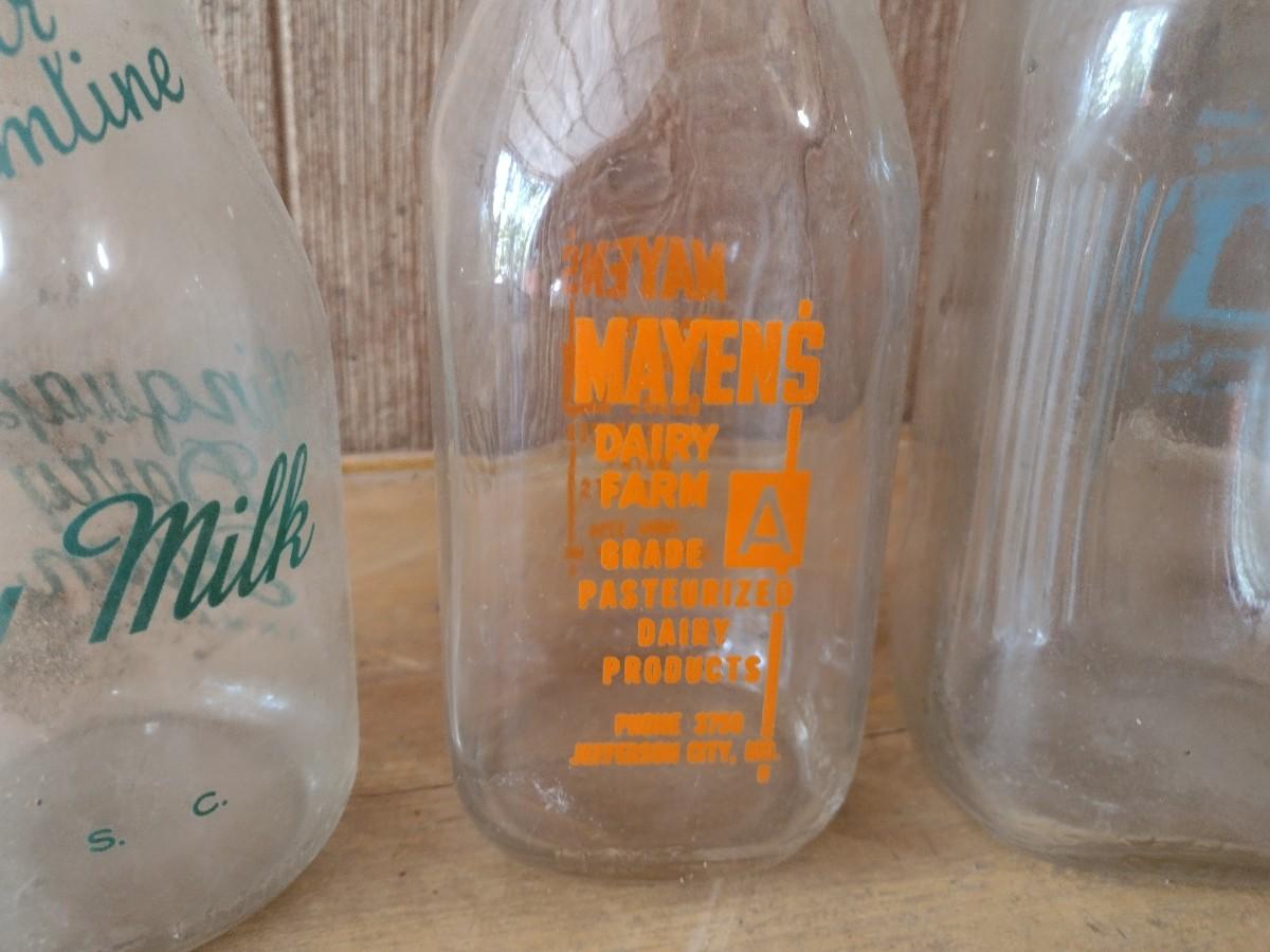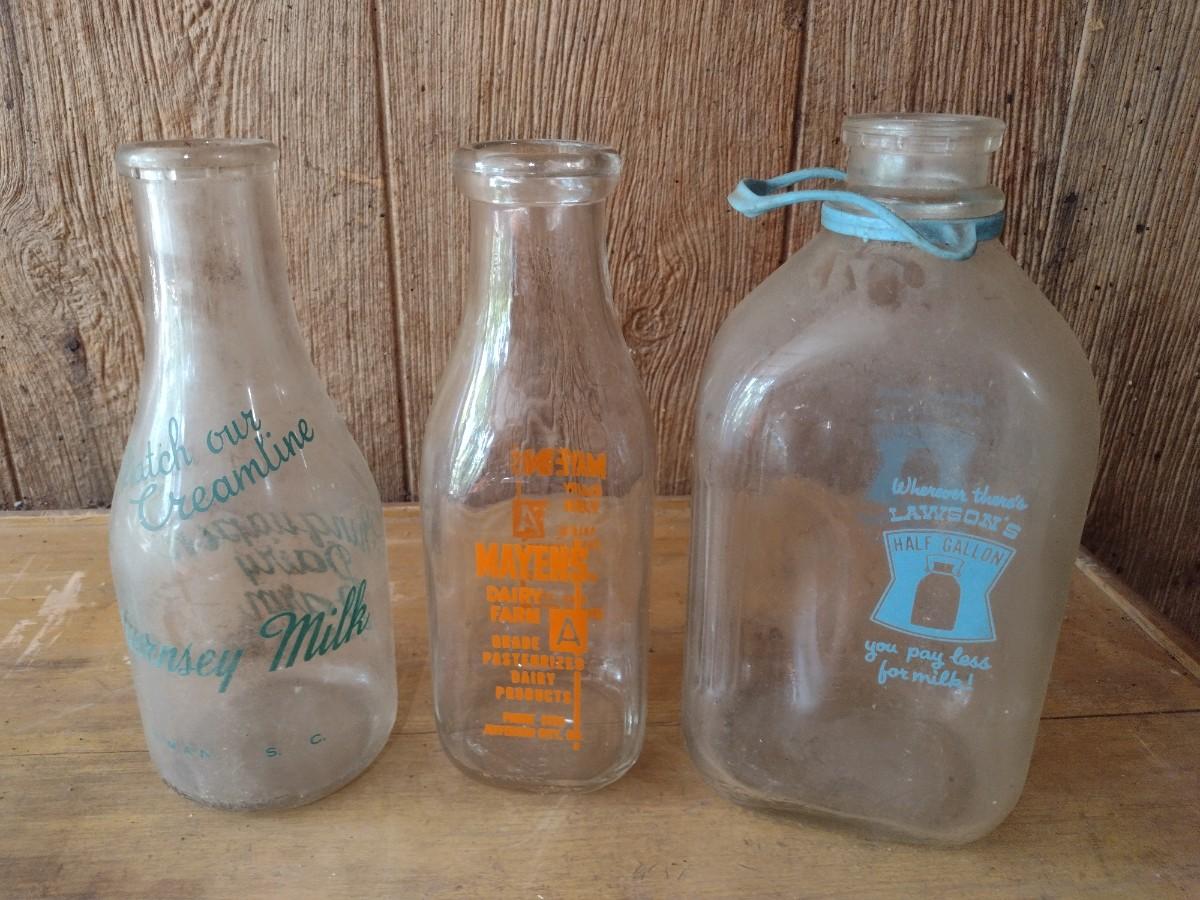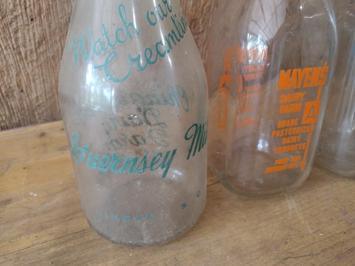 Set of Three Vintage Painted Dairy Glass Milk Bottles Lawson's, Mayen's Dairy and Chinquapin Dairy Tryon, NC (#3)
