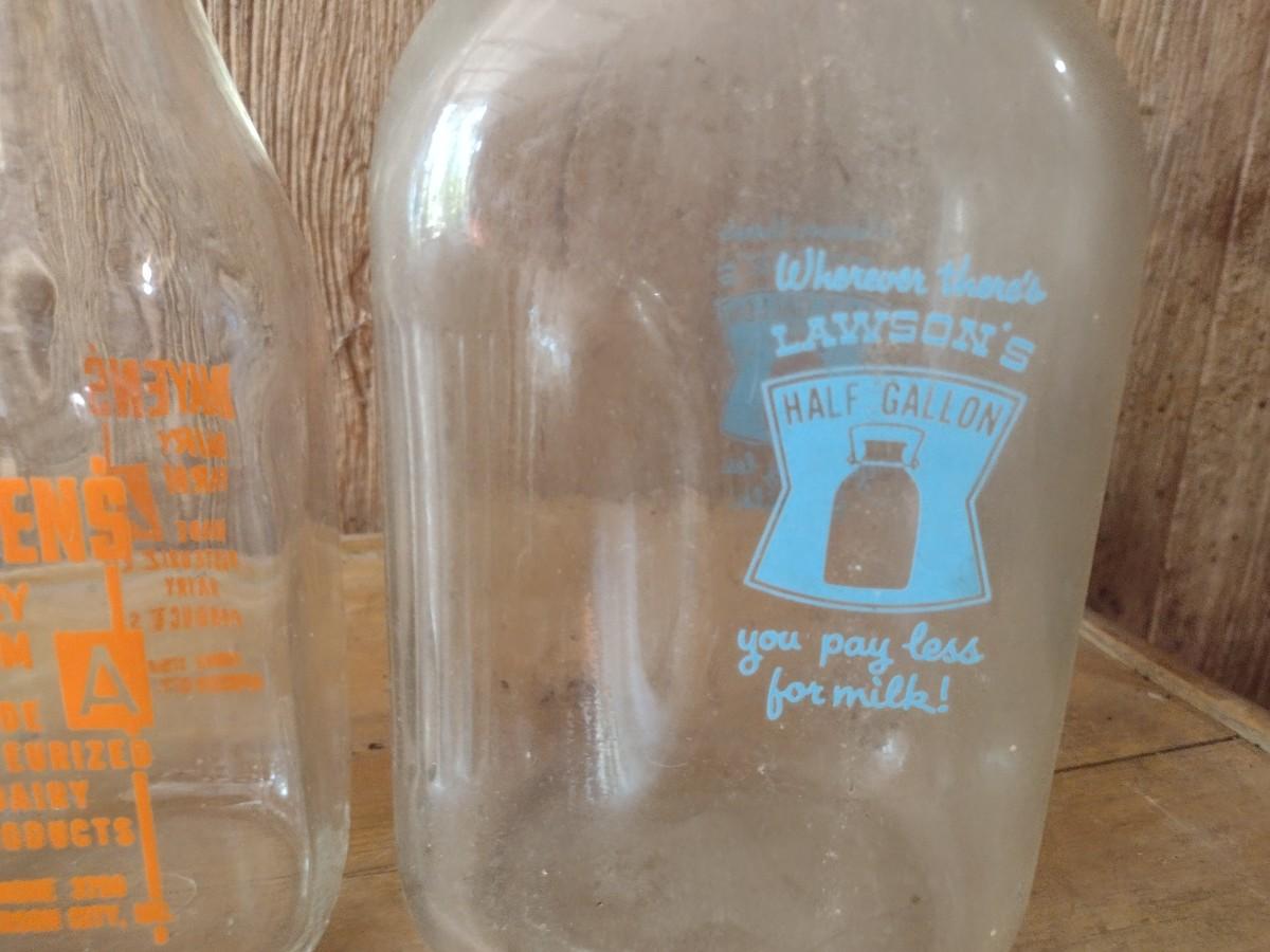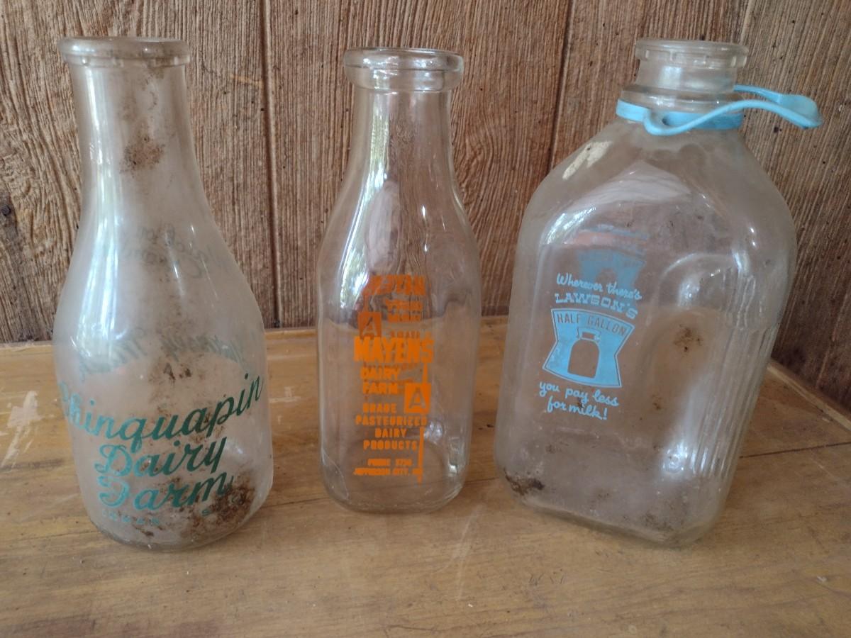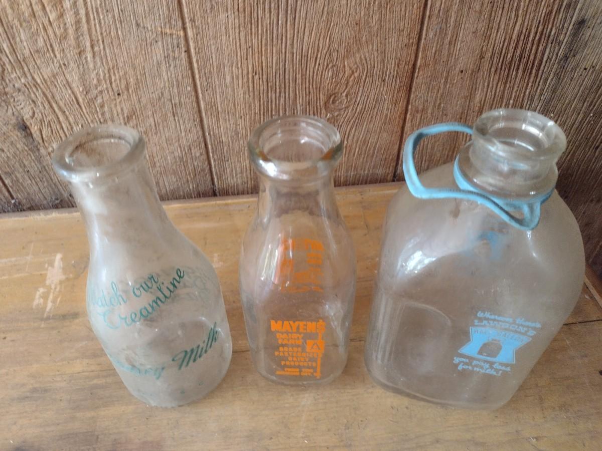 Set of Three Vintage Painted Dairy Glass Milk Bottles Lawson's, Mayen's Dairy and Chinquapin Dairy Tryon, NC (#3)