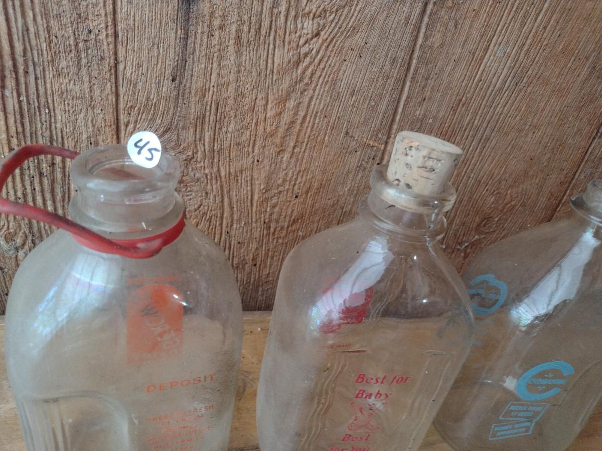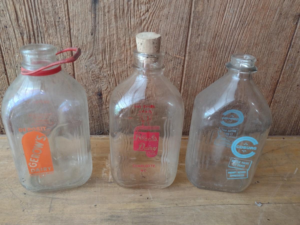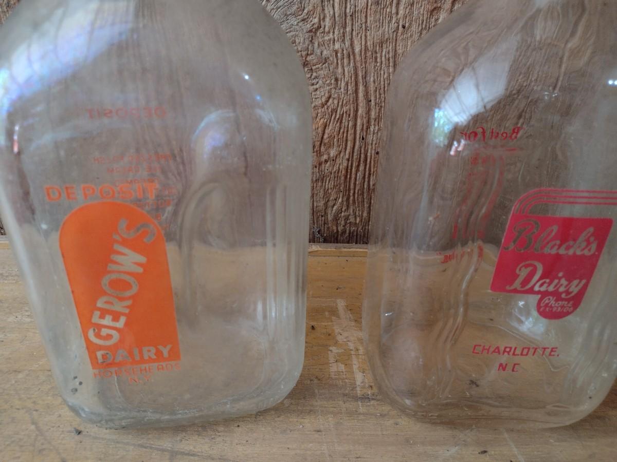 Set of Three Vintage Painted Logo Dairy Glass Half Gallon Milk Bottles Gerow's Dairy, Black's Dairy and Coburg (#45)