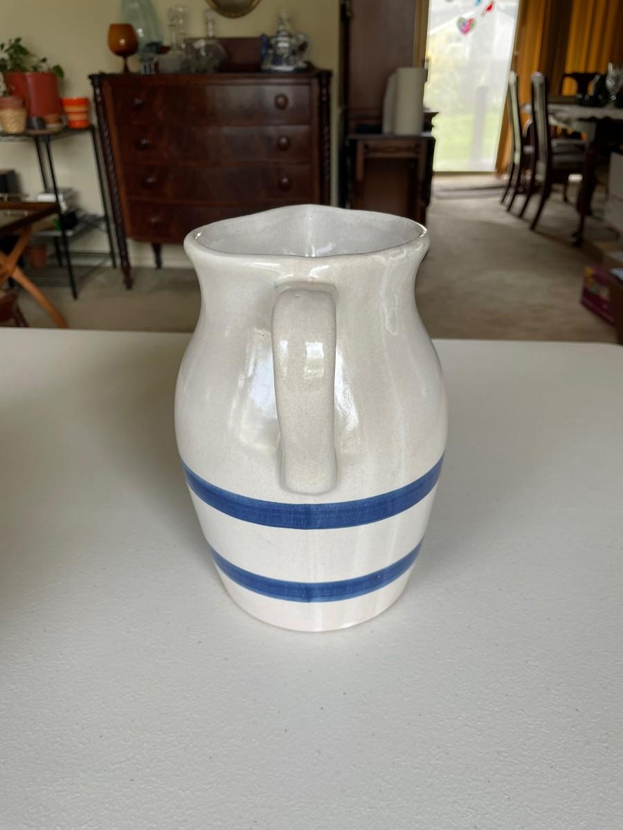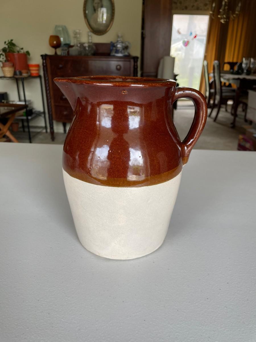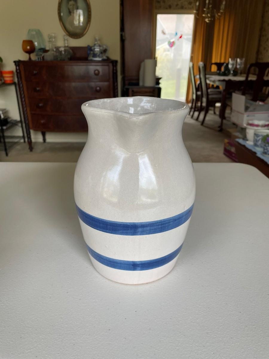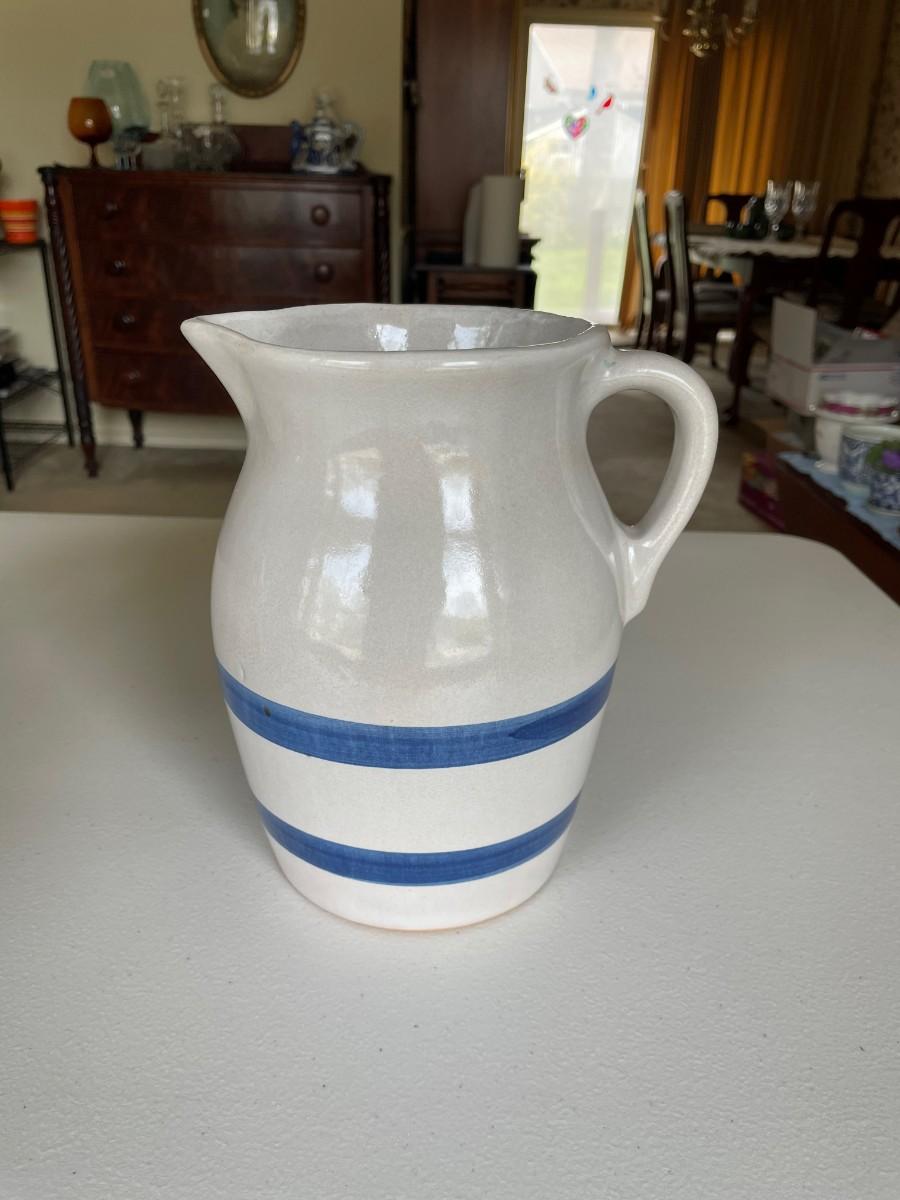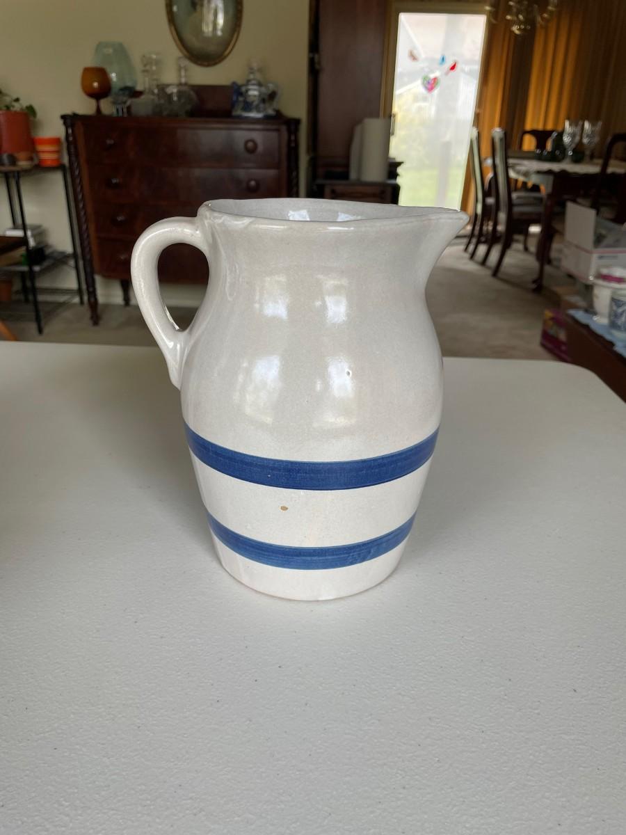 Salt Glazed Stoneware Pitcher Brown: 8 1/2(h) x 5 1/2. In excellent condition. Stoneware Pottery Pitcher with two blue bands: 8 1/2 x 5 1/2. Green 6 1/2(h) x 5.