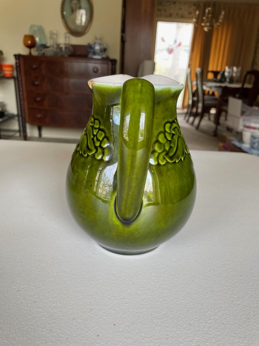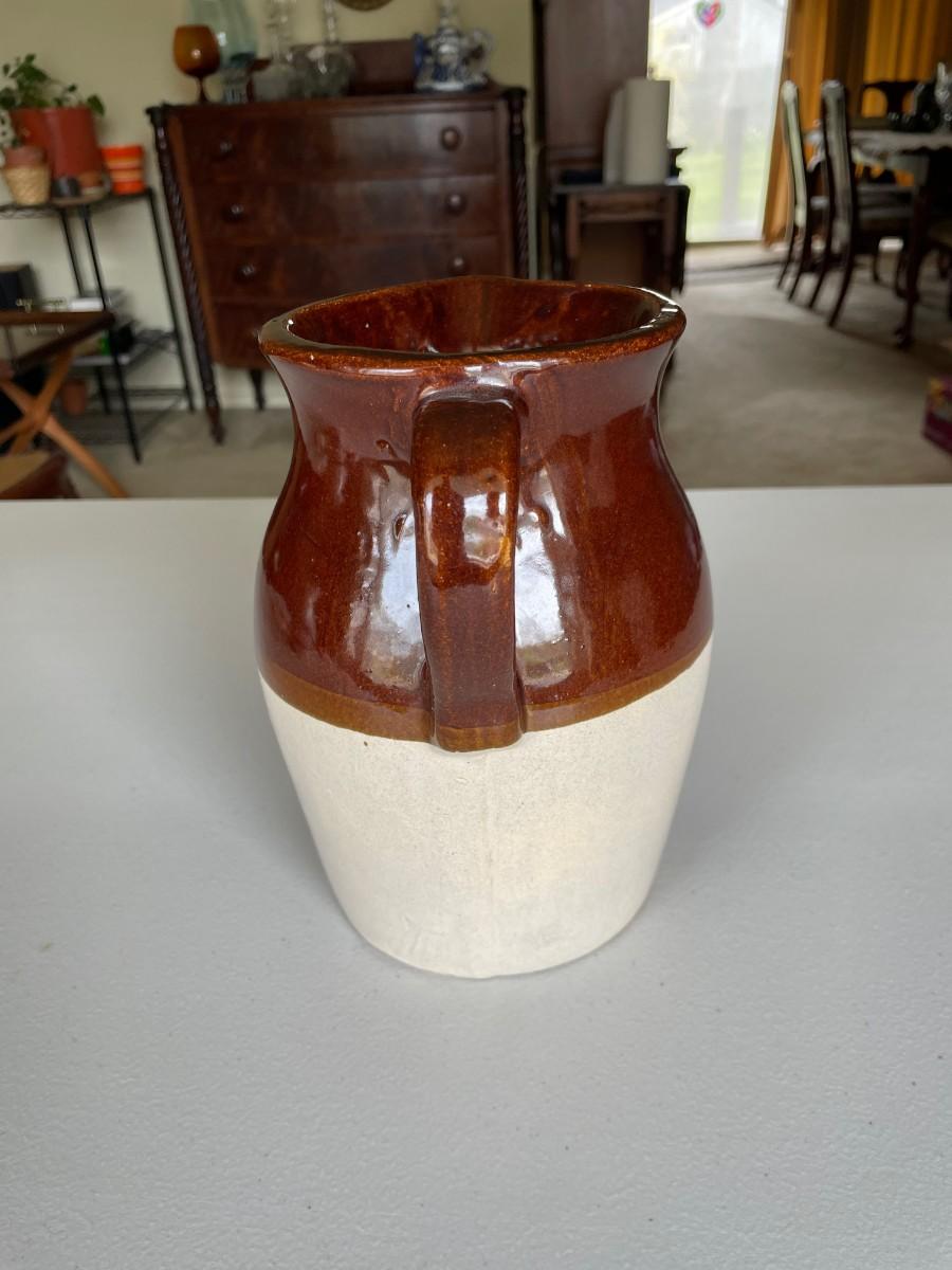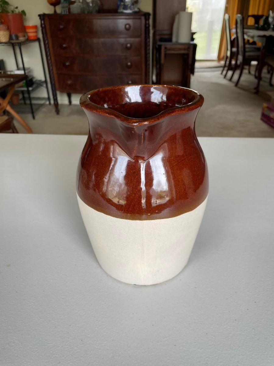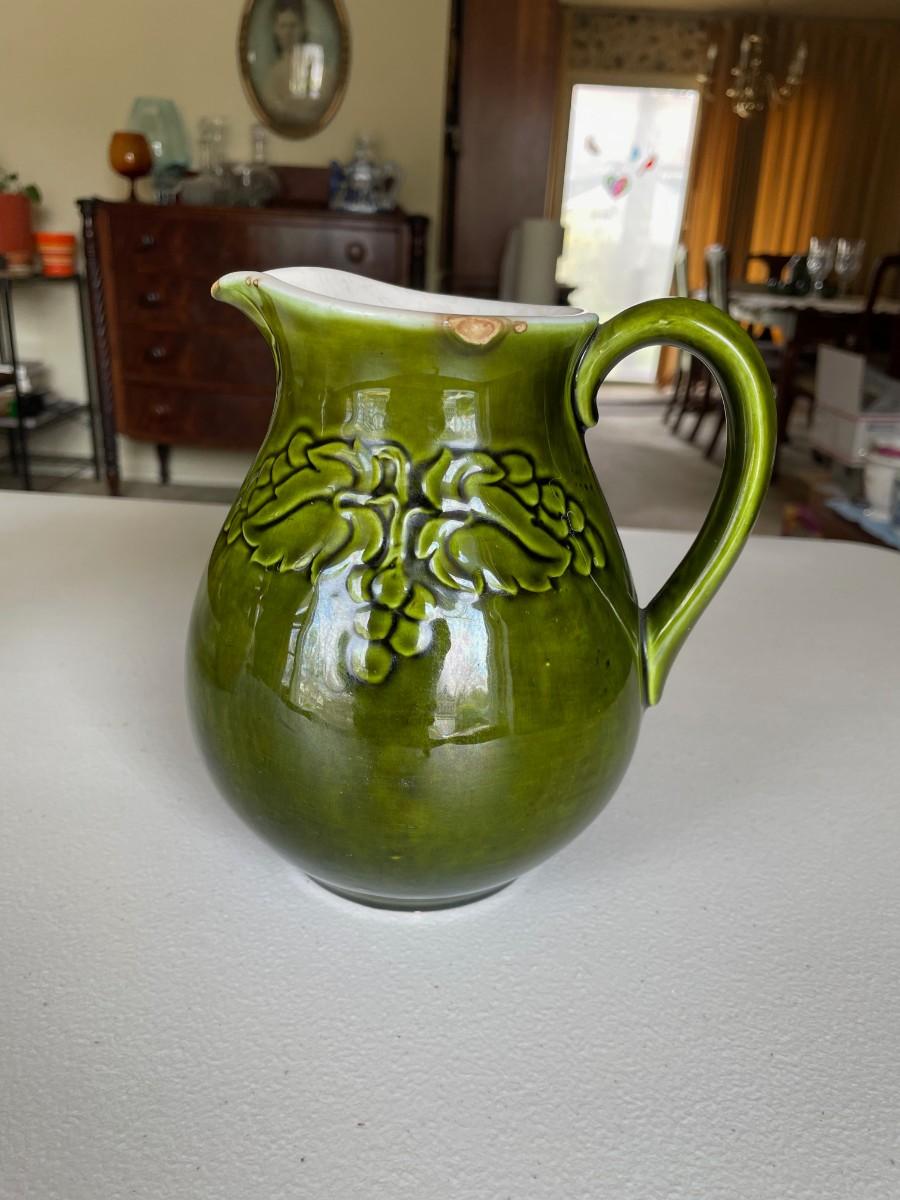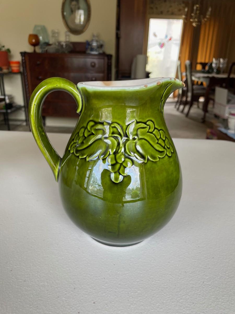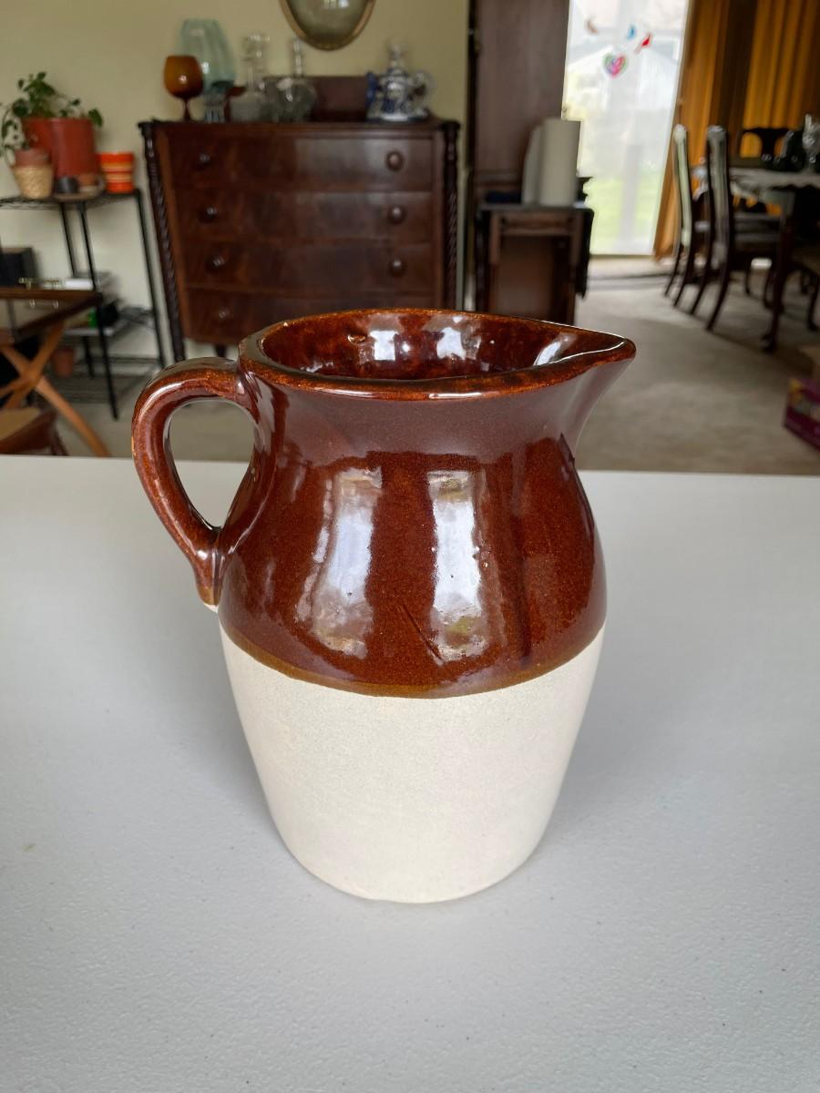 Salt Glazed Stoneware Pitcher Brown: 8 1/2(h) x 5 1/2. In excellent condition. Stoneware Pottery Pitcher with two blue bands: 8 1/2 x 5 1/2. Green 6 1/2(h) x 5.