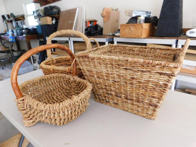 Set of Three Wicker Rattan Weave Baskets with Handles